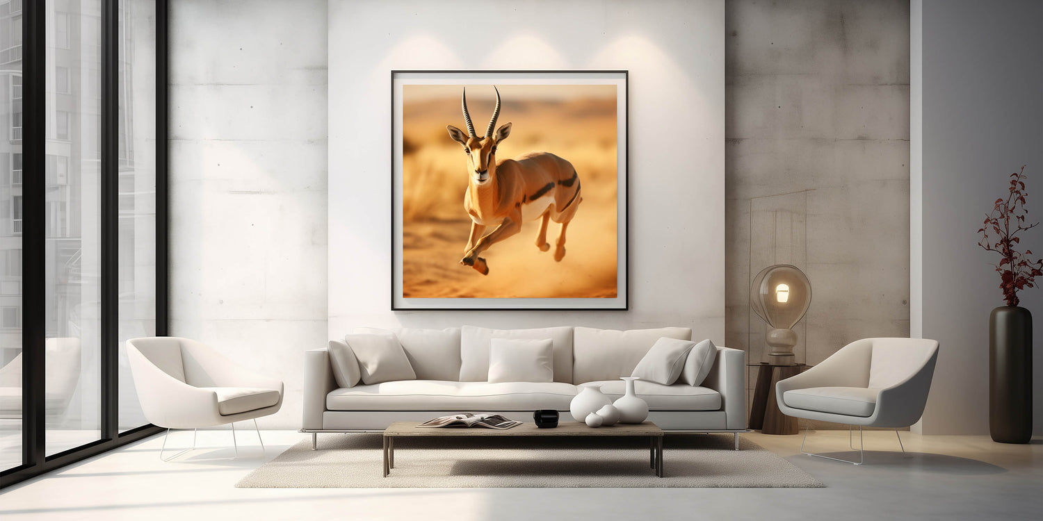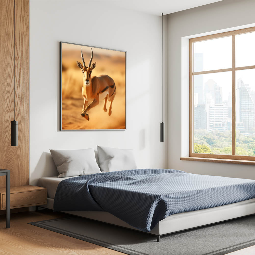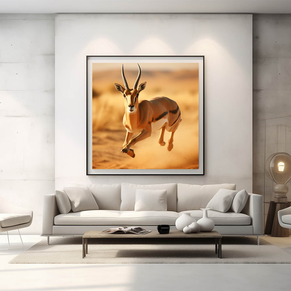 Infuse energy and movement into your space with this Dynamic Antelope in Motion wall art. This captivating piece captures the grace and agility of an antelope in full stride, its powerful form beautifully highlighted against the warm tones of the savannah. The sense of motion and the vivid details make this artwork an ideal choice for those who appreciate the beauty and dynamism of wildlife.