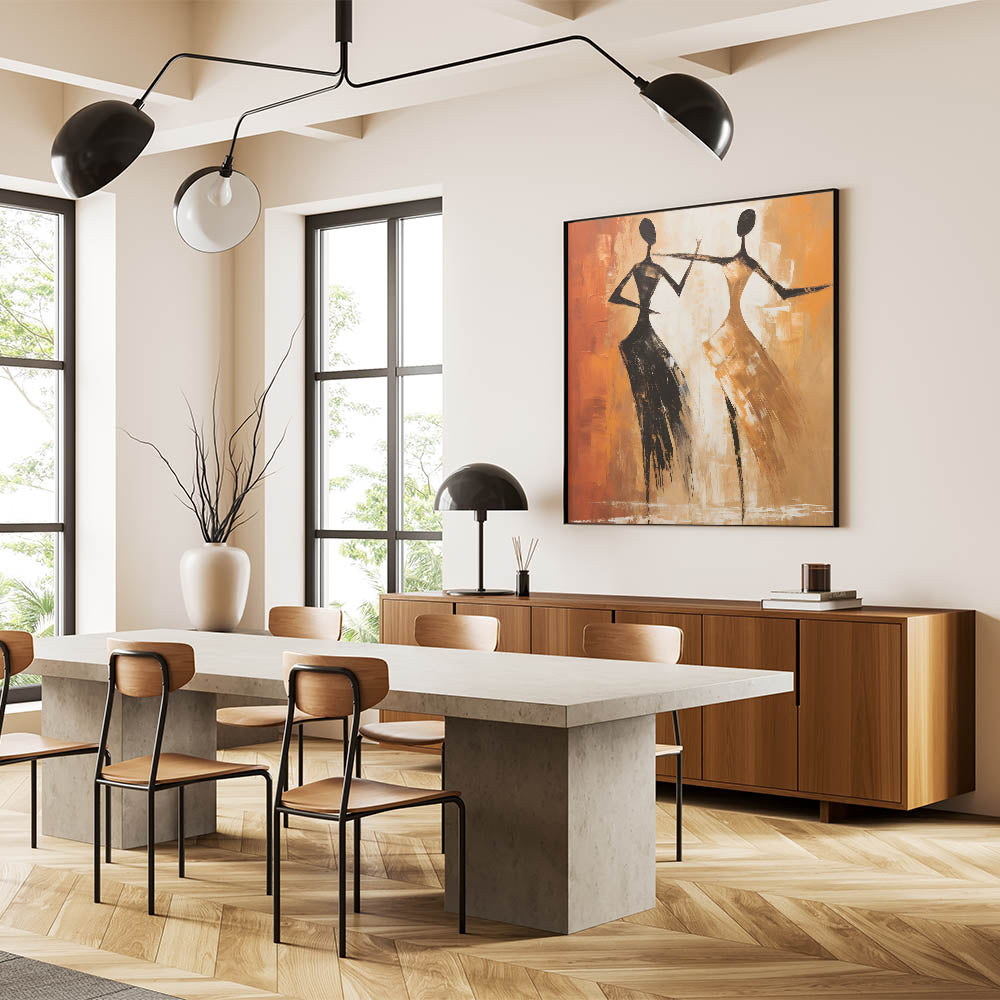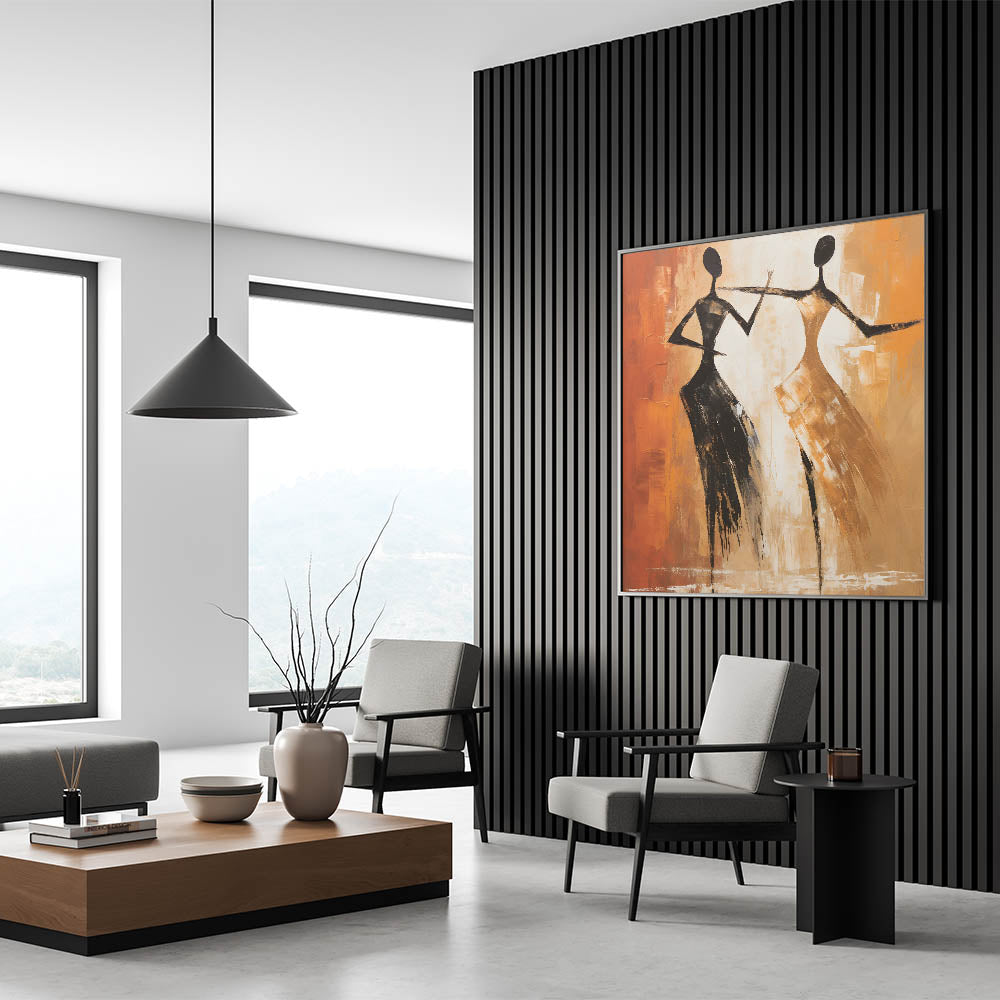 Infuse your home with the energy and movement of our Dynamic Dance Figurative Abstract Art. This stunning piece features two stylized human figures captured in mid-dance, with vibrant black and orange tones creating a visually striking composition. The dynamic poses and expressive brushstrokes add a sense of rhythm and vitality, making it a perfect addition to any contemporary interior.