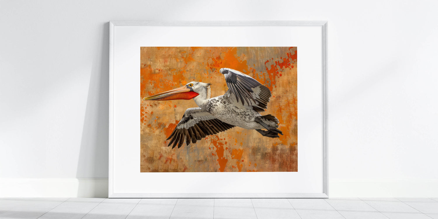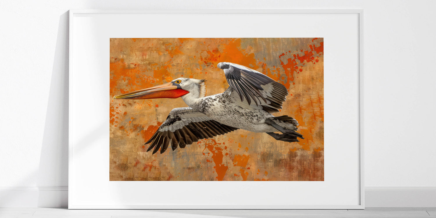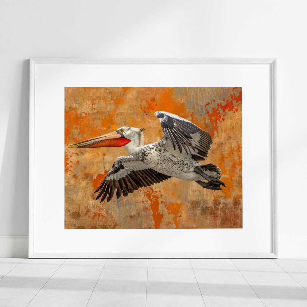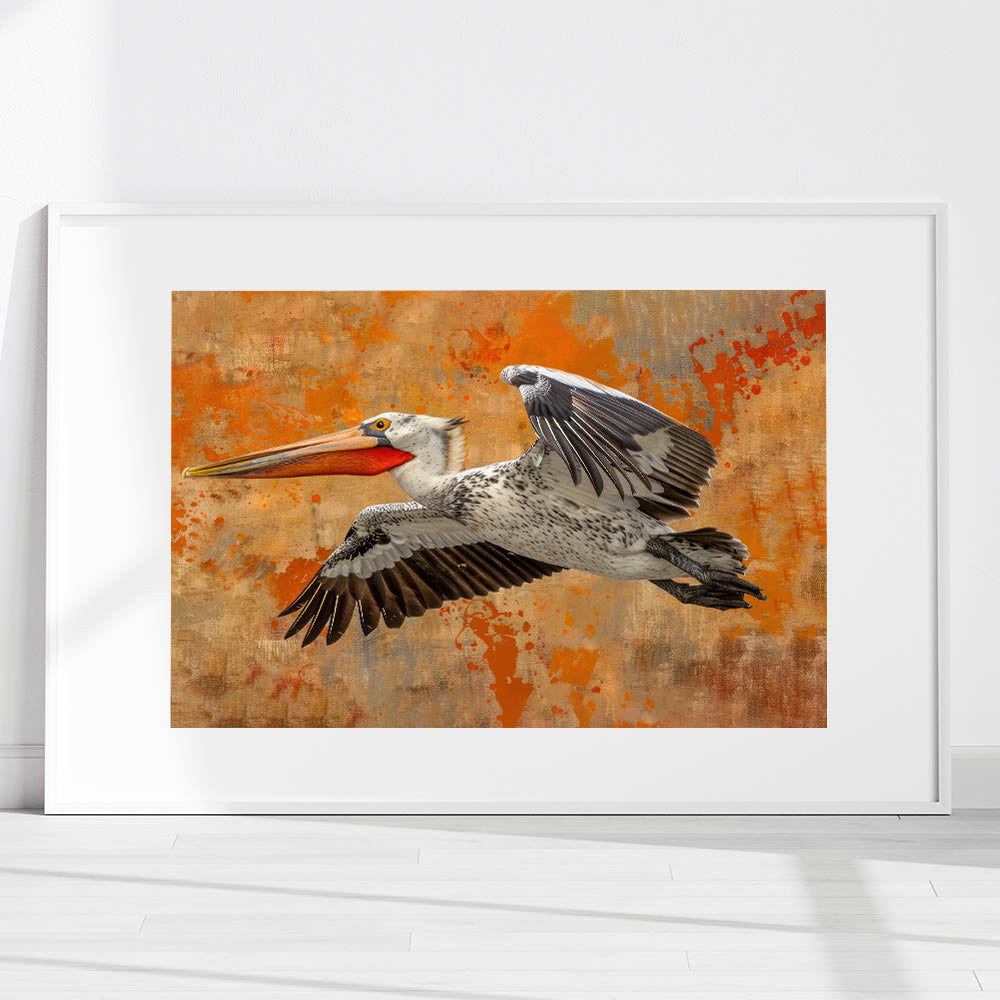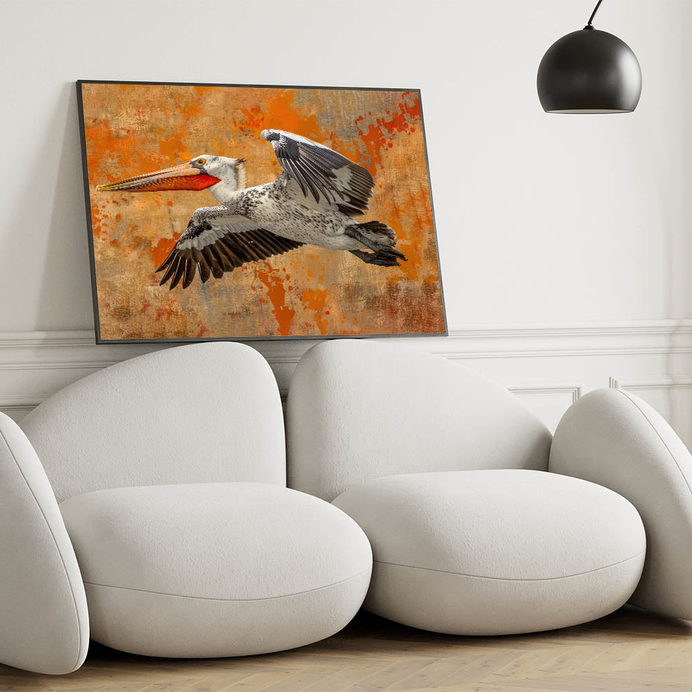 Energize your living space with this Dynamic Pelican Wall Art, featuring a striking pelican in mid-flight against a bold, abstract background. The vibrant splashes of orange and earthy tones add a modern, artistic flair to the piece, making it an ideal choice for those looking to make a statement in their decor. Perfect for a living room, office, or any space that could benefit from a touch of contemporary art, this pelican artwork is designed to capture attention and spark conversation.