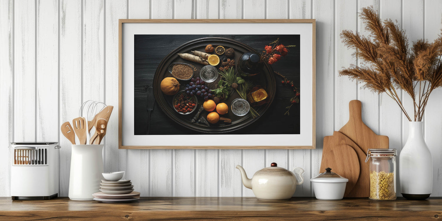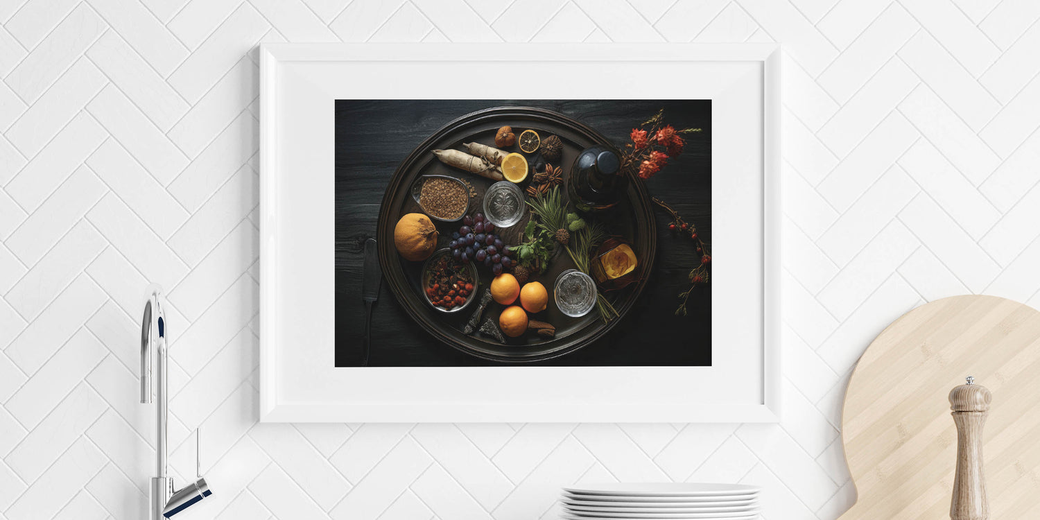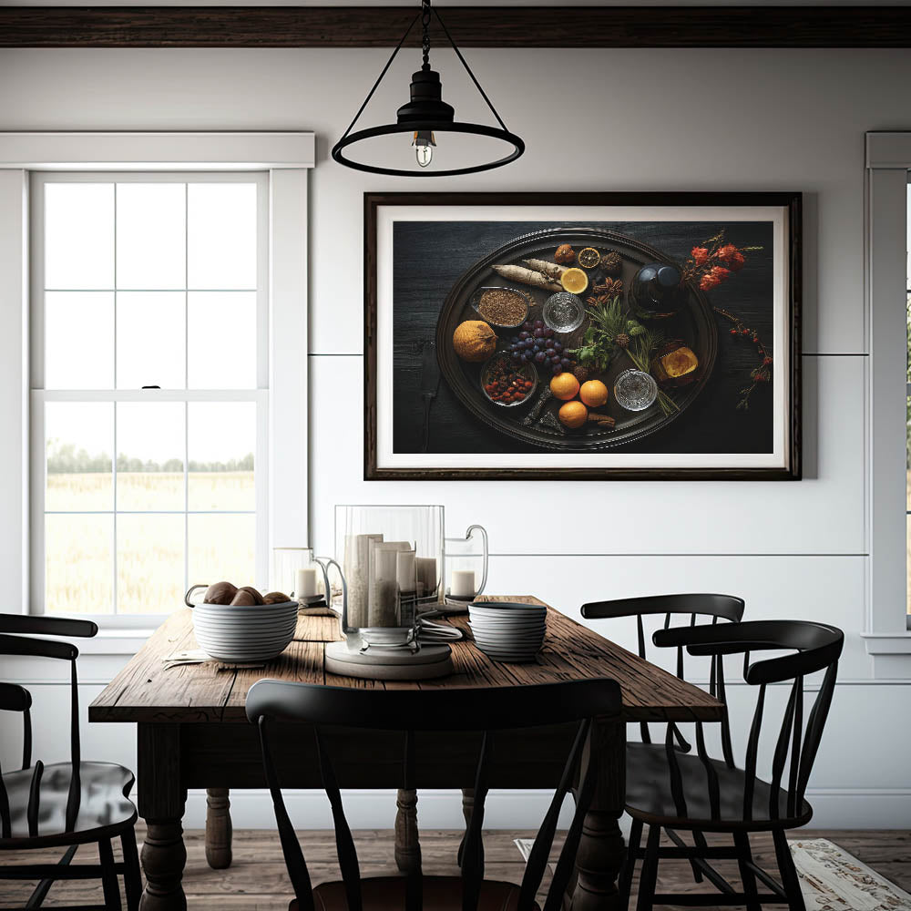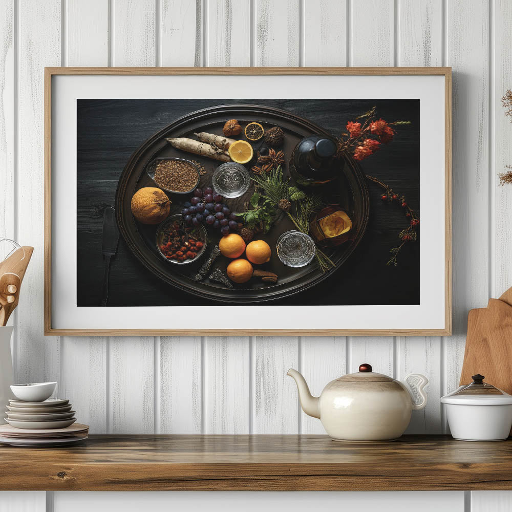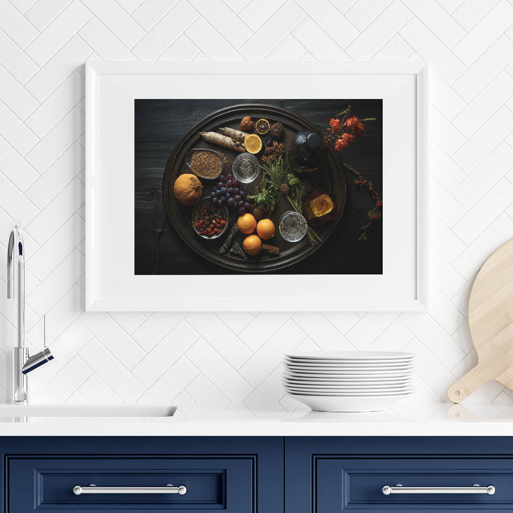 Enhance your kitchen or dining space with this stunning fruit canvas art, featuring a dark rustic aesthetic. This fruit photography art captures the richness of nature’s bounty, including oranges, grapes, and citrus fruits, elegantly arranged with spices and herbs. The deep, moody tones create a sophisticated yet inviting ambiance, making it an ideal fruit wall decor choice for homes, cafes, and restaurants.