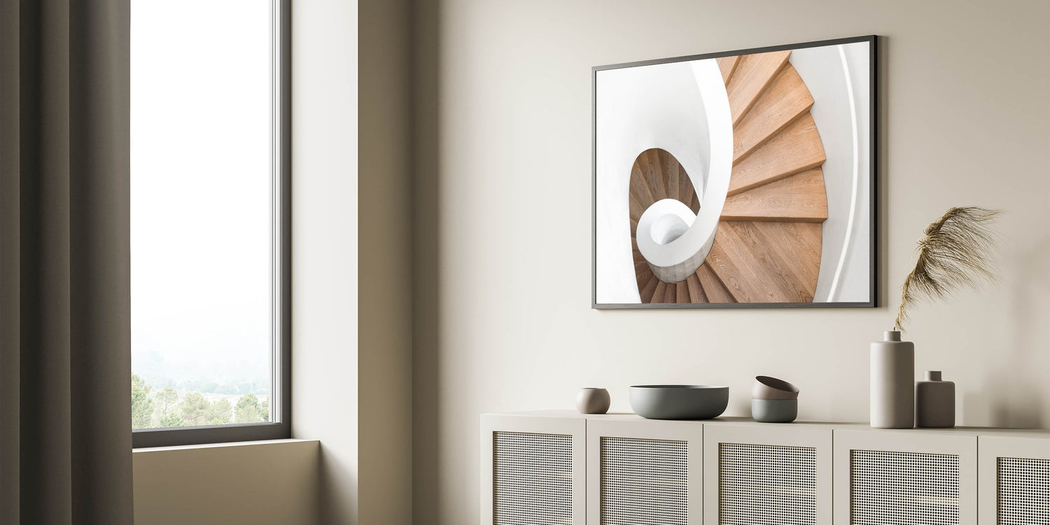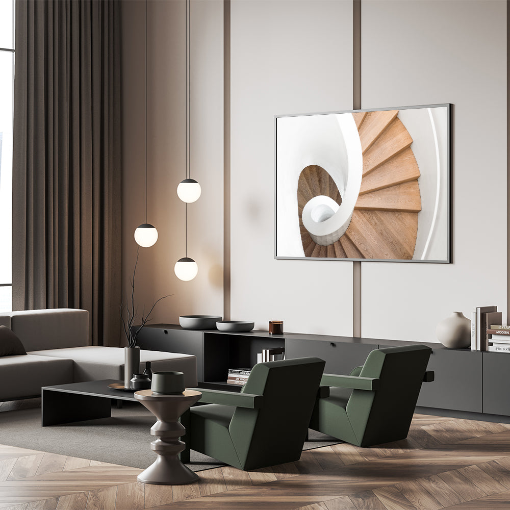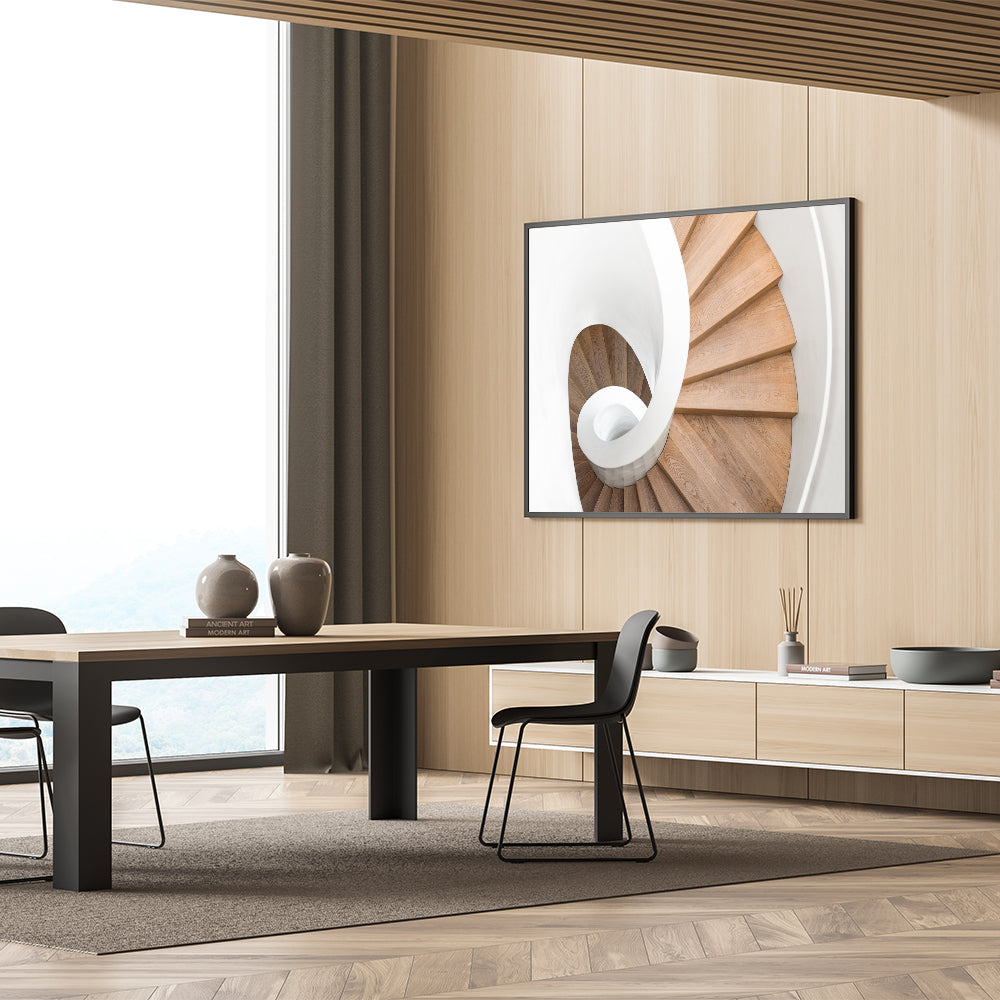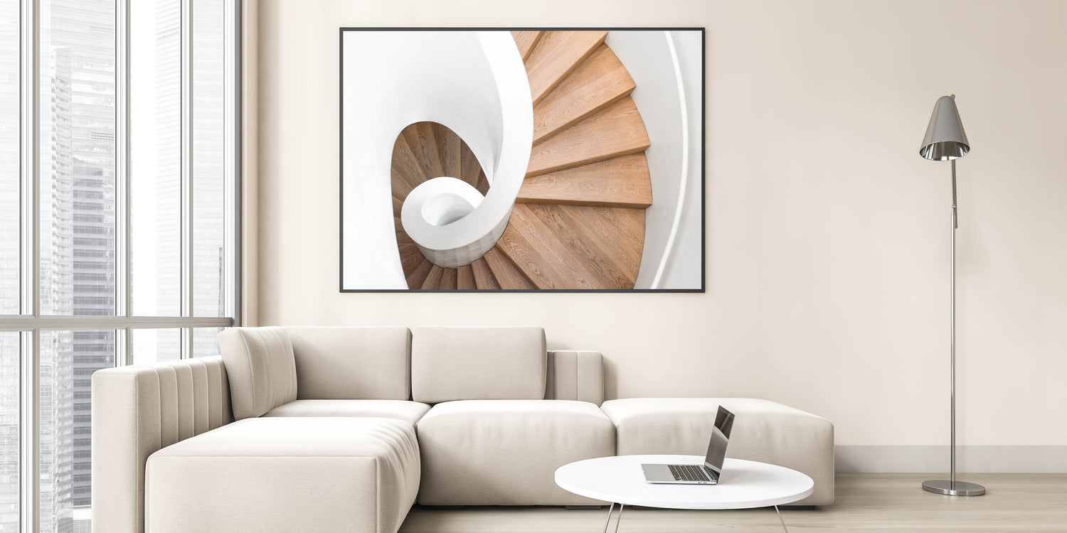 Enhance your living space with this elegant wooden spiral staircase wall art, a masterpiece that combines simplicity and sophistication. This stunning photograph captures the natural beauty of wooden steps spiraling gracefully within a modern architectural design. The soft tones of the wood against the clean white backdrop create a warm and inviting atmosphere, making it an ideal piece for any contemporary home or office setting.