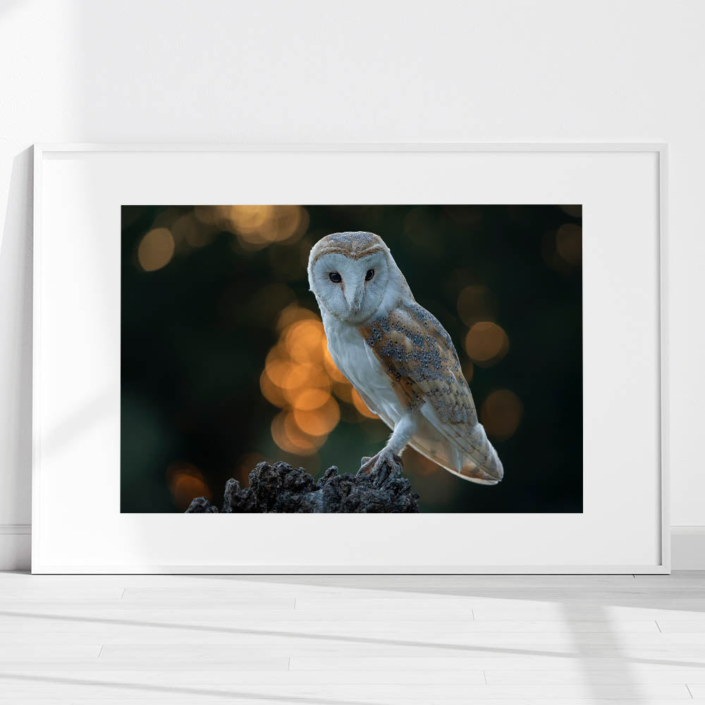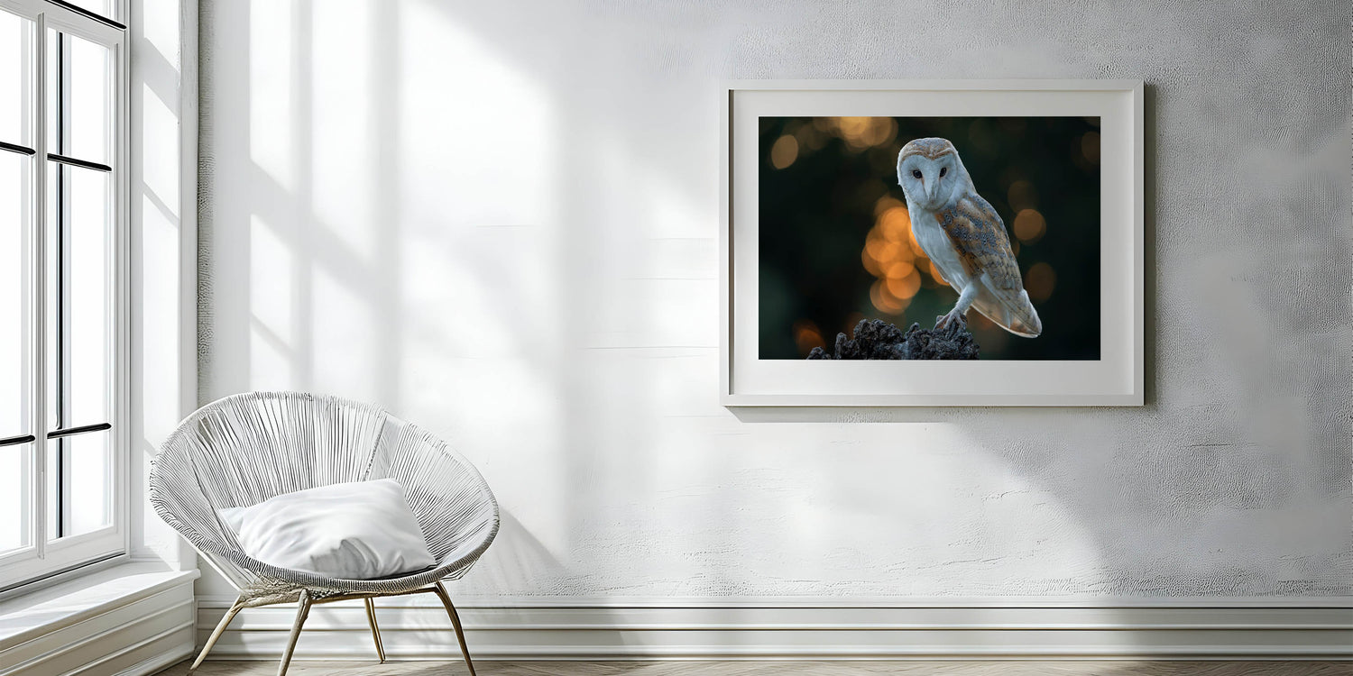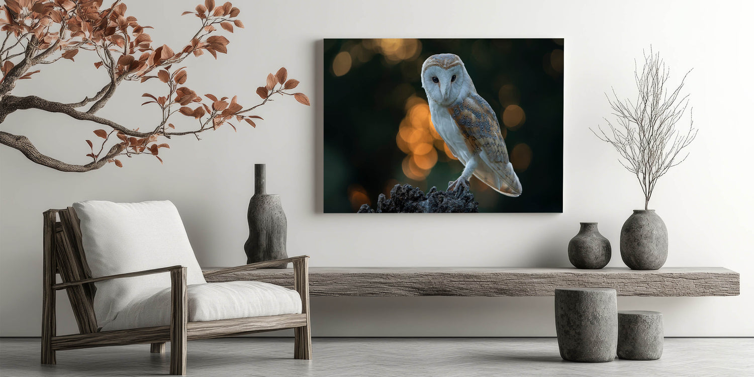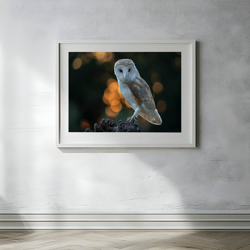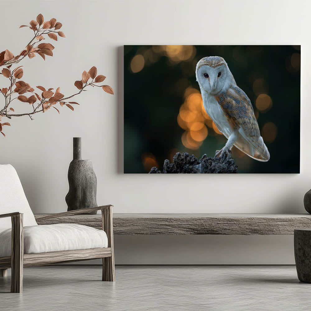 Elevate your decor with the mystical allure of this Enchanting Owl Wall Art. This stunning piece features a majestic owl perched gracefully, with its striking eyes gazing into the twilight. The warm, glowing bokeh lights in the background create a magical atmosphere, adding depth and intrigue to the artwork. The delicate details of the owl’s feathers, paired with the soft, dark surroundings, make this piece a captivating focal point in any room.