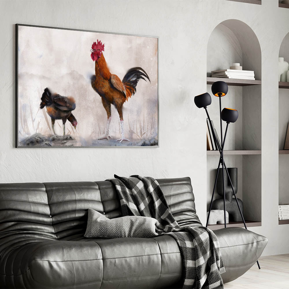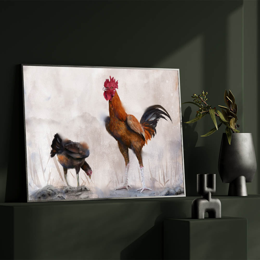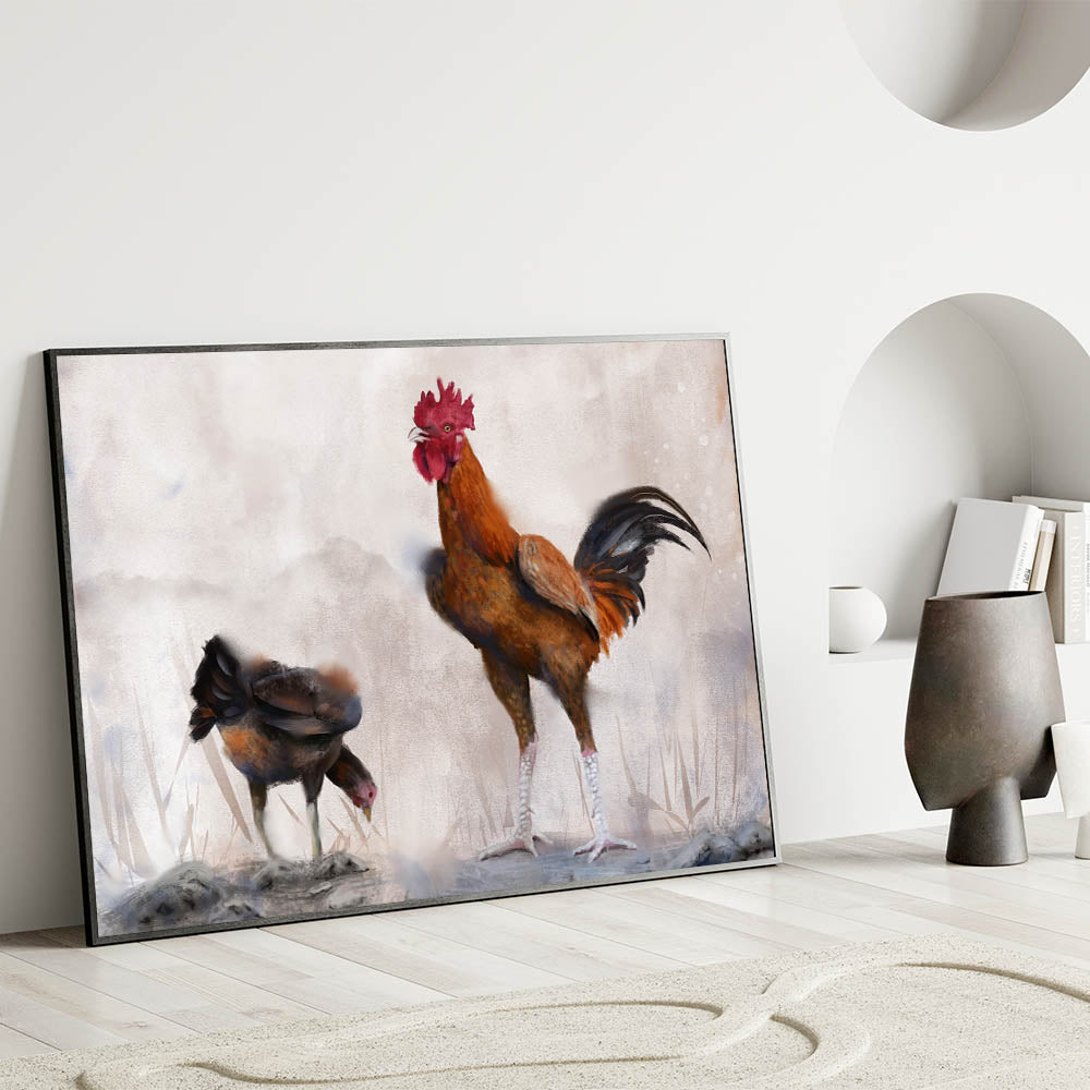 Bring the peaceful ambiance of farm life into your home with this beautifully crafted chicken wall art. Featuring a majestic rooster standing tall beside a humble hen, this artwork captures the serene and harmonious nature of the farmyard. The soft, earthy tones and the textured brushstrokes add depth and warmth to the scene, making it a perfect addition to any rustic or country-themed space.