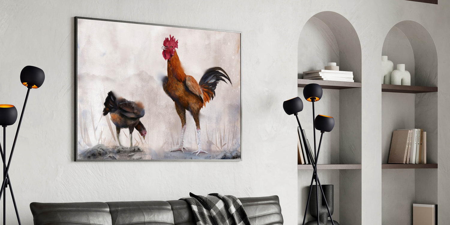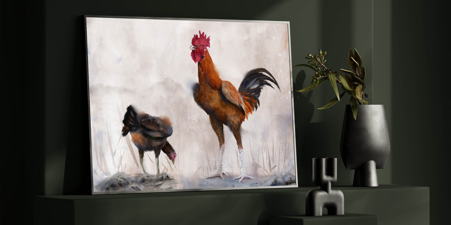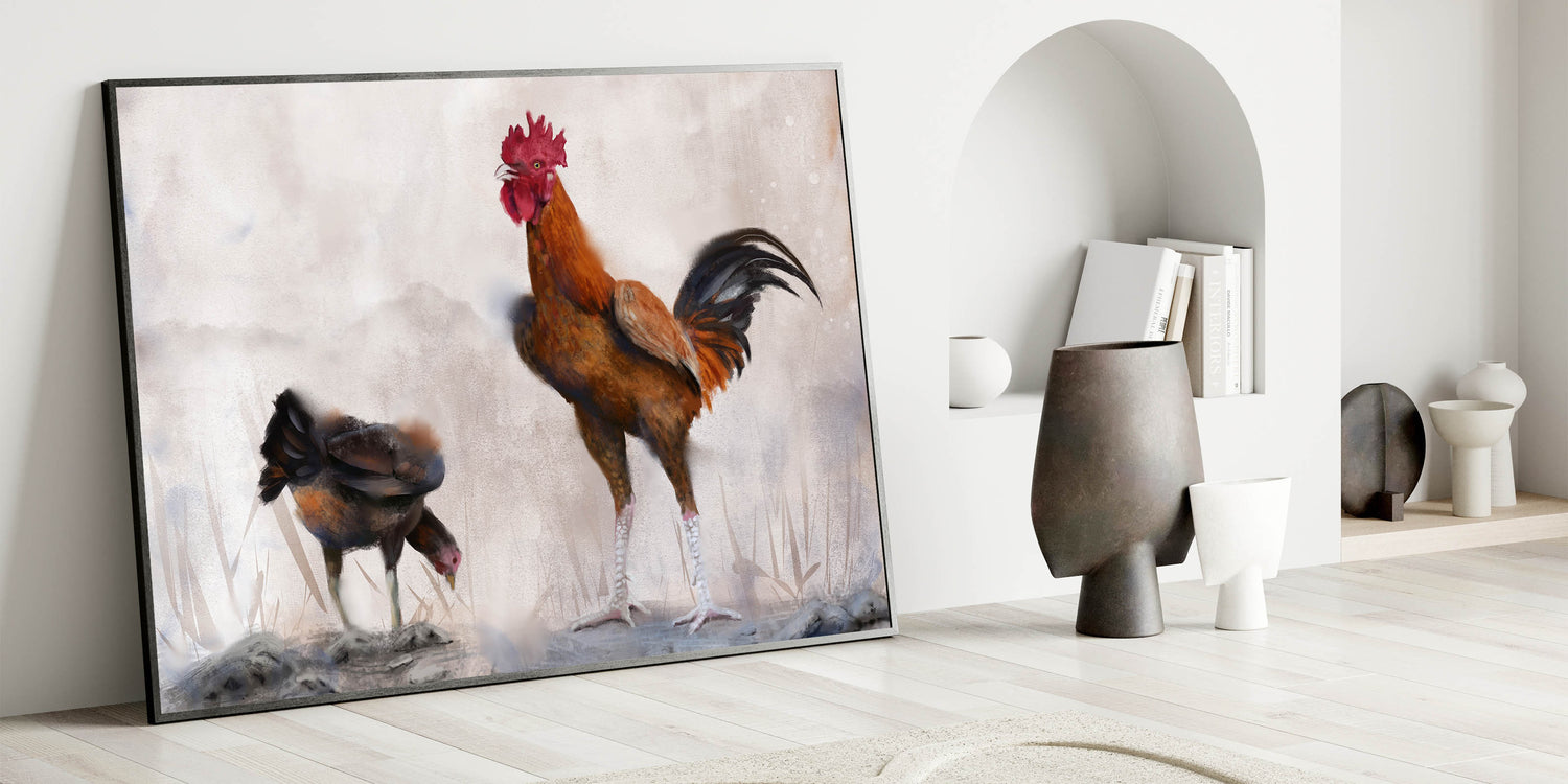 Bring the peaceful ambiance of farm life into your home with this beautifully crafted chicken wall art. Featuring a majestic rooster standing tall beside a humble hen, this artwork captures the serene and harmonious nature of the farmyard. The soft, earthy tones and the textured brushstrokes add depth and warmth to the scene, making it a perfect addition to any rustic or country-themed space.