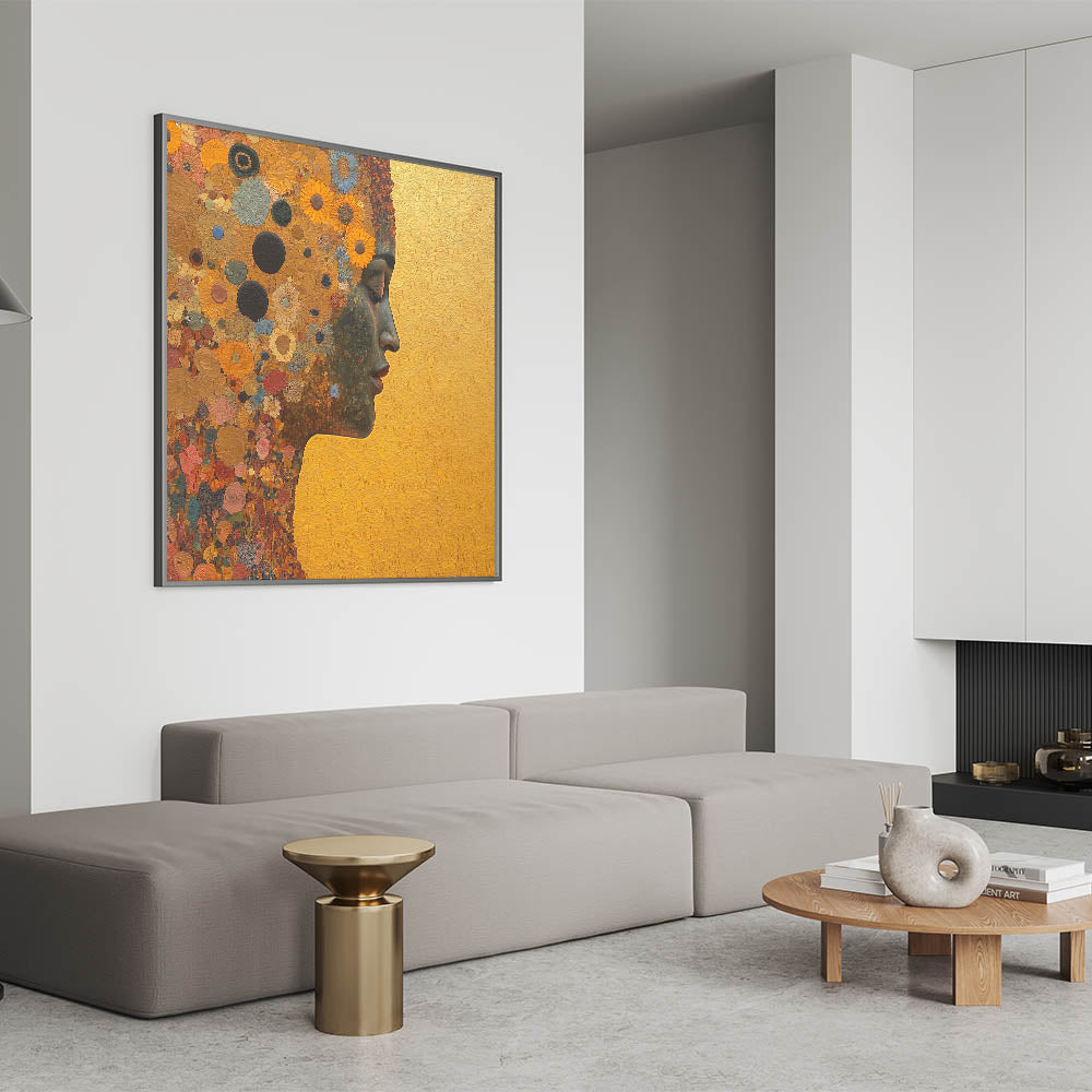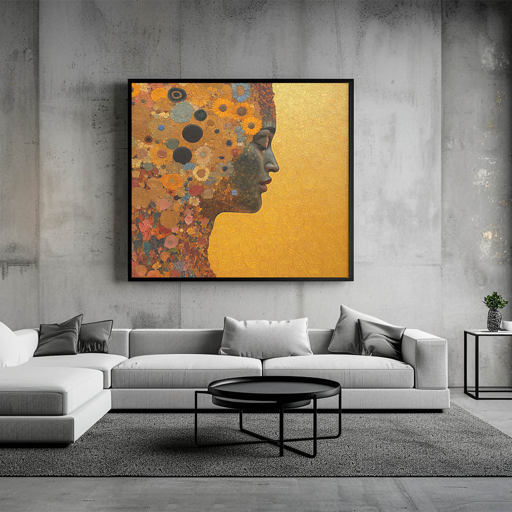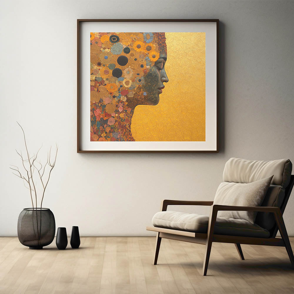 Celebrate the beauty of nature and femininity with this abstract figurative wall art, depicting a tranquil female profile merging into a radiant floral composition. The intricate detailing, textured elements, and warm golden hues give this modern abstract figure painting a luminous and mesmerizing appeal. The harmonious blend of orange, gold, and earthy tones creates a sense of peace and elegance.