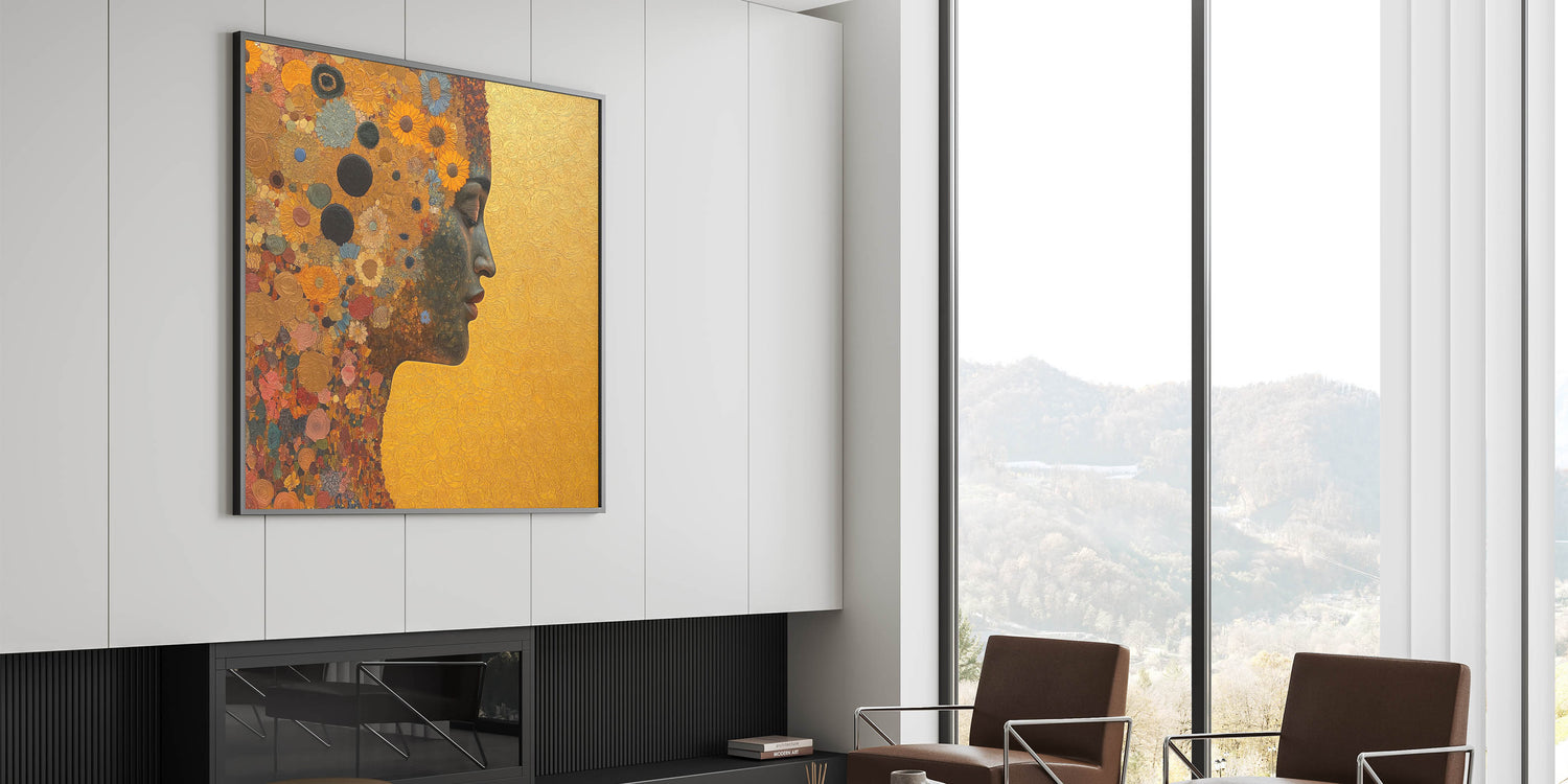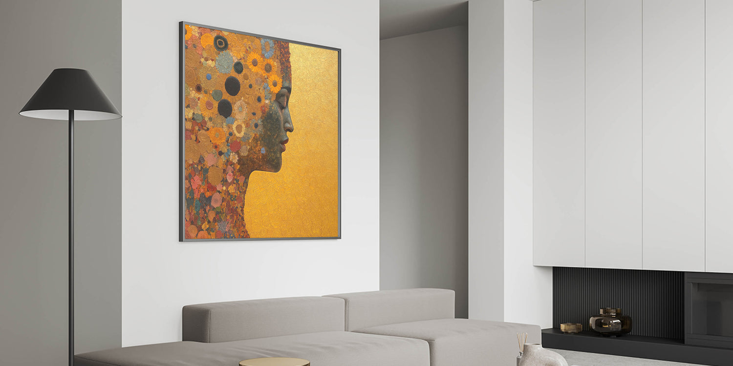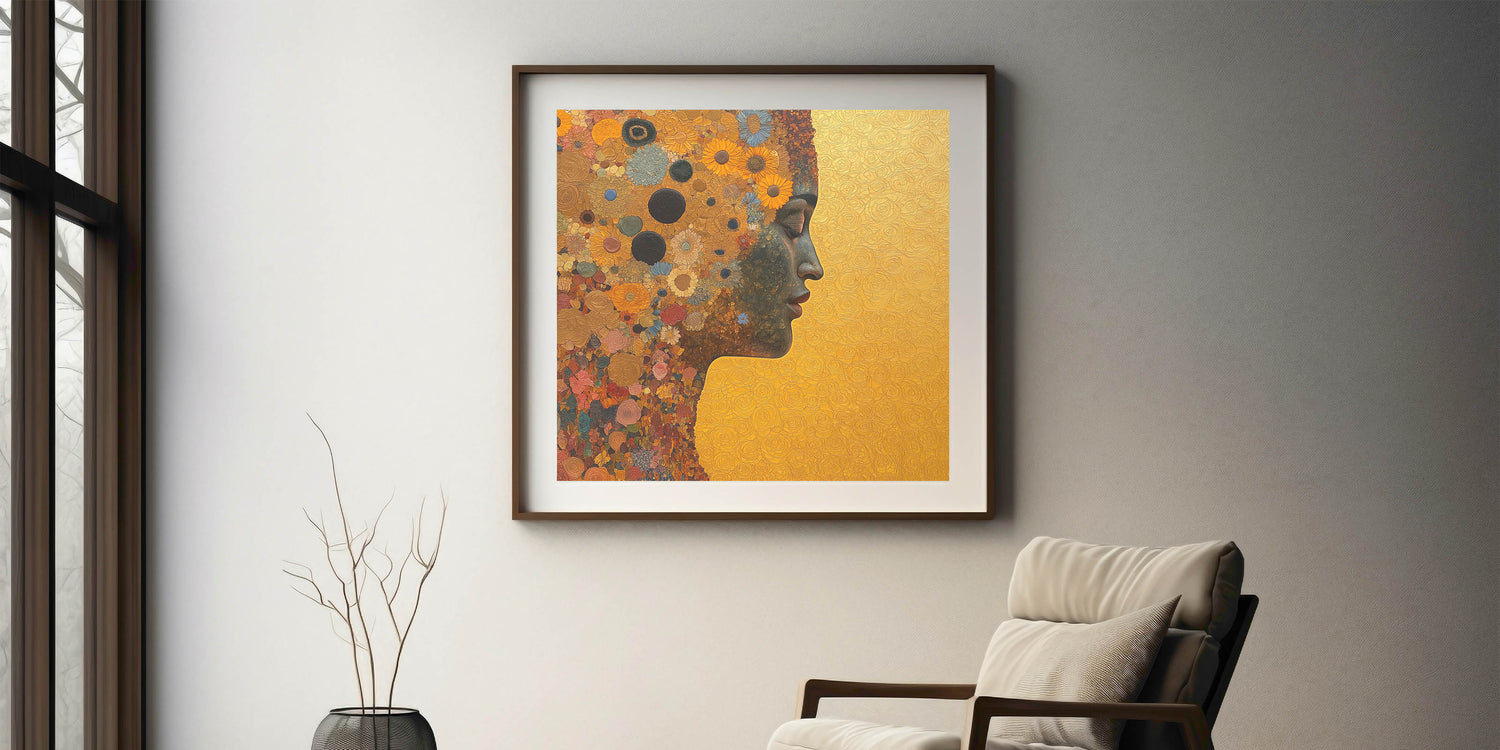 Celebrate the beauty of nature and femininity with this abstract figurative wall art, depicting a tranquil female profile merging into a radiant floral composition. The intricate detailing, textured elements, and warm golden hues give this modern abstract figure painting a luminous and mesmerizing appeal. The harmonious blend of orange, gold, and earthy tones creates a sense of peace and elegance.