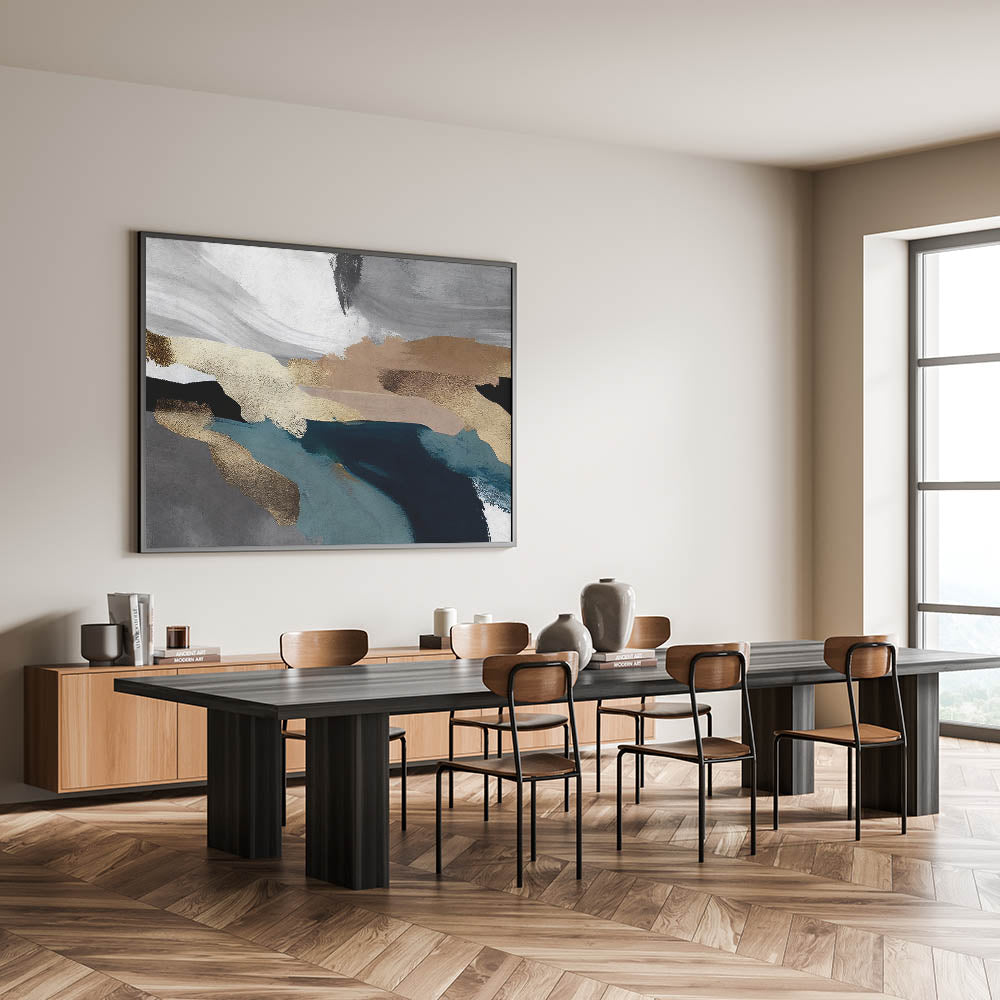 Introduce a touch of elegance to your home with this stunning geometric strokes and lines abstract art. This piece is a sophisticated blend of earth tones and dynamic brush strokes, featuring deep teal, warm gold, and muted grays. The design captures the essence of natural landscapes, making it a perfect choice for creating a serene yet impactful focal point in any room.