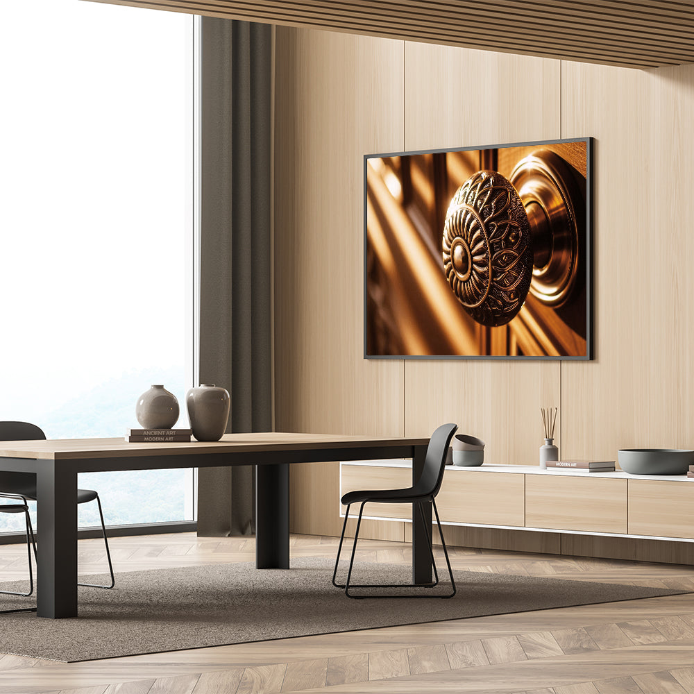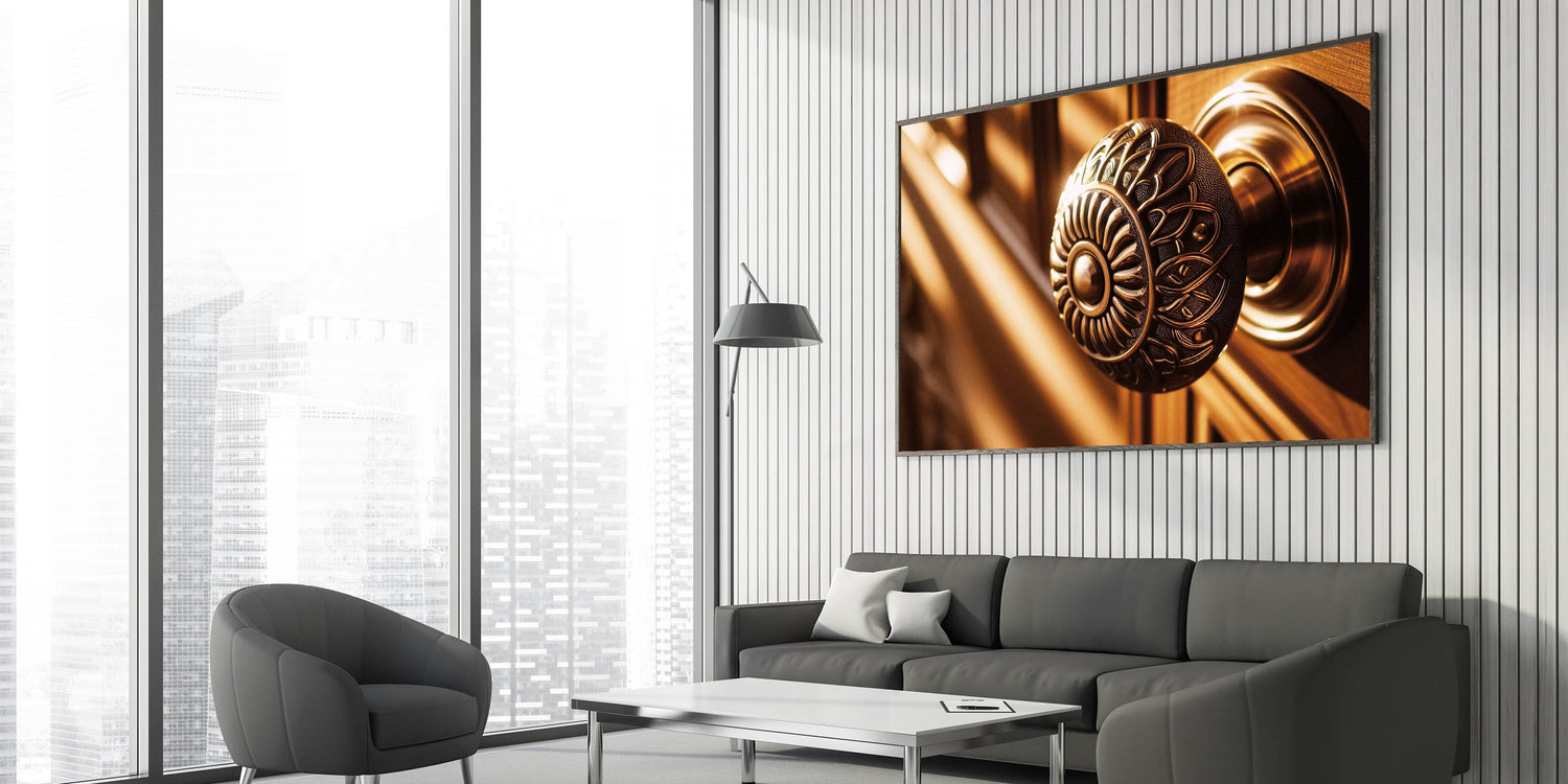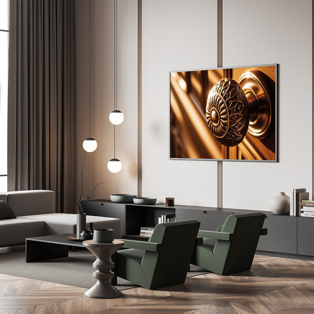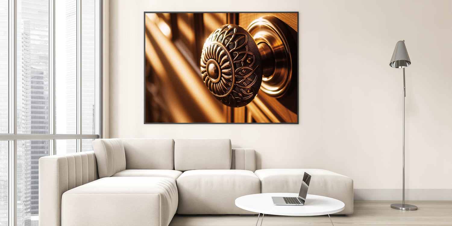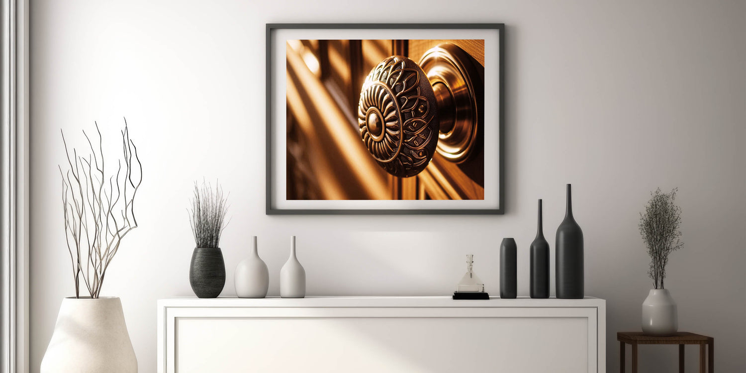 Whether you're enhancing a modern or traditional decor style, this hardware wall art brings a sense of grandeur and elegance. The detailed craftsmanship of the door knob and the play of light on its golden surface create a captivating focal point in any room.