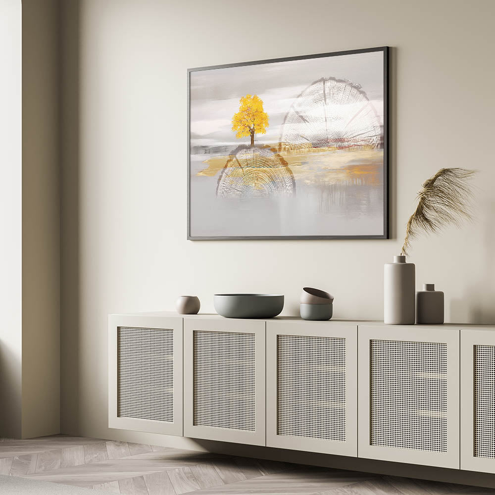 Discover the captivating blend of nature and abstract art with our "Golden Tree in Abstract Landscape." This modern strokes and lines art piece showcases a vibrant yellow tree set against a serene backdrop of intricate, circular lines and muted tones. The unique combination of natural elements and geometric patterns creates a stunning visual impact, perfect for any contemporary living space.