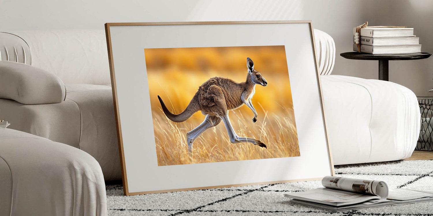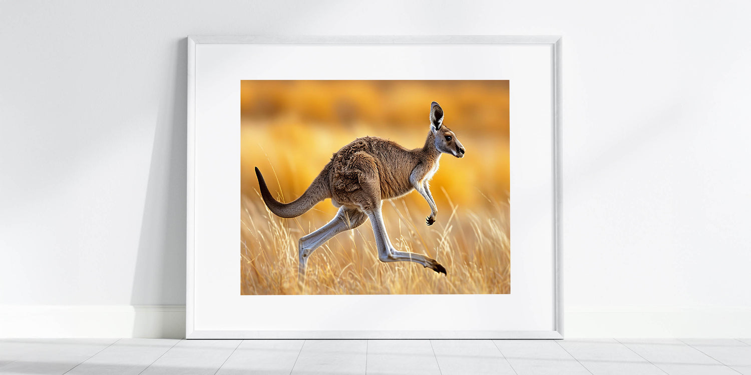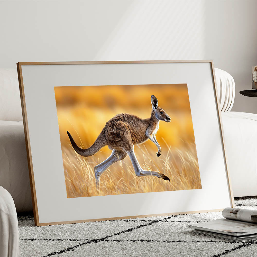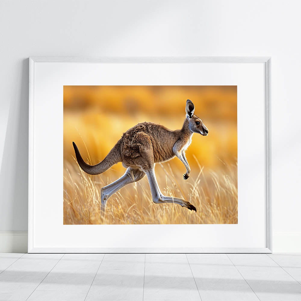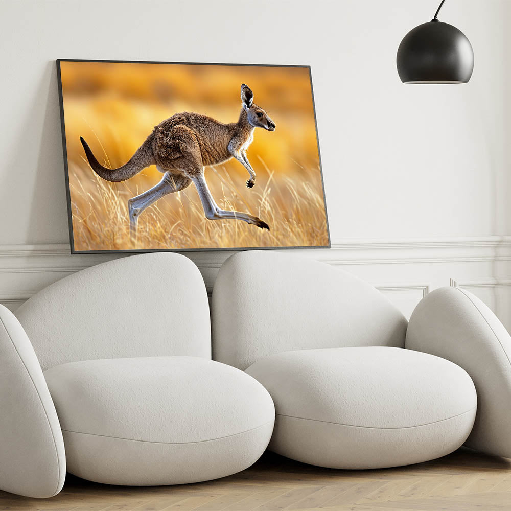 Bring the captivating essence of the Australian outback into your home with our stunning Kangaroo wall art. This exquisite piece features a gracefully leaping kangaroo captured in perfect detail, set against a backdrop of warm, golden grasses that evoke the serene beauty of Australia's natural landscape. Ideal for wildlife enthusiasts and nature lovers, this artwork serves as a remarkable focal point in any room, enhancing your decor with its vibrant yet earthy tones.