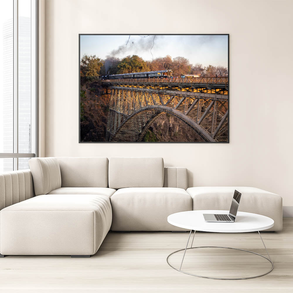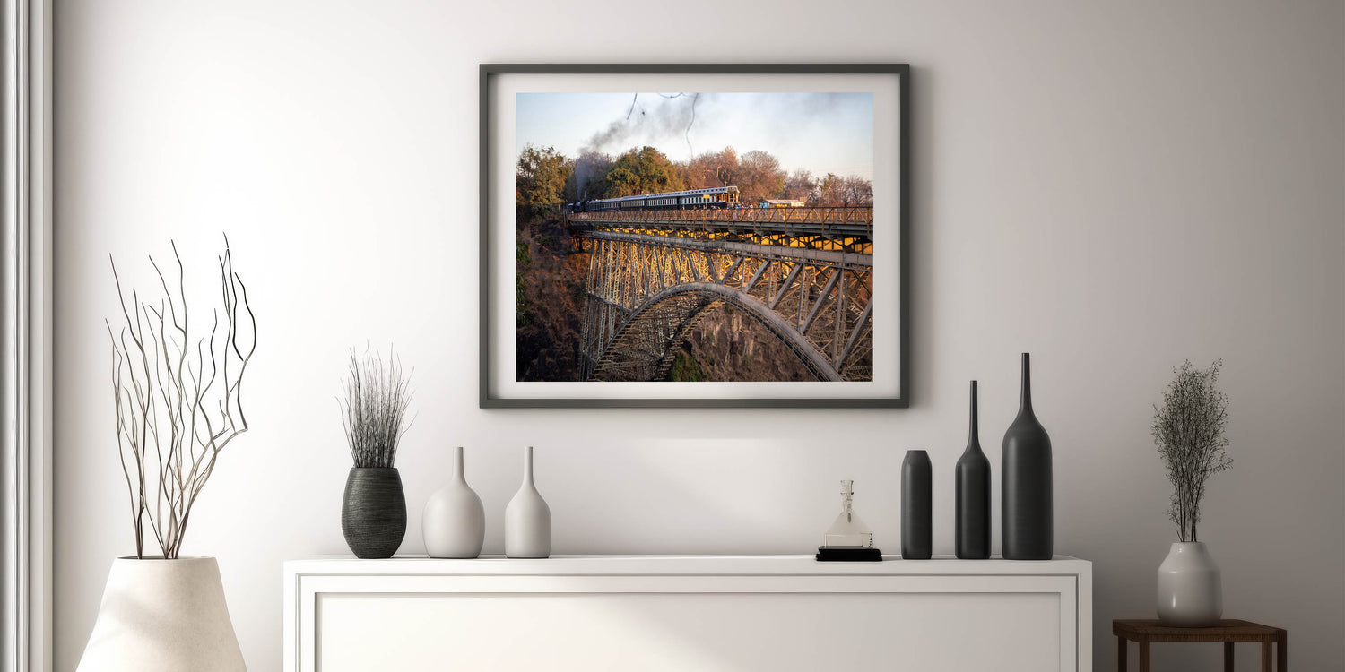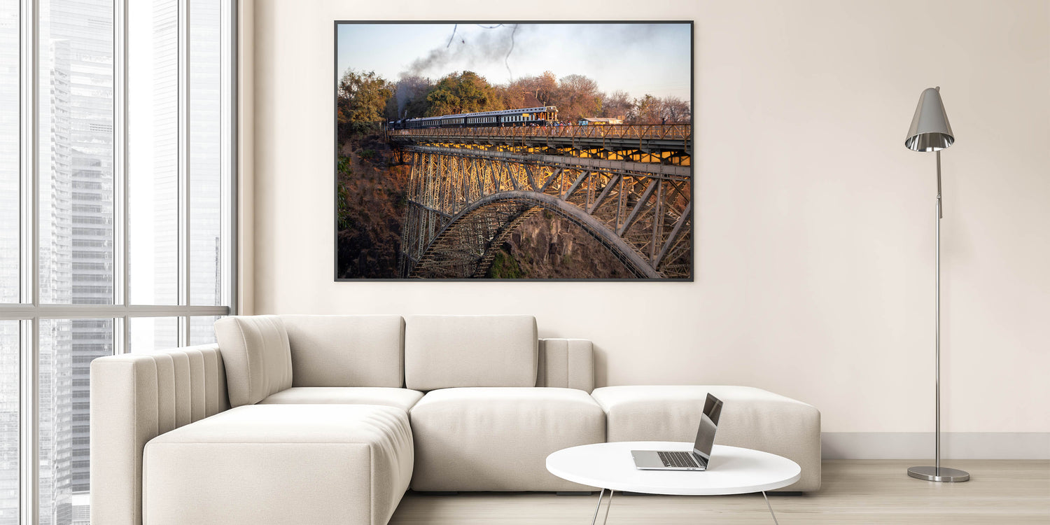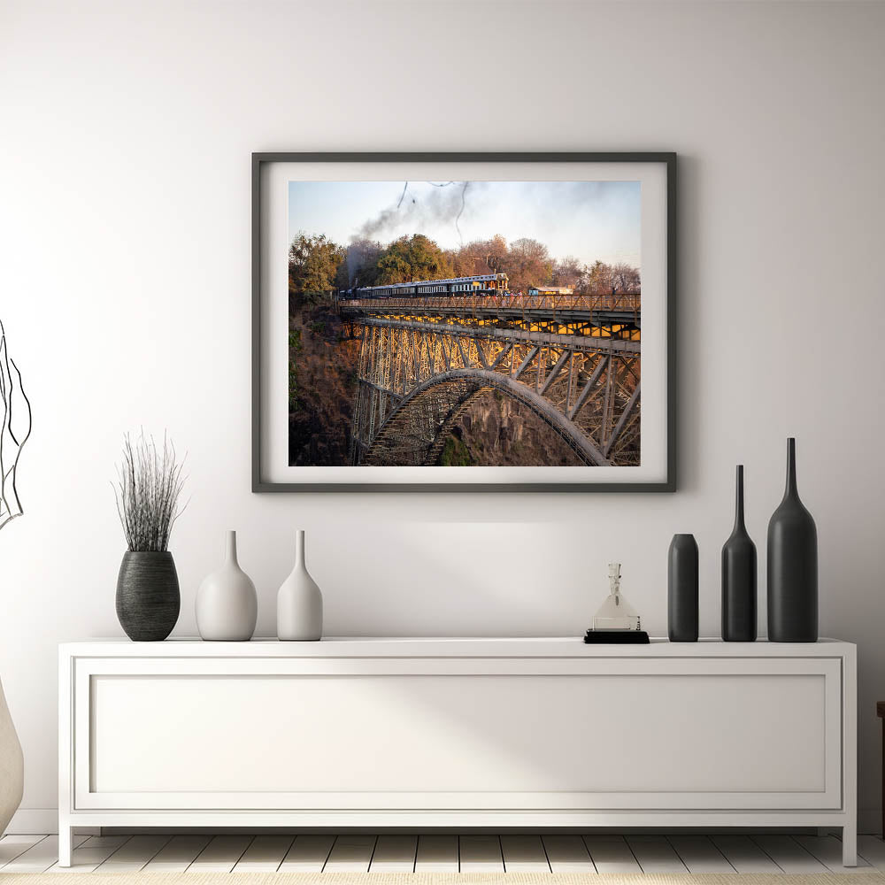 Capture the timeless beauty of train travel with this stunning historic railway bridge wall art. This photograph features a classic train making its way across a beautifully detailed bridge, set against a backdrop of lush greenery and rugged terrain. The warm tones of the late afternoon sun highlight the intricate structure of the bridge, making this piece a perfect addition to any space that celebrates both nature and engineering.