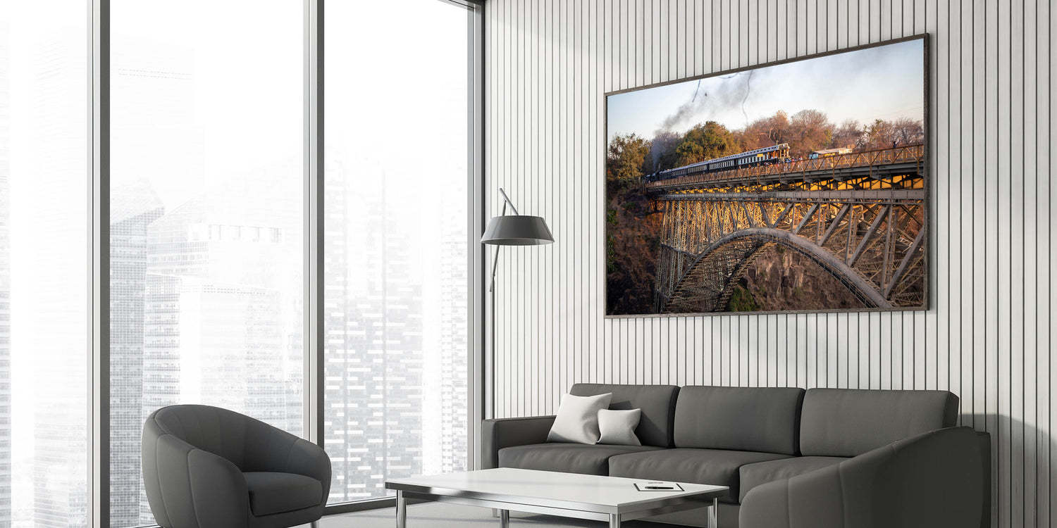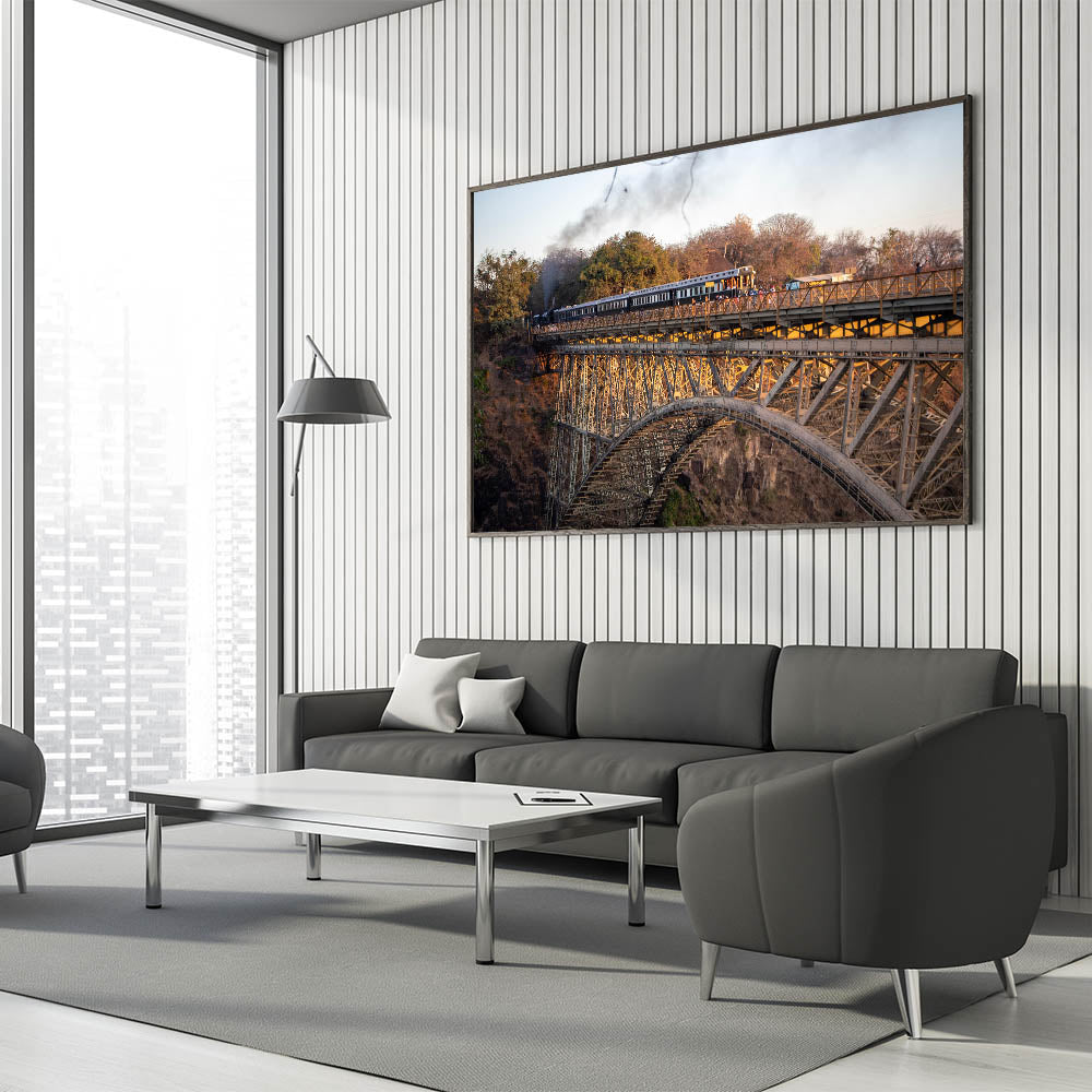 This artwork is perfect for train enthusiasts and anyone who appreciates the beauty of classic engineering. Whether you're decorating a living room, office, or hallway, this railway bridge print will bring a sense of adventure and nostalgia into your space.
