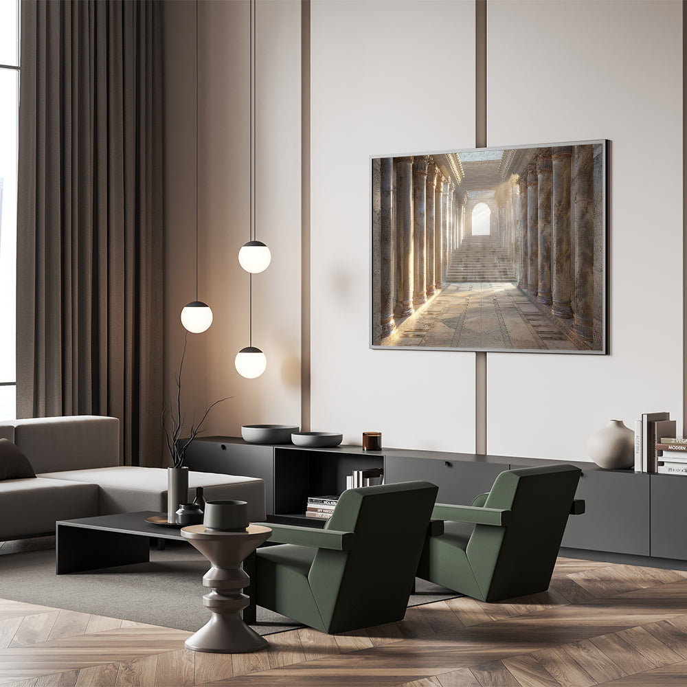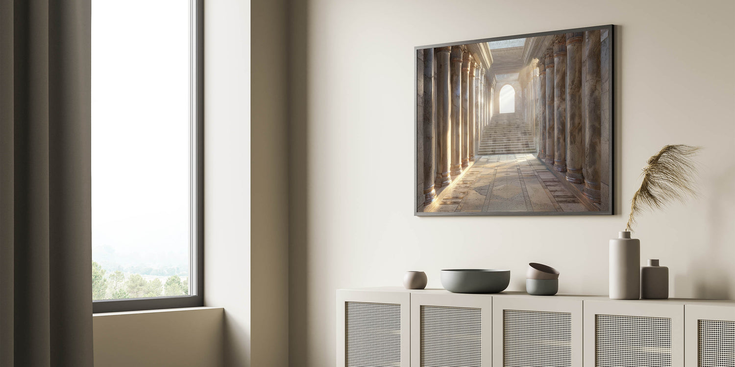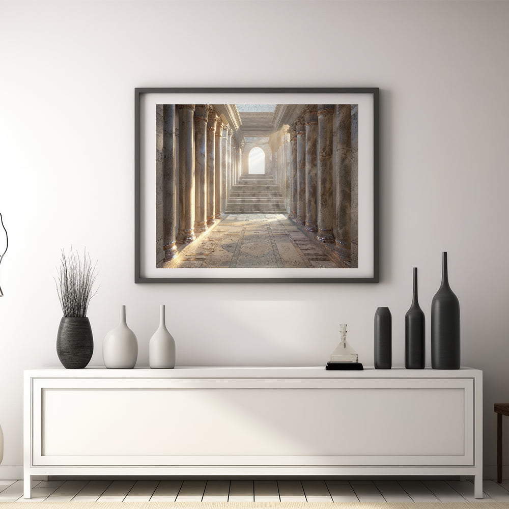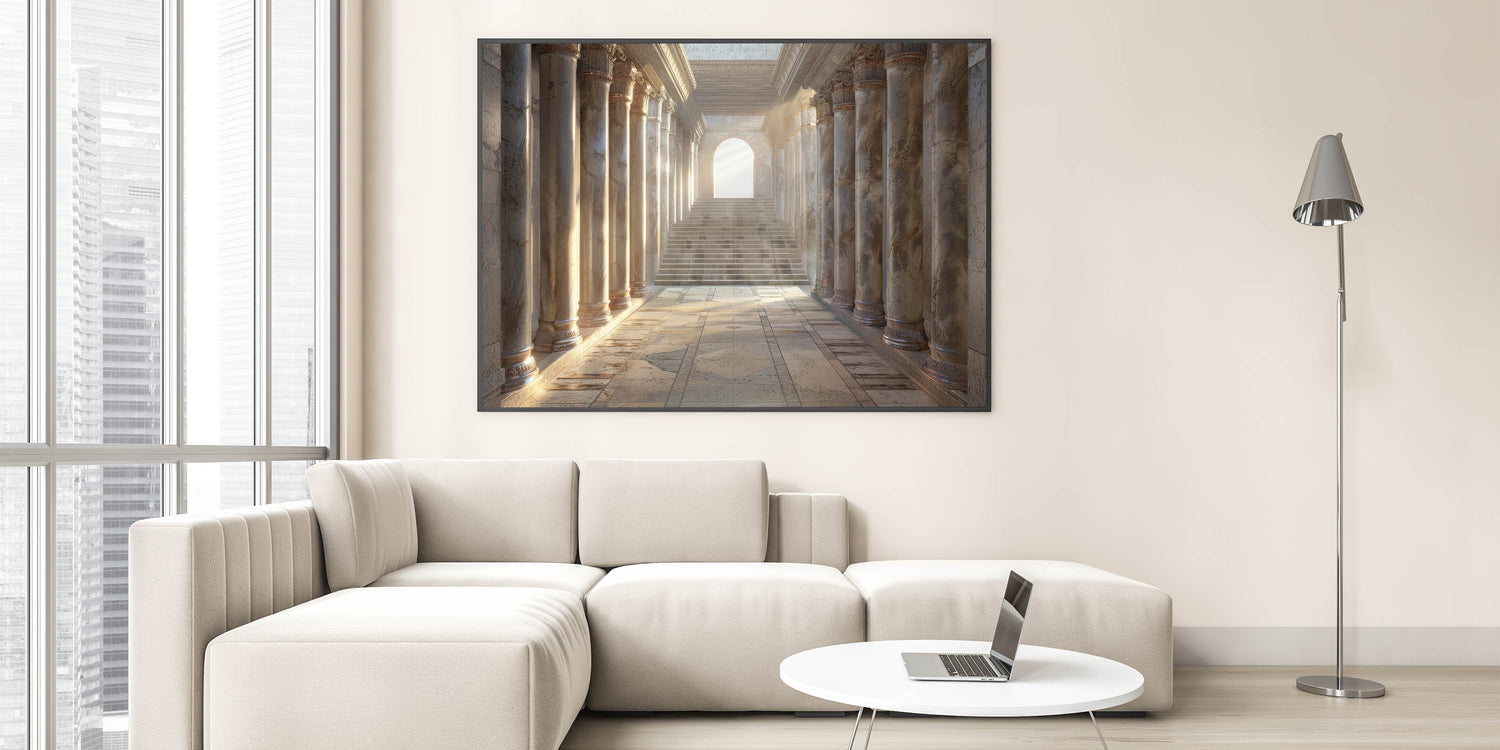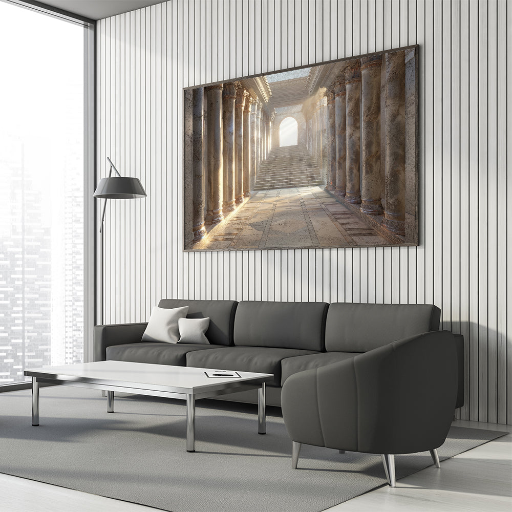 Step into the grandeur of classical architecture with this Historical Columns Wall Art. This artwork beautifully captures a serene, sunlit hallway lined with majestic columns, leading towards a staircase bathed in soft light. The intricate details and warm tones evoke a sense of history and elegance, making this piece a perfect addition to any sophisticated interior.