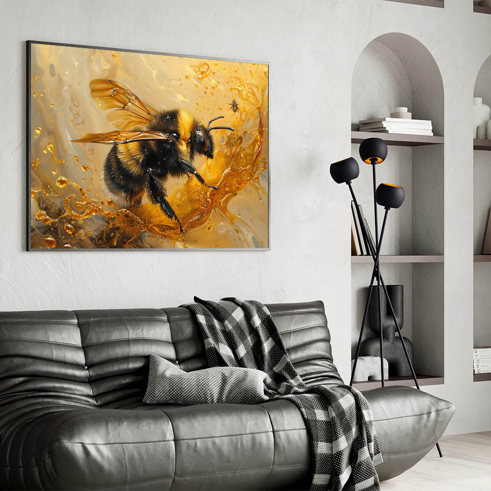Infuse your living space with the energy and beauty of nature with this stunning honey bee wall art. This artwork captures a bumblebee in vibrant motion, surrounded by swirling golden hues reminiscent of honey and sunlight. The dynamic composition and rich textures make this piece a perfect focal point for any room, evoking a sense of life and movement.