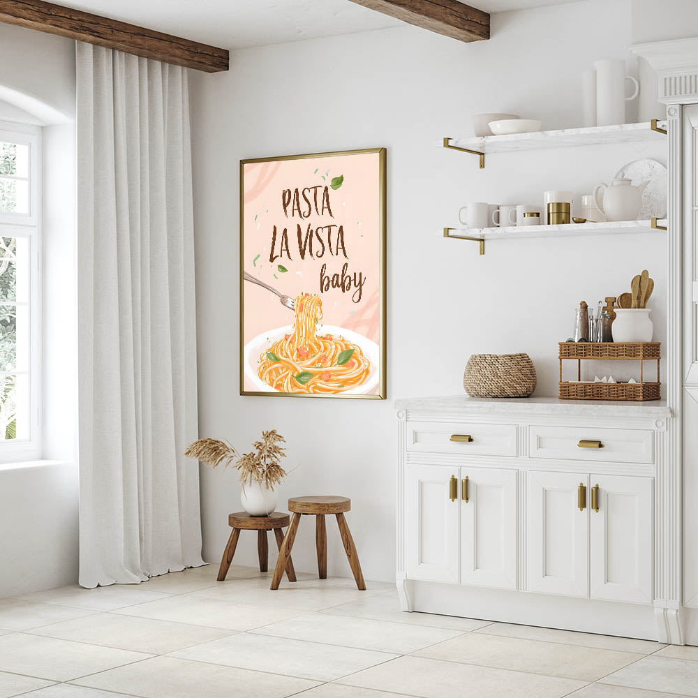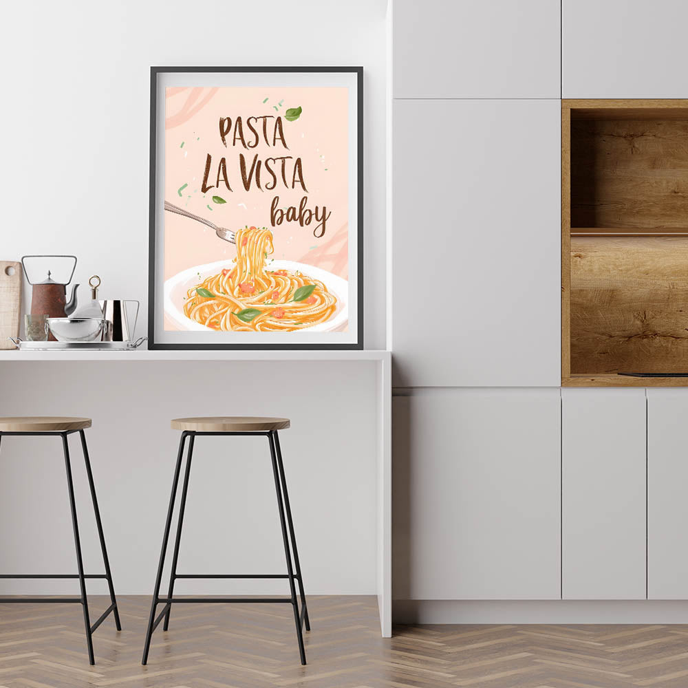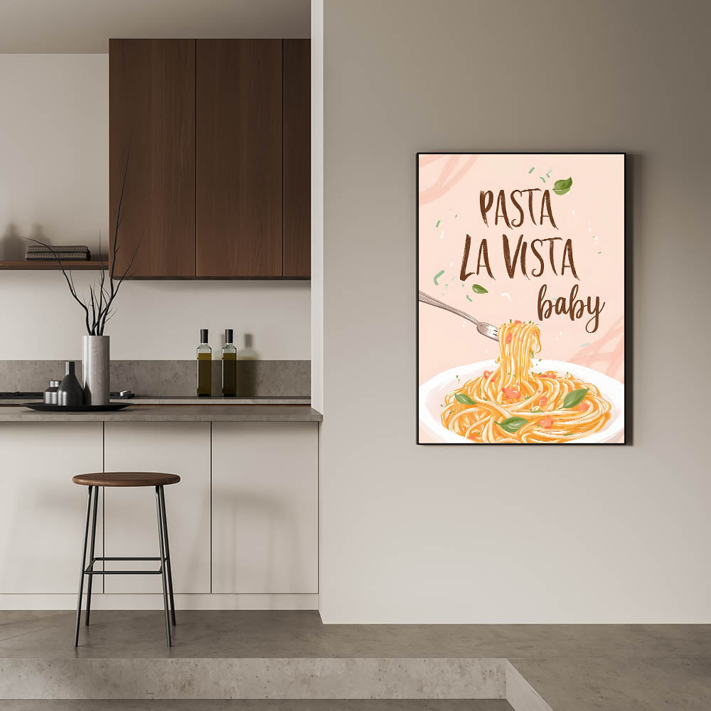 Bring humor and flavor to your kitchen with this Inspirational Kitchen Prints design featuring the fun phrase "Pasta La Vista Baby." Perfect for food lovers and Italian cuisine enthusiasts, this Motivational Kitchen Wall Decor combines stylish typography with a beautifully illustrated plate of spaghetti, making it an eye-catching piece for any space.