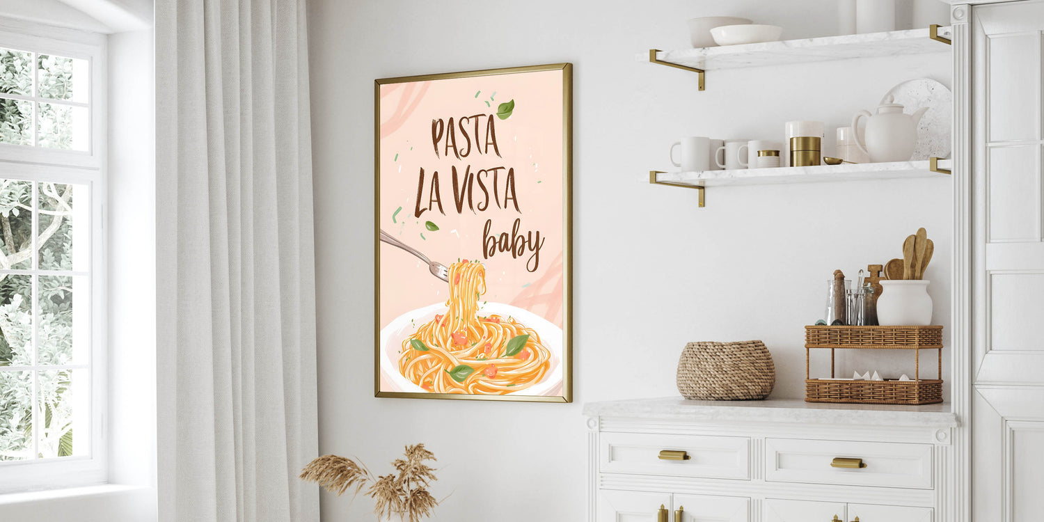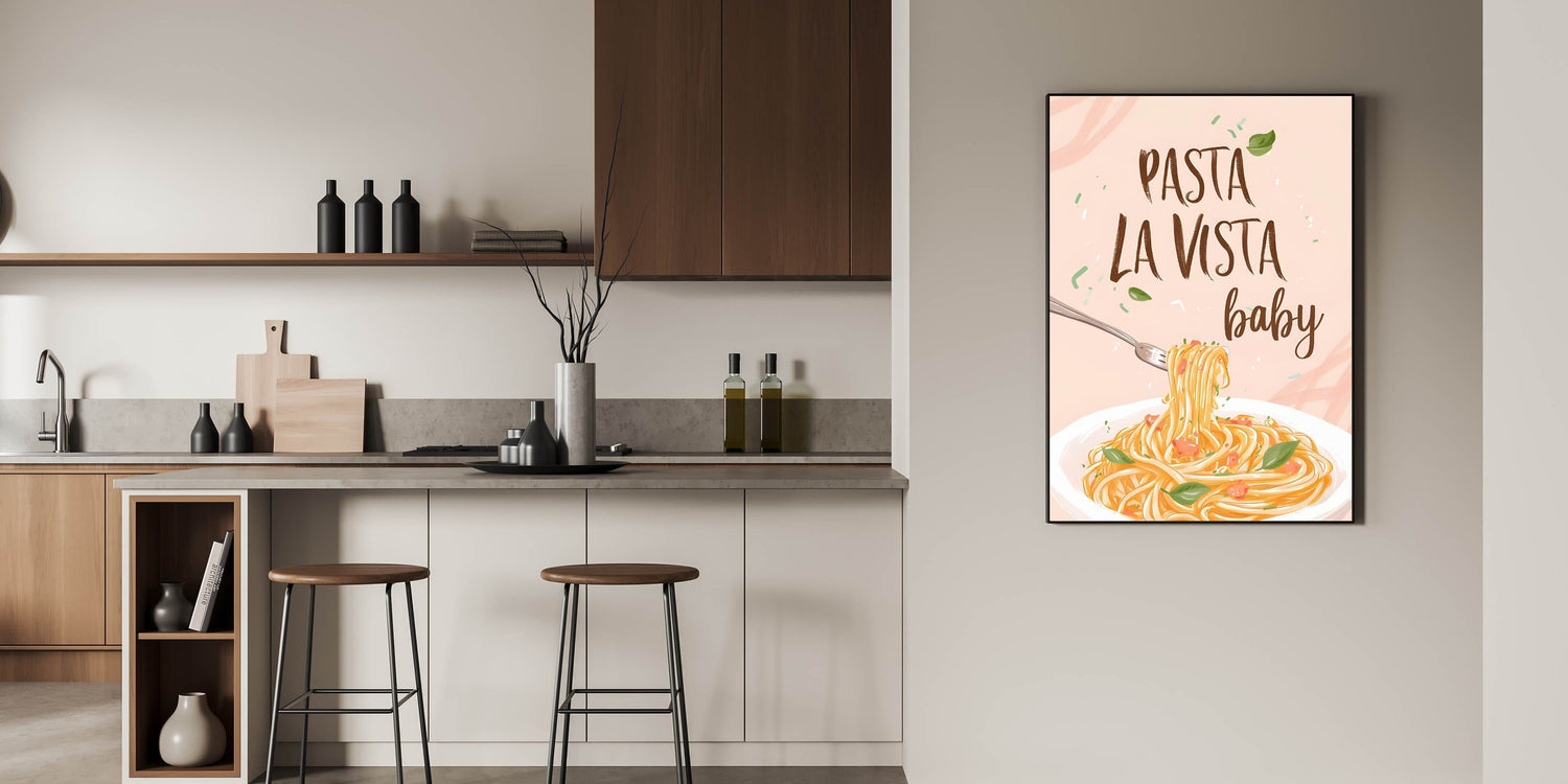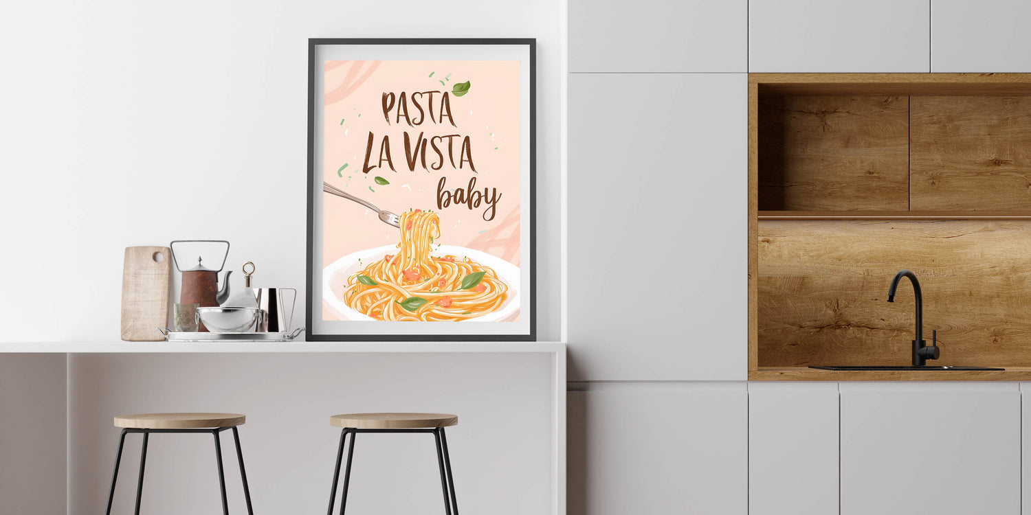 Bring humor and flavor to your kitchen with this Inspirational Kitchen Prints design featuring the fun phrase "Pasta La Vista Baby." Perfect for food lovers and Italian cuisine enthusiasts, this Motivational Kitchen Wall Decor combines stylish typography with a beautifully illustrated plate of spaghetti, making it an eye-catching piece for any space.