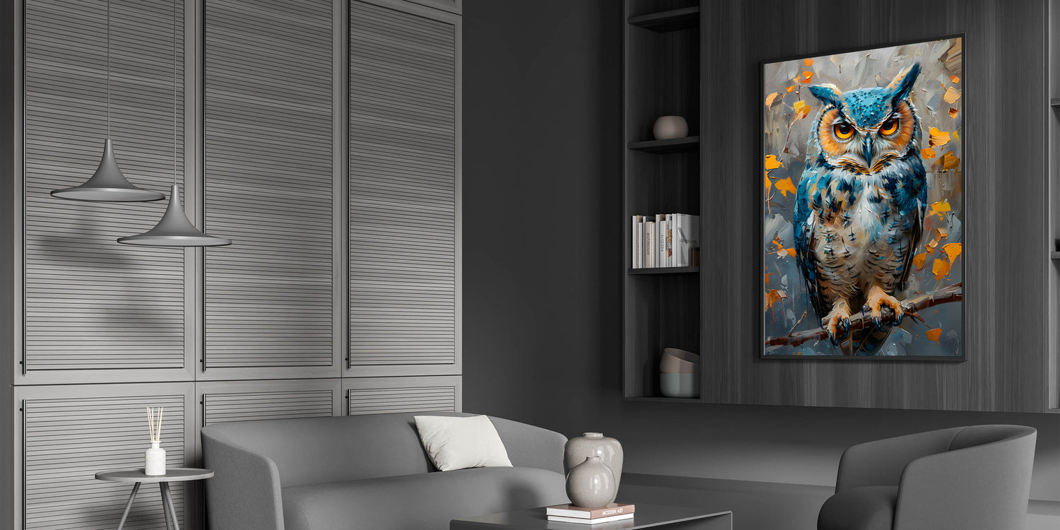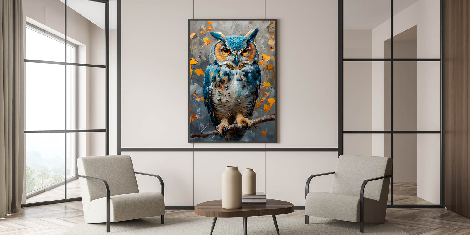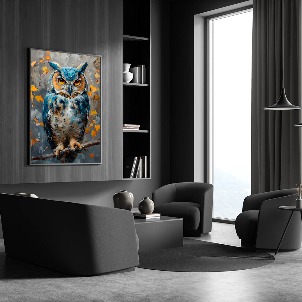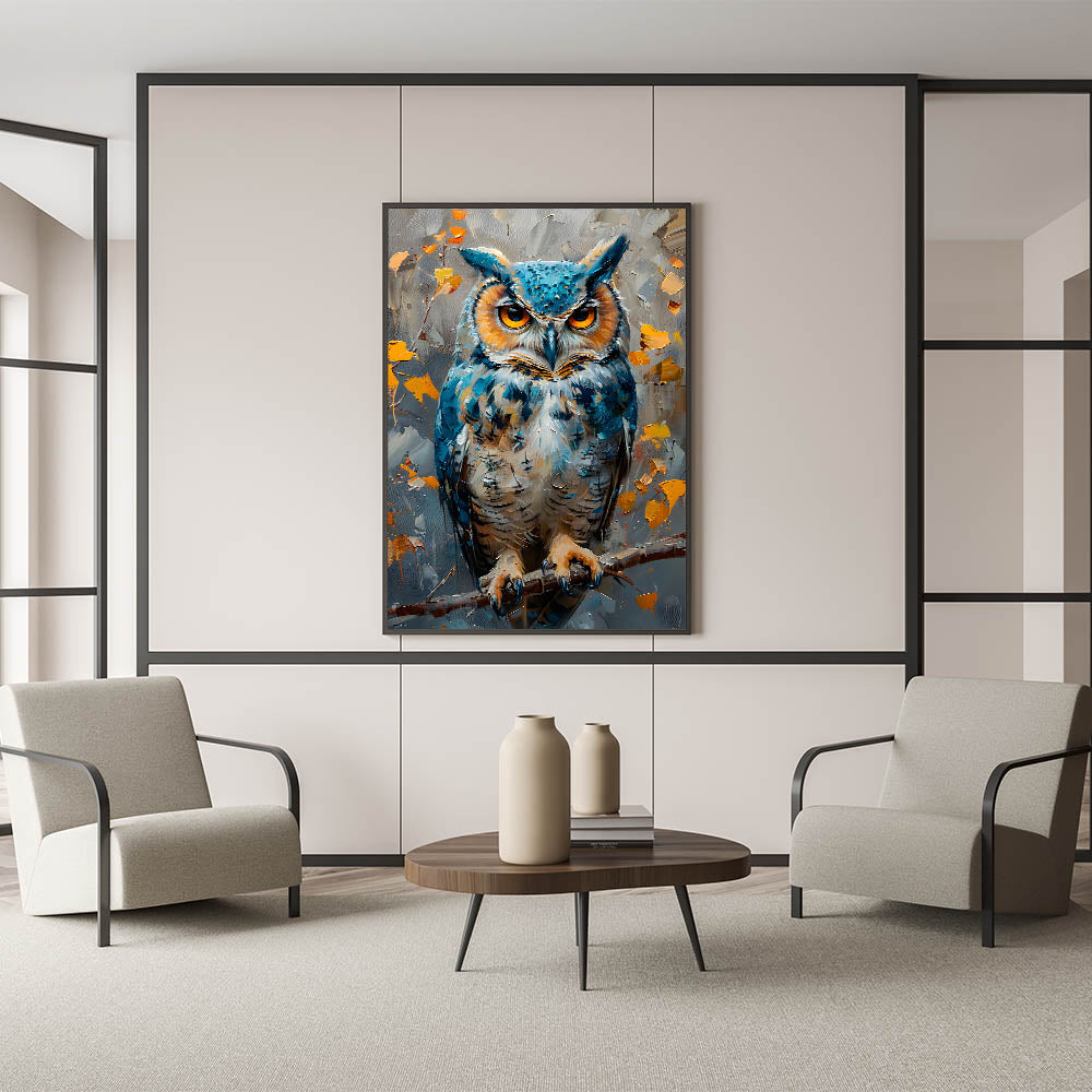 Whether you're a nature enthusiast or simply looking to add a touch of the wild to your decor, this artwork is a perfect choice. The rich hues of blue and orange, combined with the lifelike representation of the owl, make this piece a standout addition to any collection.