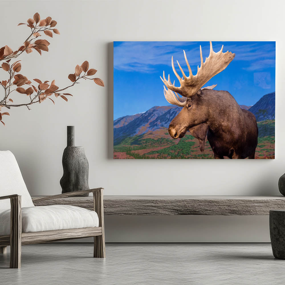 Immerse yourself in the grandeur of nature with this striking Elk Canvas Print. This captivating artwork features a majestic elk in its natural habitat, with a stunning mountain landscape in the background. The piece perfectly captures the strength and beauty of the elk, making it a perfect addition to any rustic or nature-themed decor.