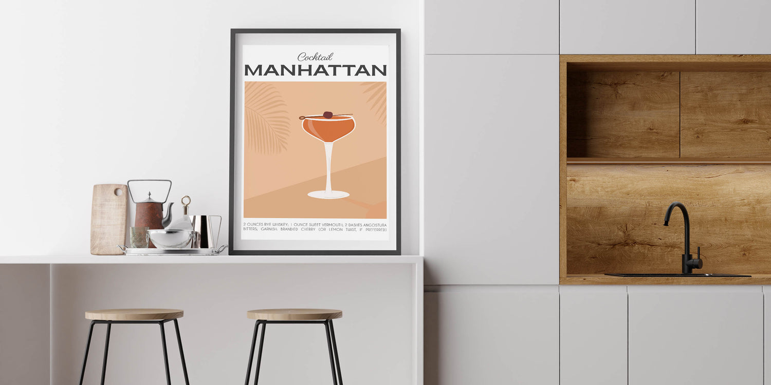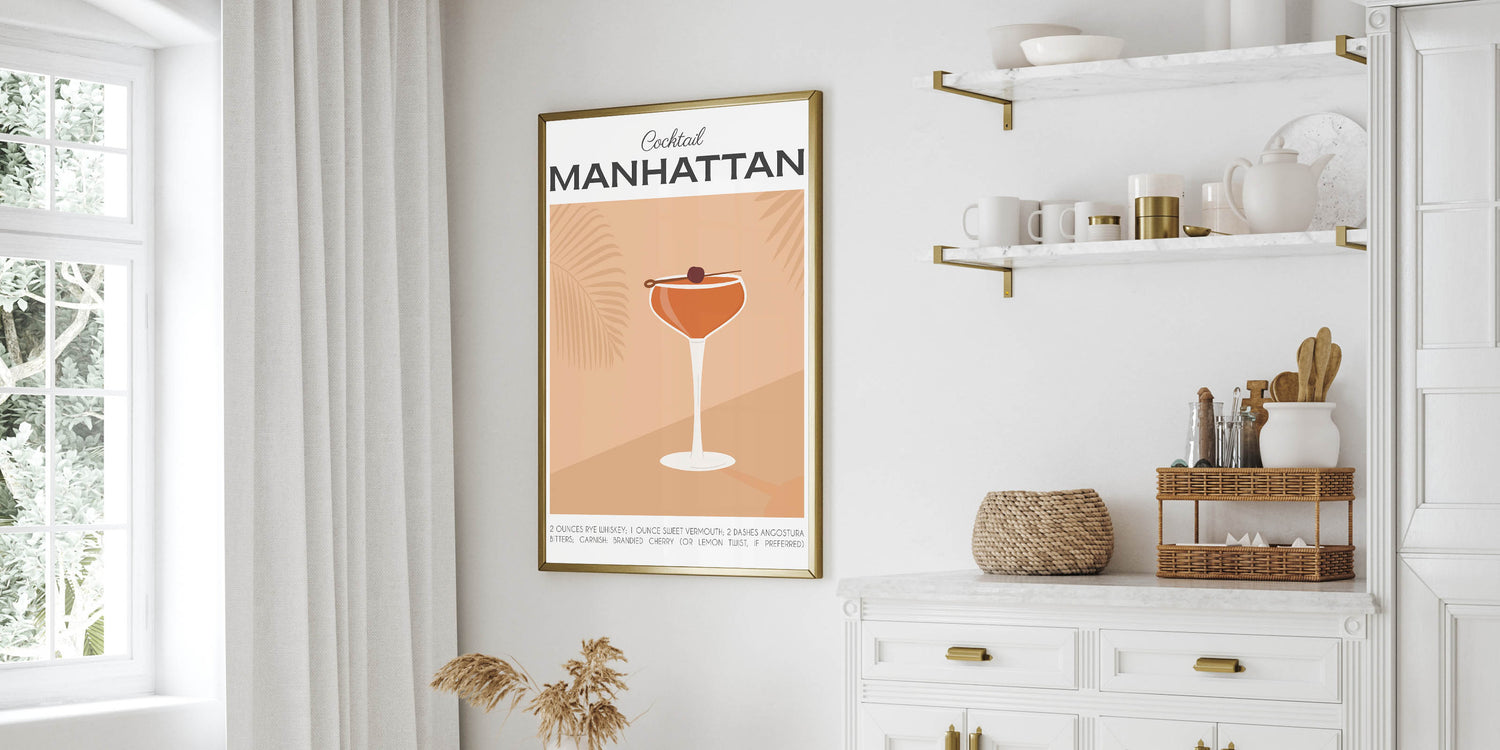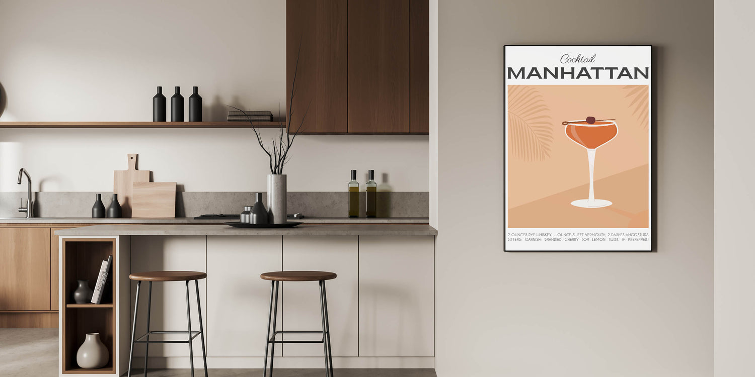 This cocktail art print is a stylish and timeless way to elevate your bar wall art. Whether you’re upgrading your kitchen decor or looking for unique cocktail art prints, this Manhattan cocktail print brings a classic touch to your walls.