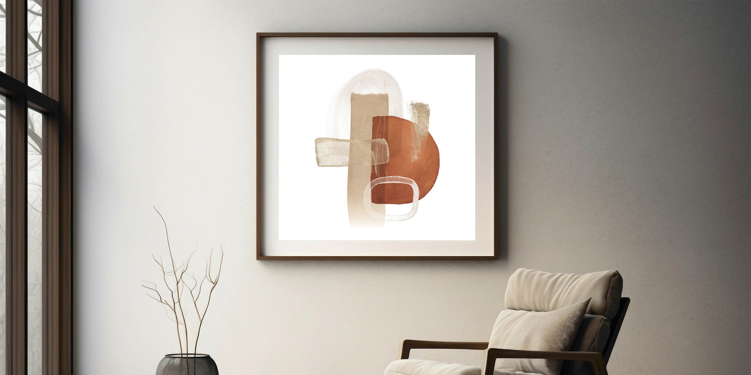 Add a touch of elegance to your home or office with this high-quality geometric minimalist abstract wall art. Featuring warm earthy tones of terracotta, beige, and gold, this piece effortlessly combines organic shapes and soft textures to create a harmonious, contemporary look that fits a variety of interior styles.