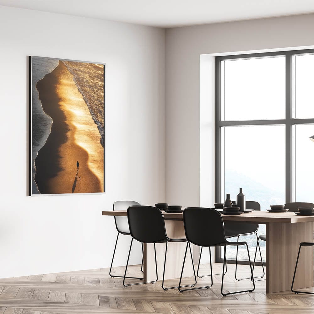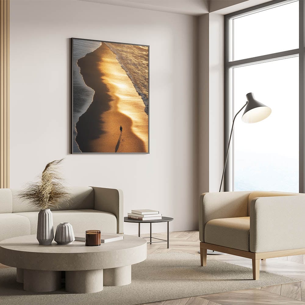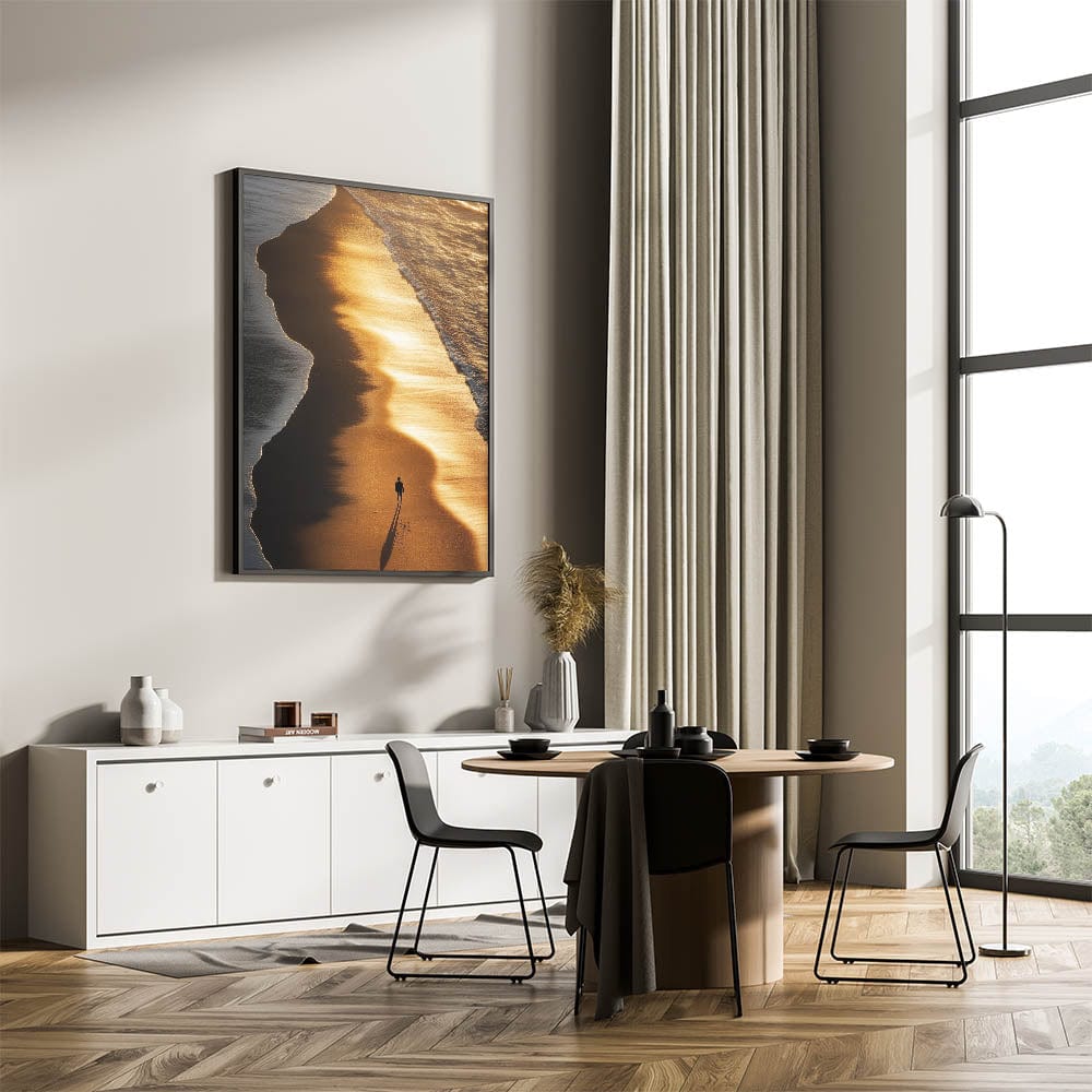 This Minimalist Coastal Landscape Art captures a breathtaking solitary walk along a sunlit shoreline, where golden reflections dance on the sand and waves. The warm hues of sunset contrast beautifully with the deep shadows, creating a Modern Minimalist Landscape Print that evokes serenity, reflection, and timeless elegance.