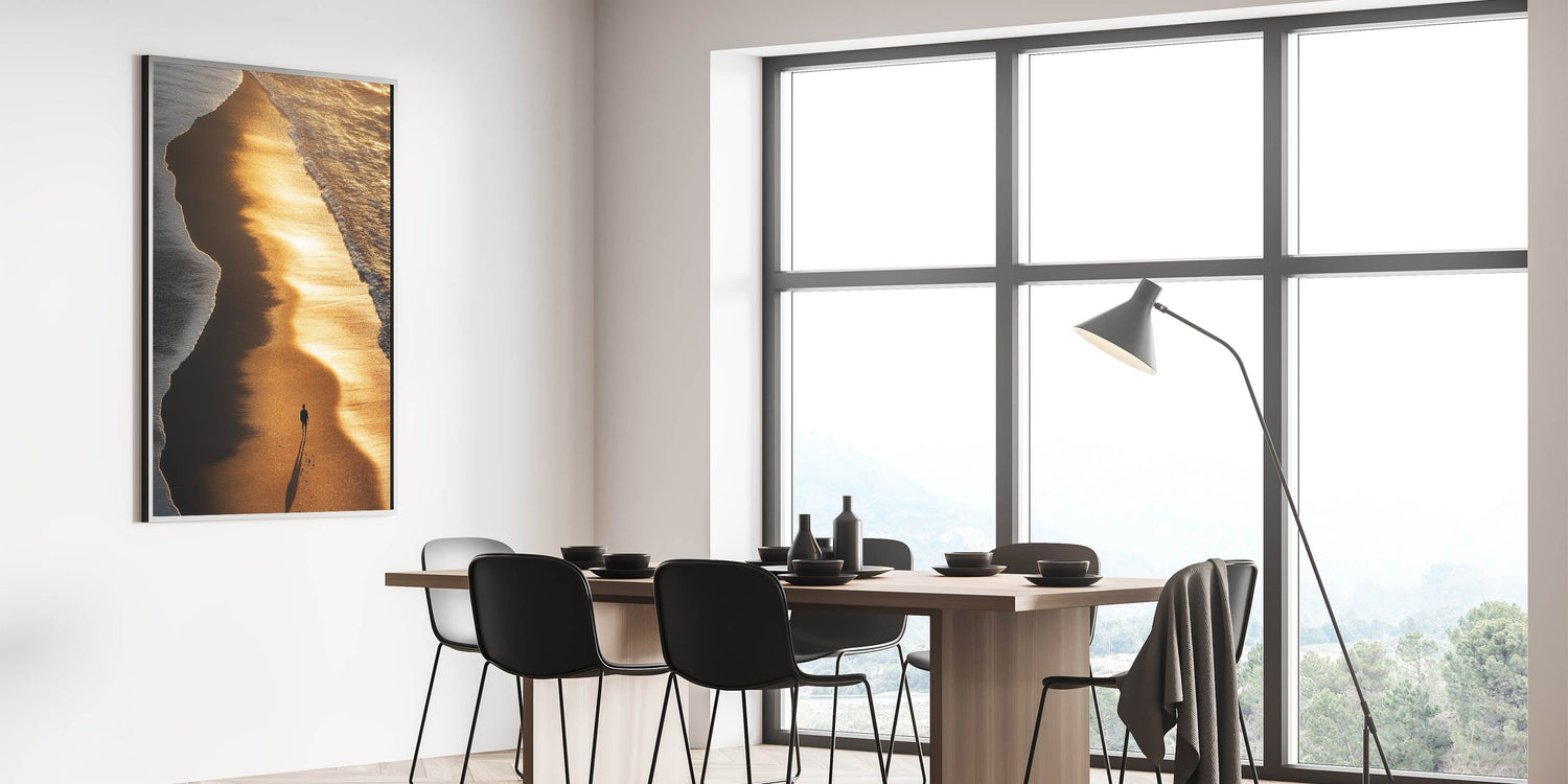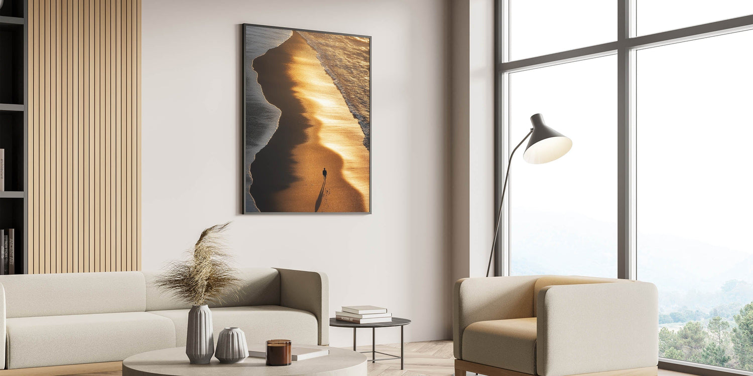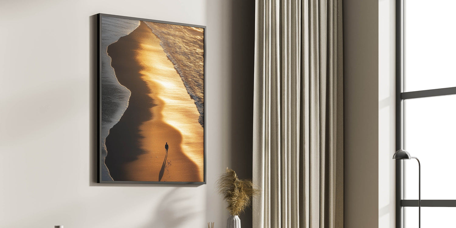 This Minimalist Coastal Landscape Art captures a breathtaking solitary walk along a sunlit shoreline, where golden reflections dance on the sand and waves. The warm hues of sunset contrast beautifully with the deep shadows, creating a Modern Minimalist Landscape Print that evokes serenity, reflection, and timeless elegance.