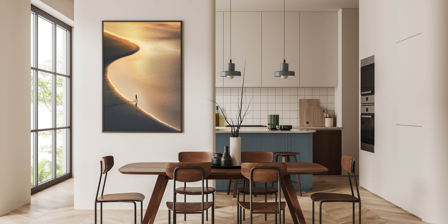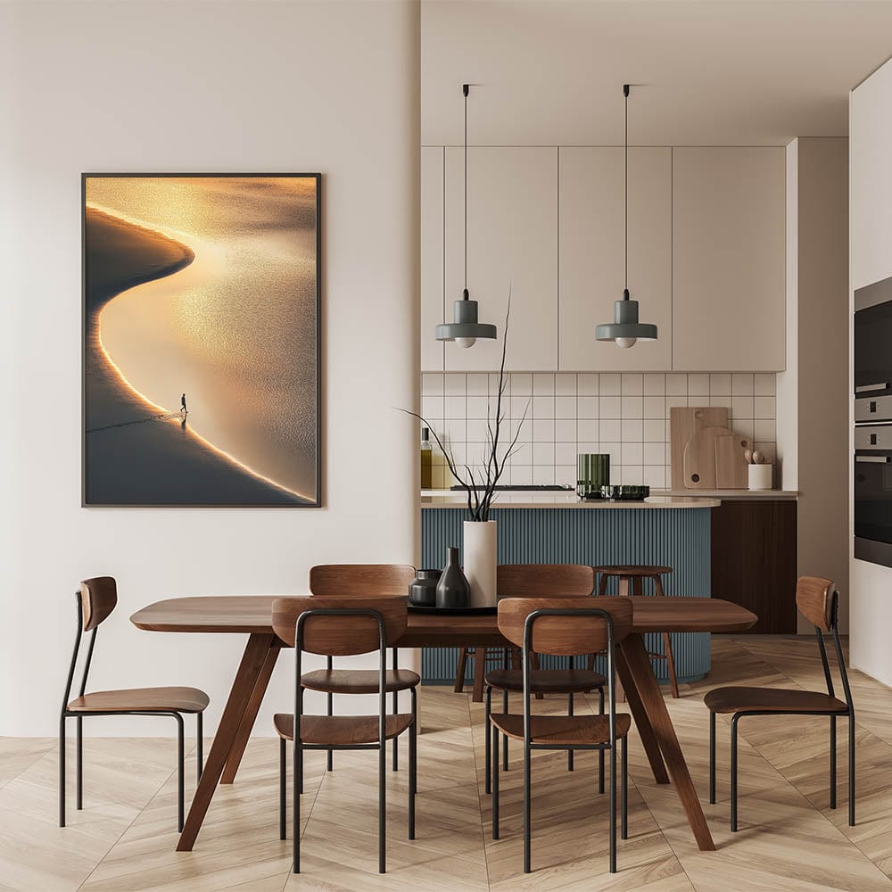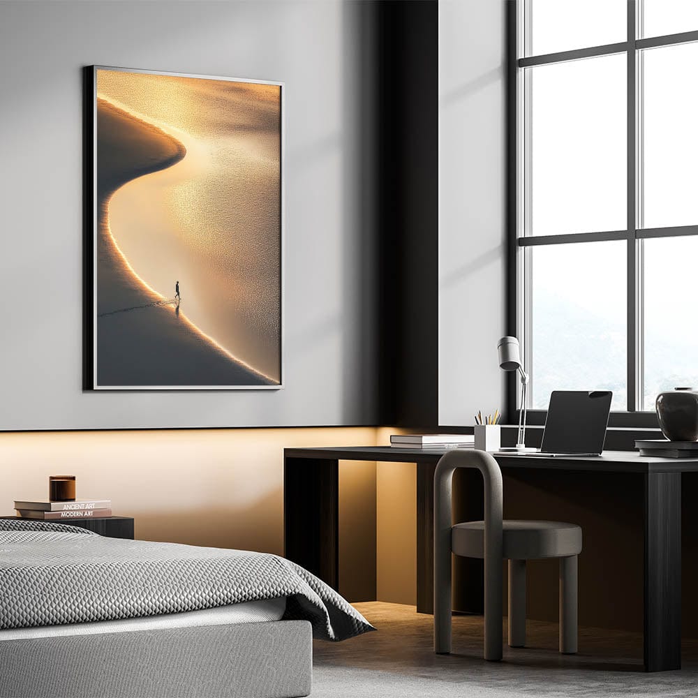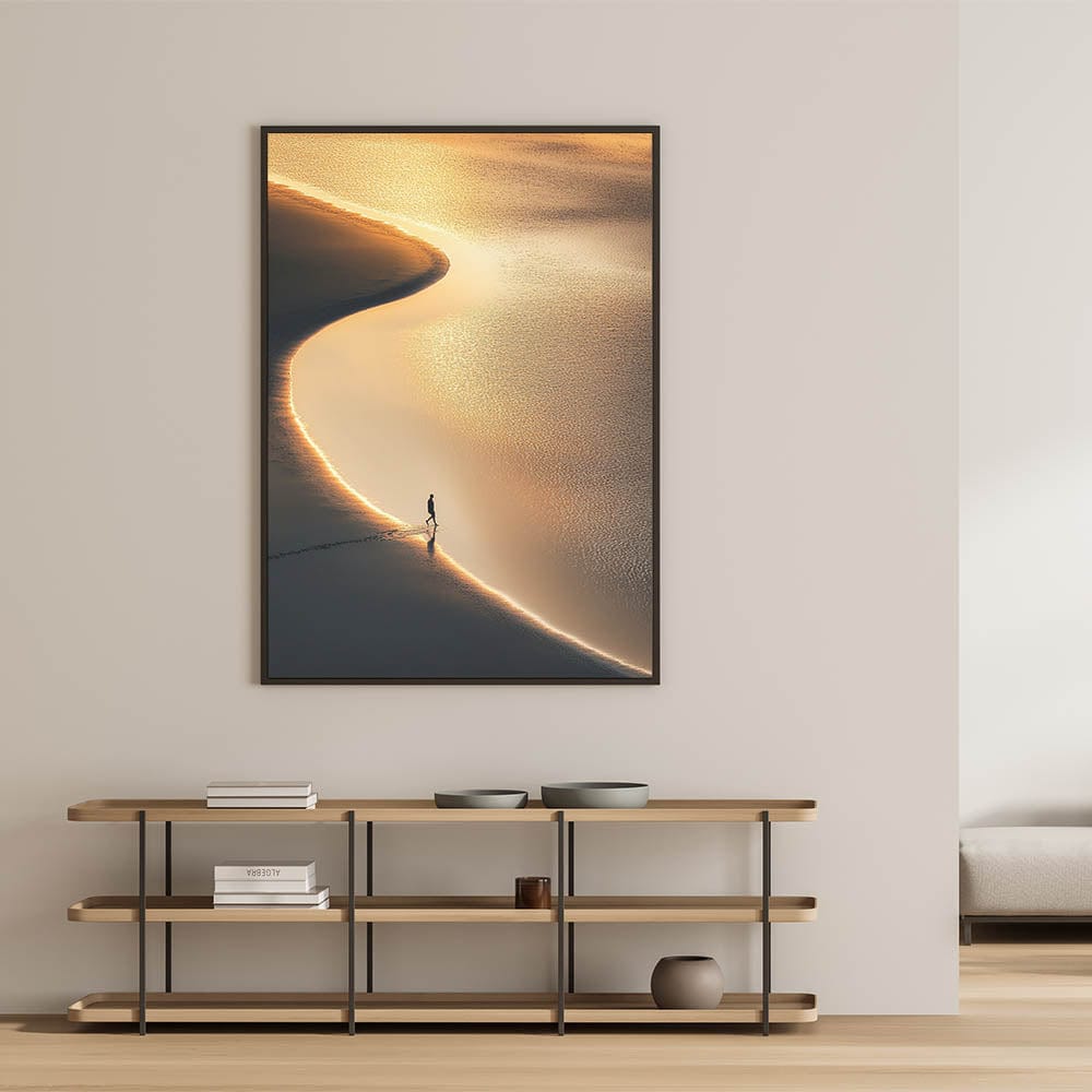 This Minimalist Horizon Art captures a breathtaking golden coastal sunset, where a lone figure walks along the shimmering shoreline. The soft glow of sunlight reflecting off the water creates a Modern Minimalist Landscape Print that embodies peace, solitude, and the beauty of nature’s simplicity.