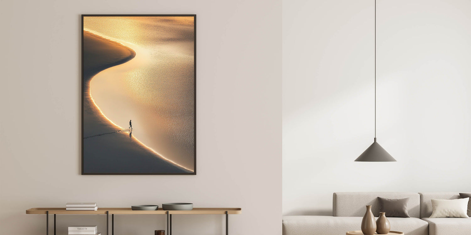 - High-quality minimalist scenic art print with a tranquil golden seascape