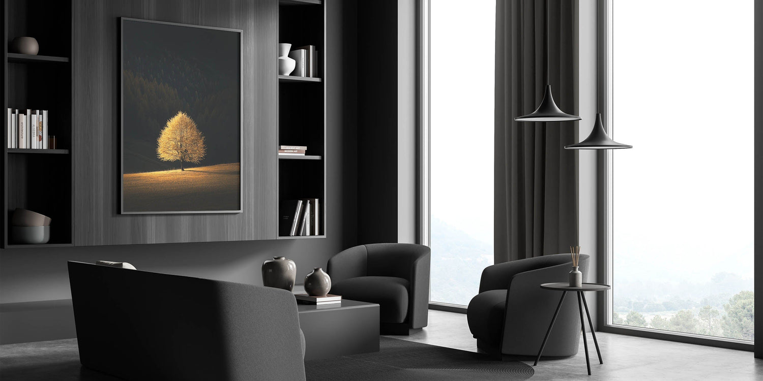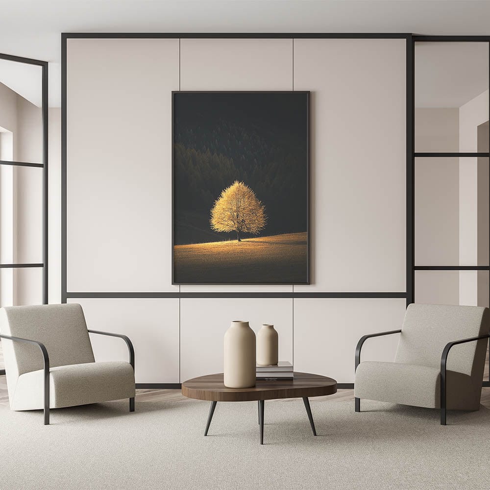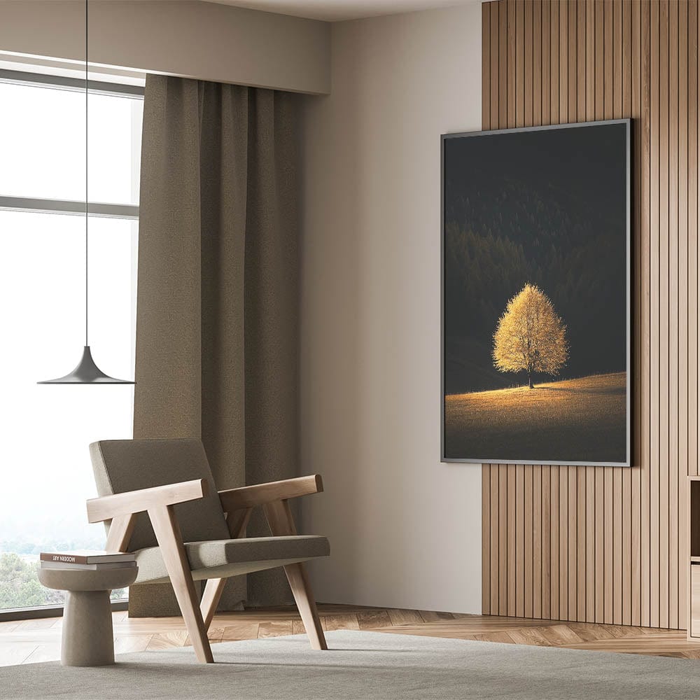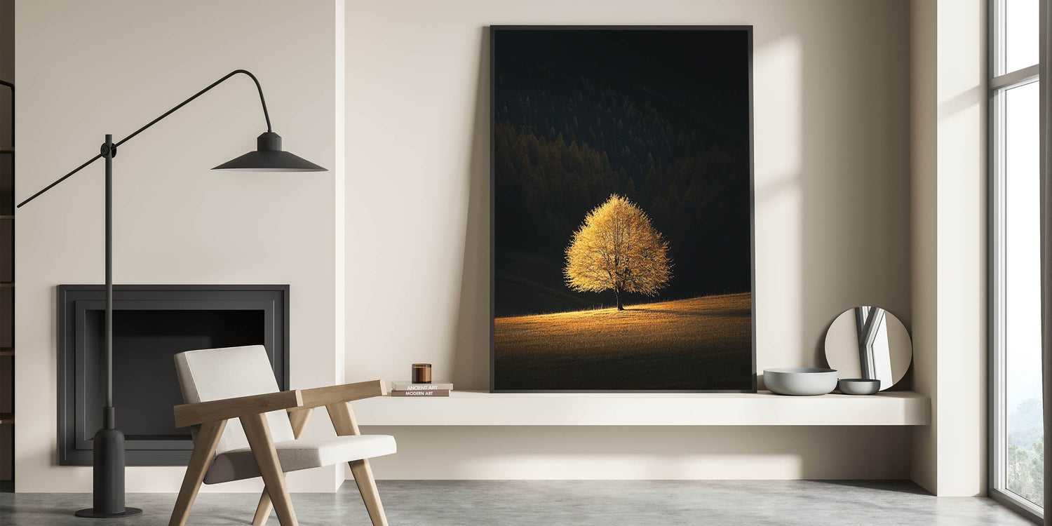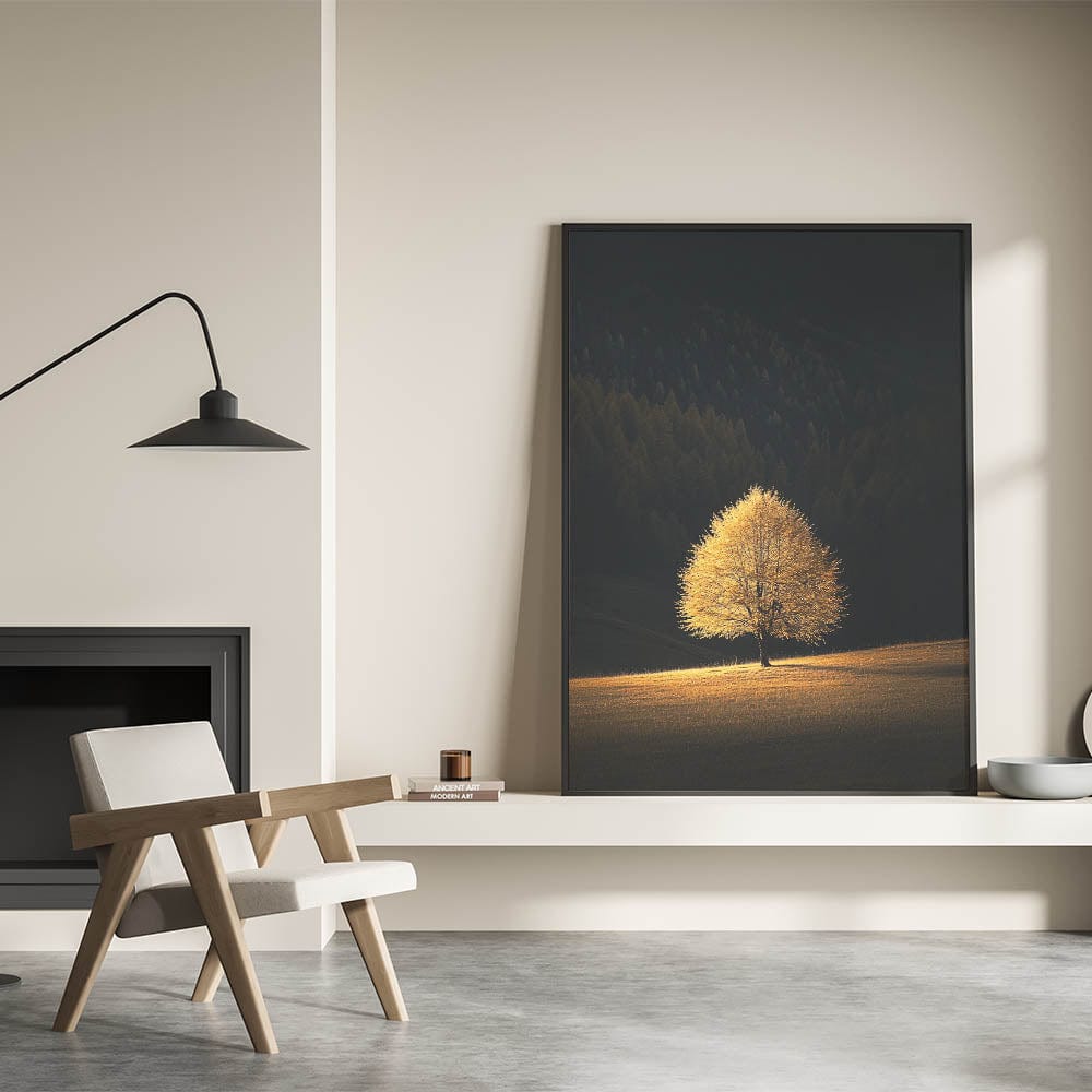 This Minimalist Mountain Wall Art captures the solitary beauty of a golden tree bathed in sunlight, standing against a deep forest backdrop. The dramatic contrast between light and shadow creates a Modern Minimalist Landscape Print that conveys warmth, solitude, and tranquility.
