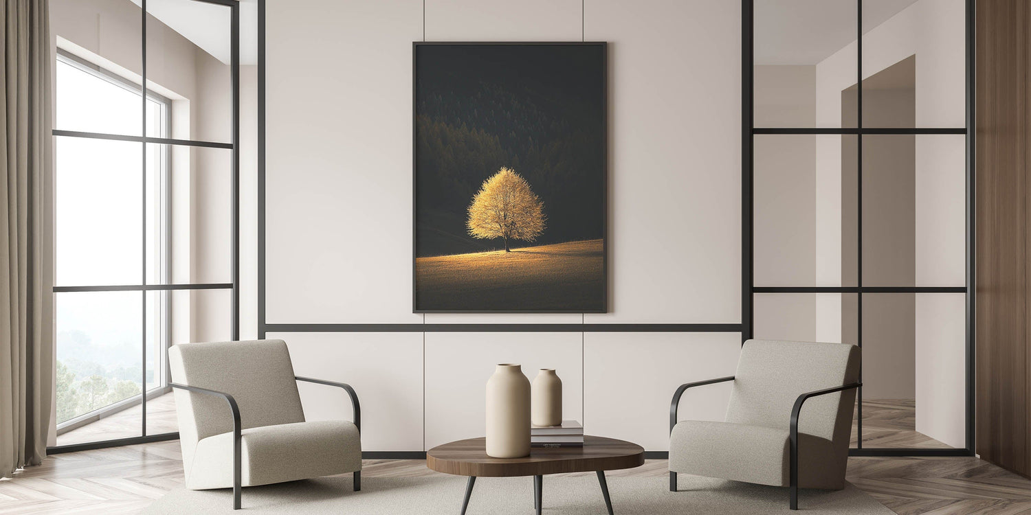 - High-quality minimalist scenic art print featuring a striking golden tree
