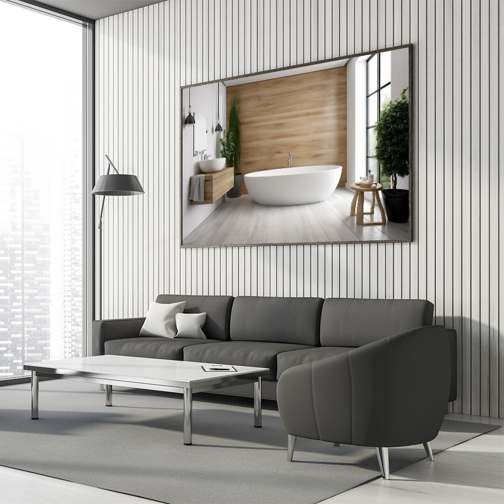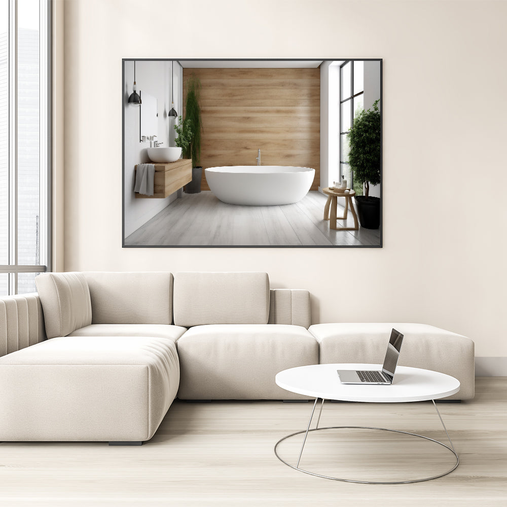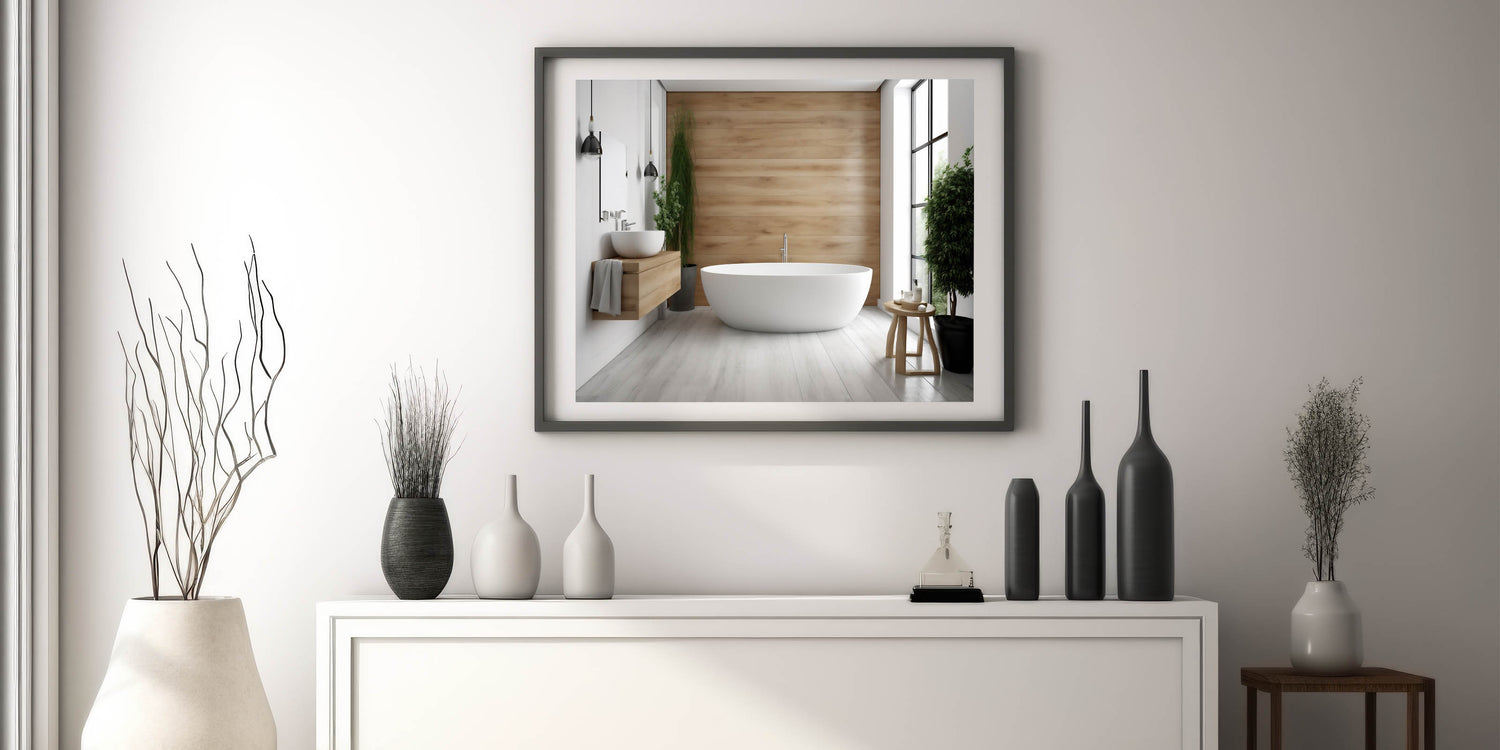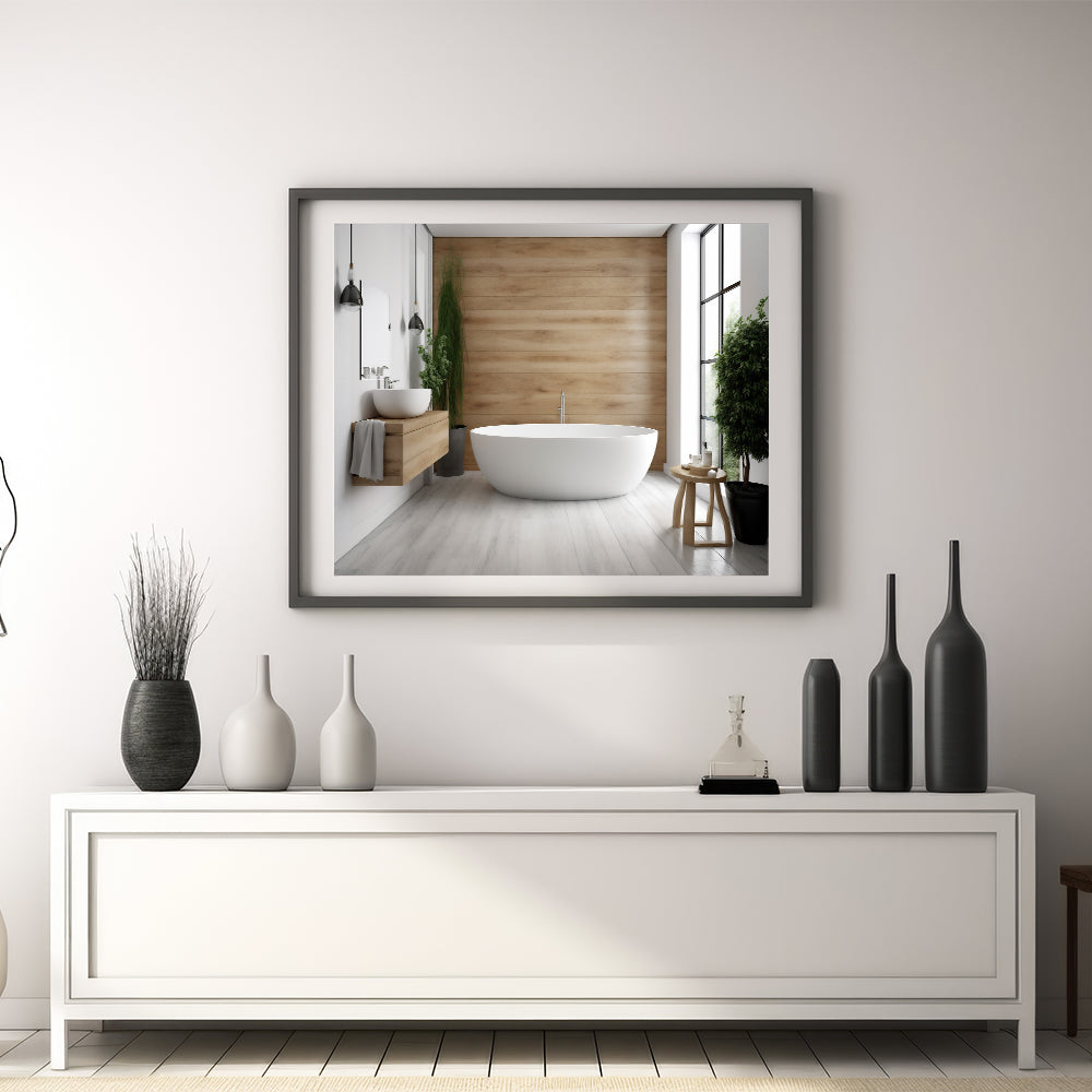 Transform your bathroom into a serene oasis with our Modern Interior Design Canvas Print. This exquisite piece of interiors wall art features a minimalist bathroom scene, showcasing a luxurious freestanding tub against a backdrop of warm wooden paneling. Perfect for those who appreciate architectural wall art, this print effortlessly enhances your home interior decor with its calming and contemporary design.