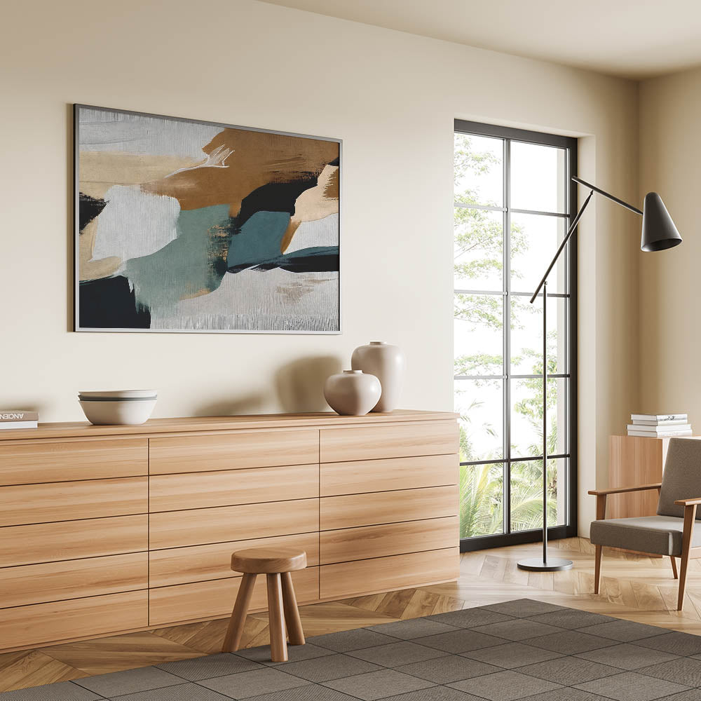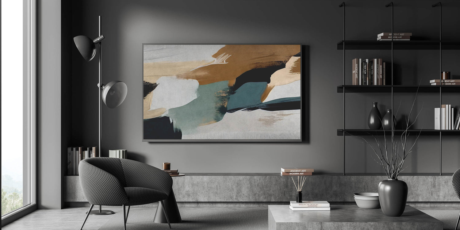 Elevate your space with this striking Modern Strokes and Lines Abstract Art. This captivating piece showcases a harmonious blend of dynamic brush strokes and geometric shapes, creating a perfect balance between contemporary design and artistic expression. The design features earthy tones with a mix of dark and muted colors, making it a versatile addition to any room.