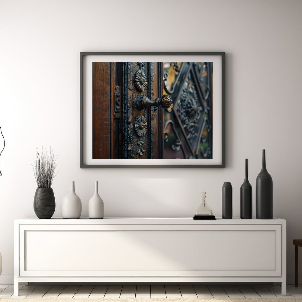 Enhance your decor with this exquisite ornate door hardware wall art. The intricate design of the door handle and surrounding metalwork captures the essence of vintage craftsmanship, making this piece a stunning addition to any space. The detailed textures and rich tones offer a timeless appeal that blends perfectly with both classic and modern interiors.