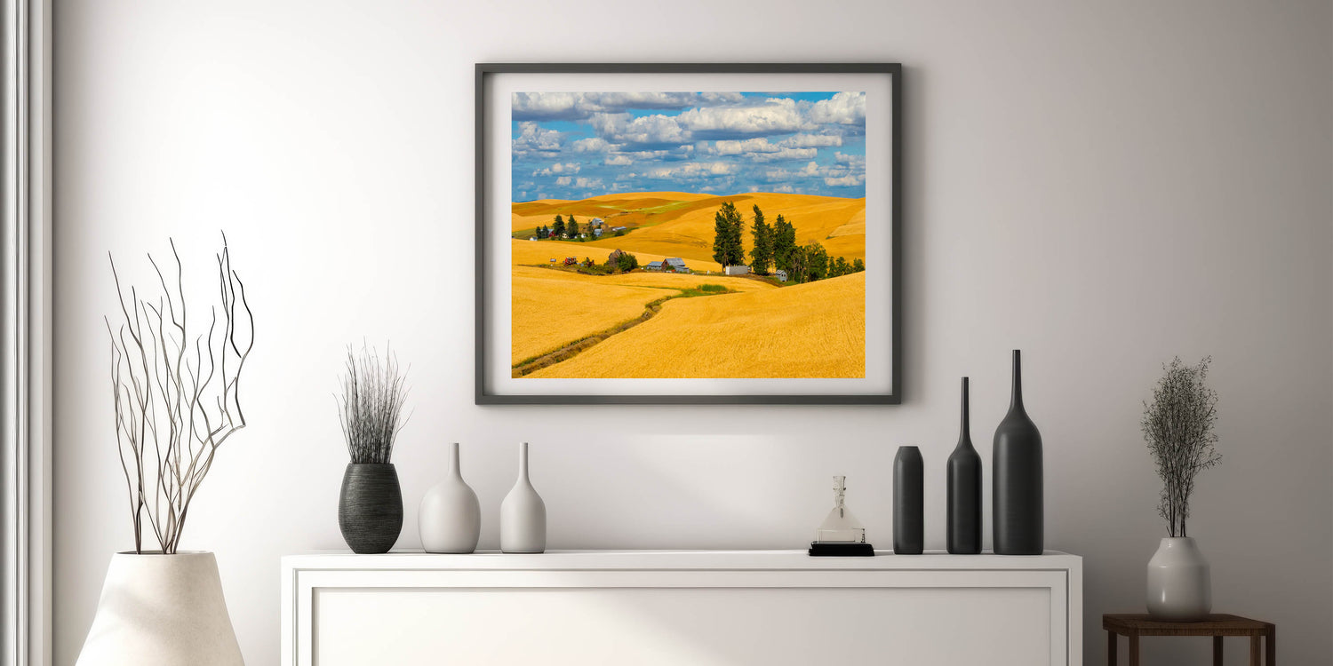 Celebrate the golden beauty of Washington's Palouse region with this stunning artwork, featuring rolling wheat fields and rustic farmhouses under a bright blue sky. This landscape art captures the essence of rural life, with vibrant golden hues and the warm tones of the farmland blending into the horizon. Whether you're a nature enthusiast or simply looking for a captivating piece to enhance your space, this Palouse photography will bring warmth and charm to any room.