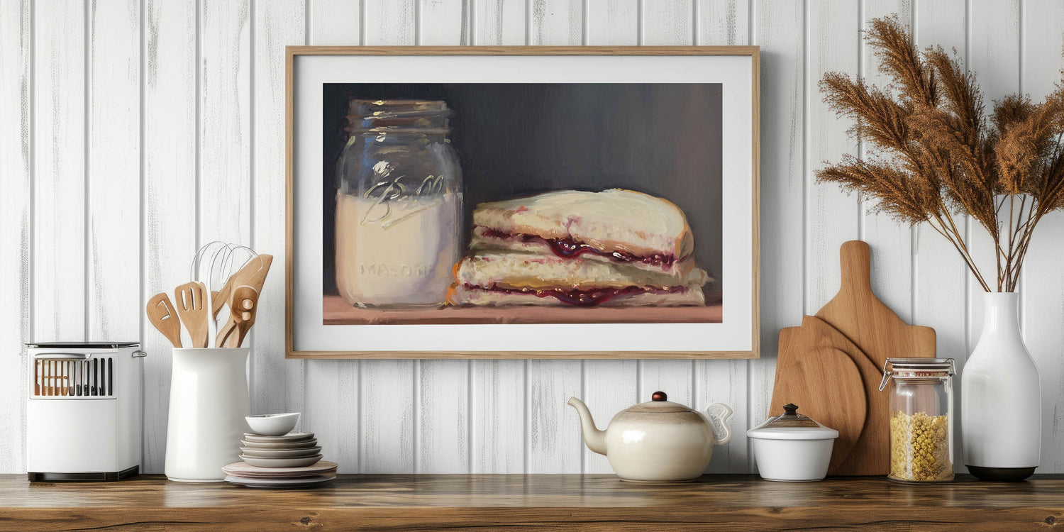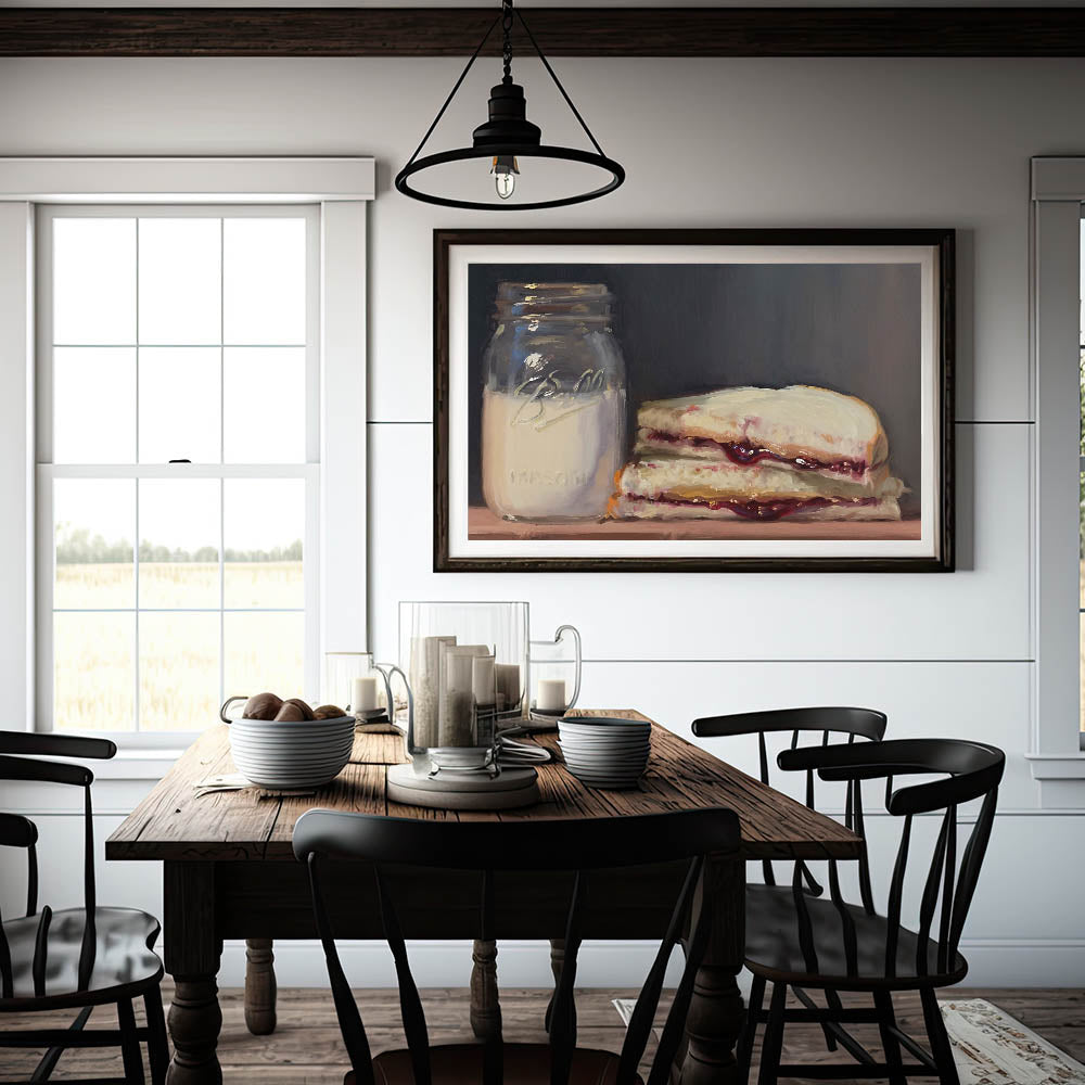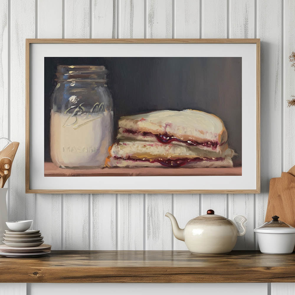 Celebrate the nostalgia of a classic treat with this beautifully detailed bakery art print, featuring a rich oil painting of a peanut butter and jelly sandwich alongside a rustic mason jar of milk. The deep, moody tones and lifelike textures bring warmth to any kitchen, bakery, or café setting.