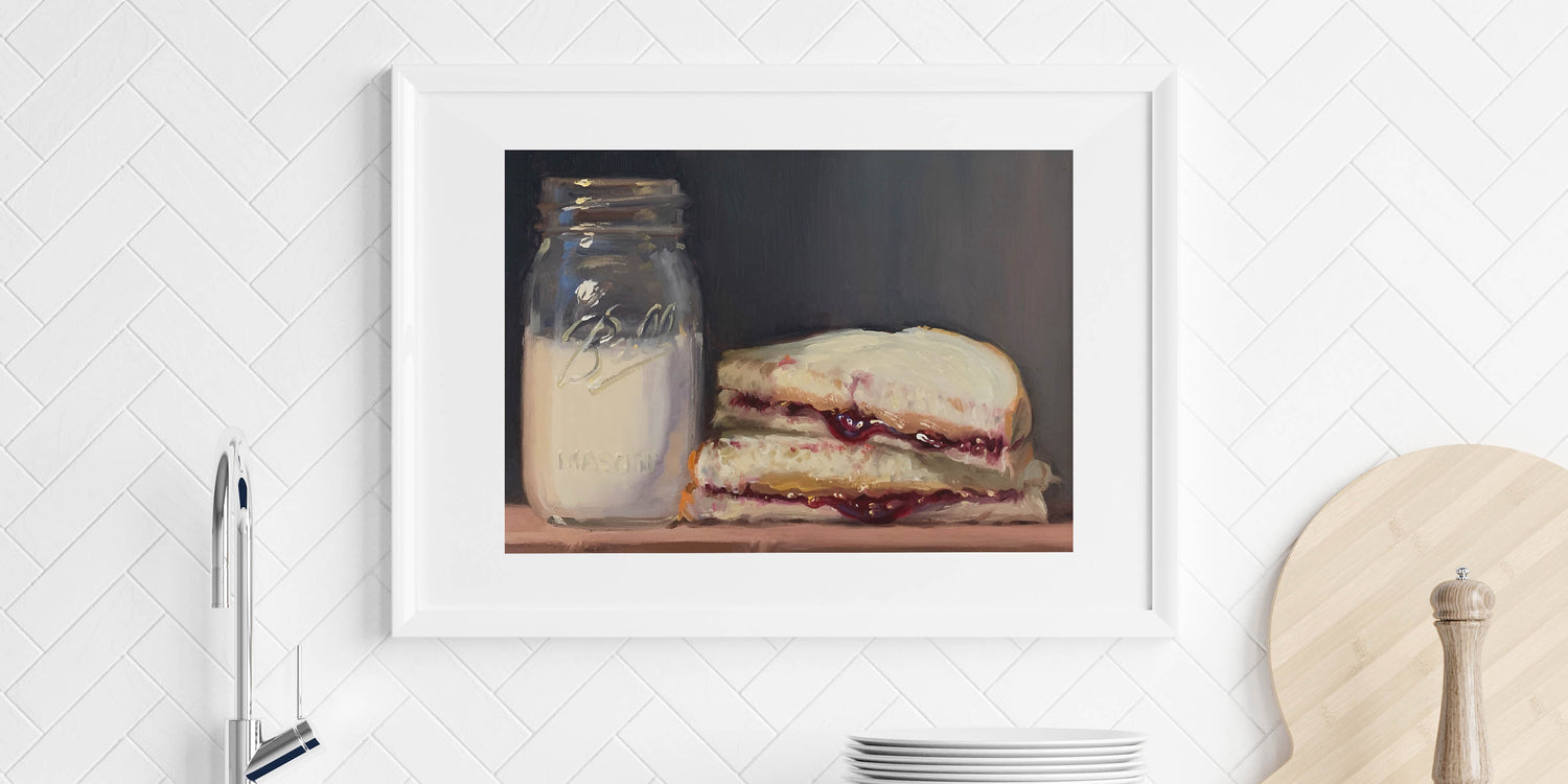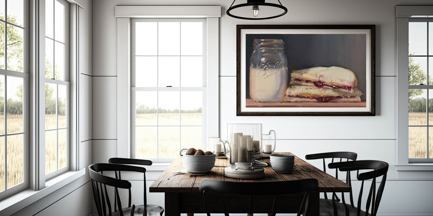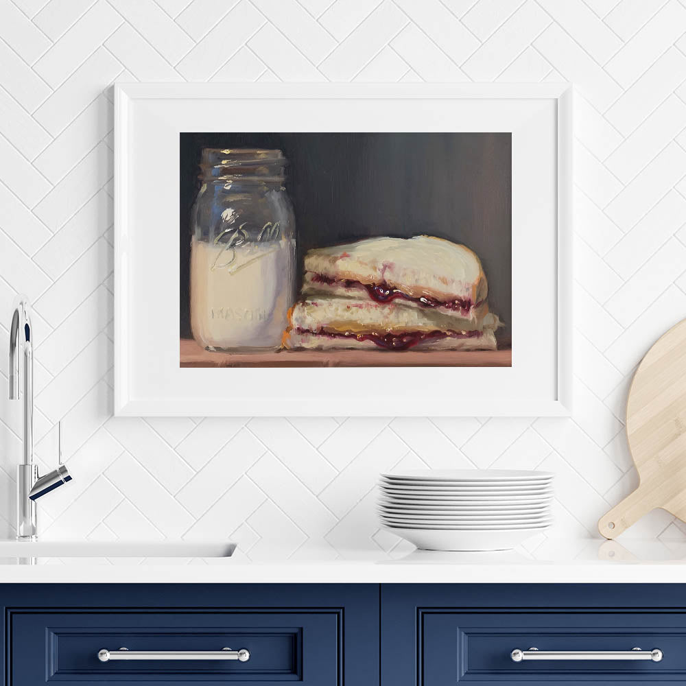 Celebrate the nostalgia of a classic treat with this beautifully detailed bakery art print, featuring a rich oil painting of a peanut butter and jelly sandwich alongside a rustic mason jar of milk. The deep, moody tones and lifelike textures bring warmth to any kitchen, bakery, or café setting.