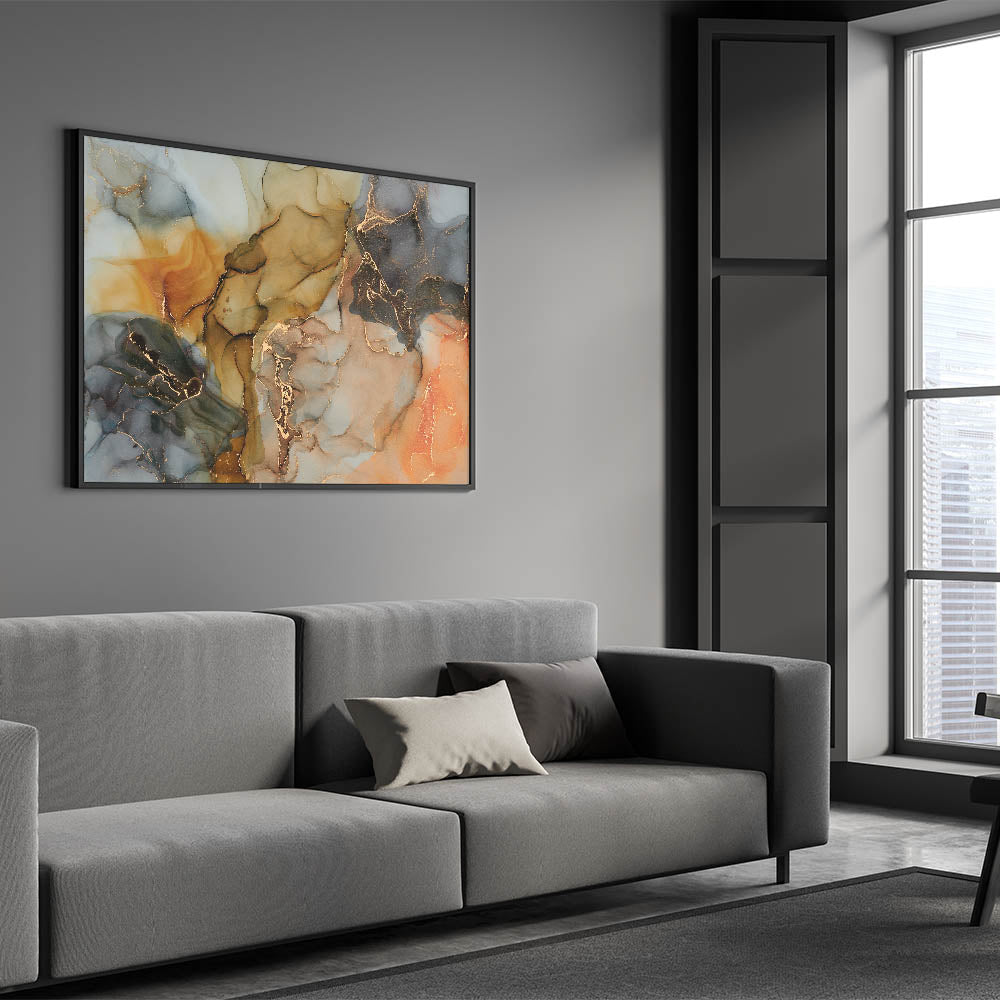 Immerse yourself in the timeless beauty of this premium abstract canvas print, a masterful composition of deep blue, warm gold, earthy brown, and burnt orange. Designed for those with refined taste, this luxury abstract wall art collection piece blends warm and cool tones, creating a captivating contrast of texture and depth. The fluid movement and metallic highlights make it a high-end abstract canvas print, perfect for sophisticated interiors.
