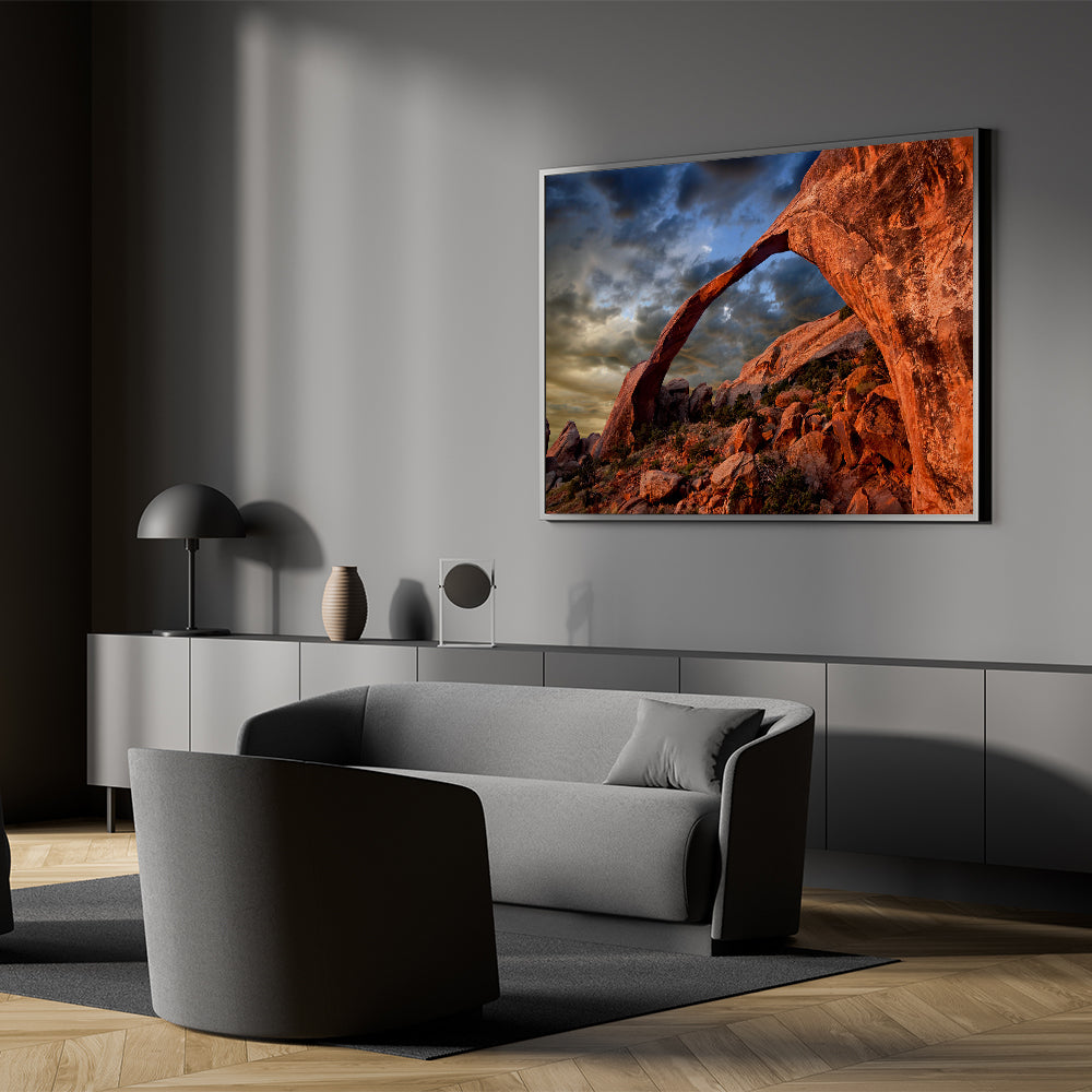 Transform your space with this powerful piece that celebrates the majestic landscapes of the desert. Whether displayed as a canvas print or in a sleek acrylic glass frame, this artwork is designed to impress and inspire. Let the beauty of the red rock arch add a bold, natural element to your decor.