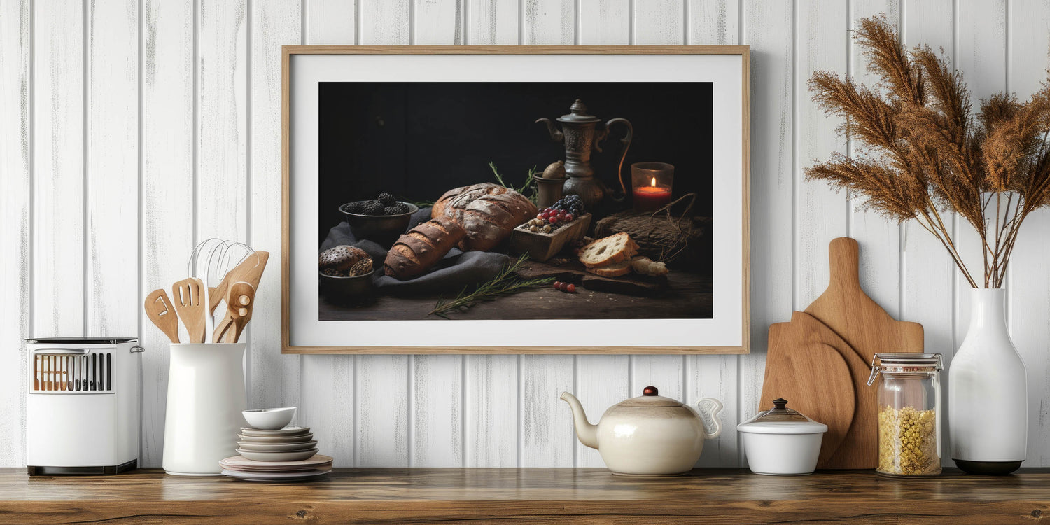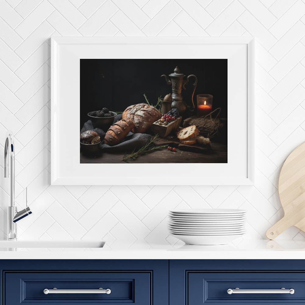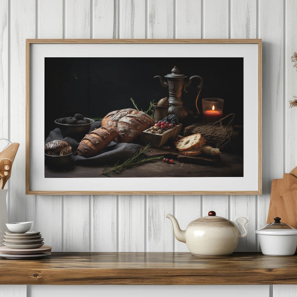Add a timeless touch to your kitchen with this fruit canvas art, featuring a beautifully arranged still life of rustic bread, blackberries, grapes, and a vintage teapot. The warm, earthy brown and dark blue tones create an inviting and cozy aesthetic, making this piece a perfect addition to kitchen fruit decor. The soft candlelight and antique elements enhance the old-world charm, making it ideal for farmhouse kitchens, bakeries, and rustic-themed interiors.