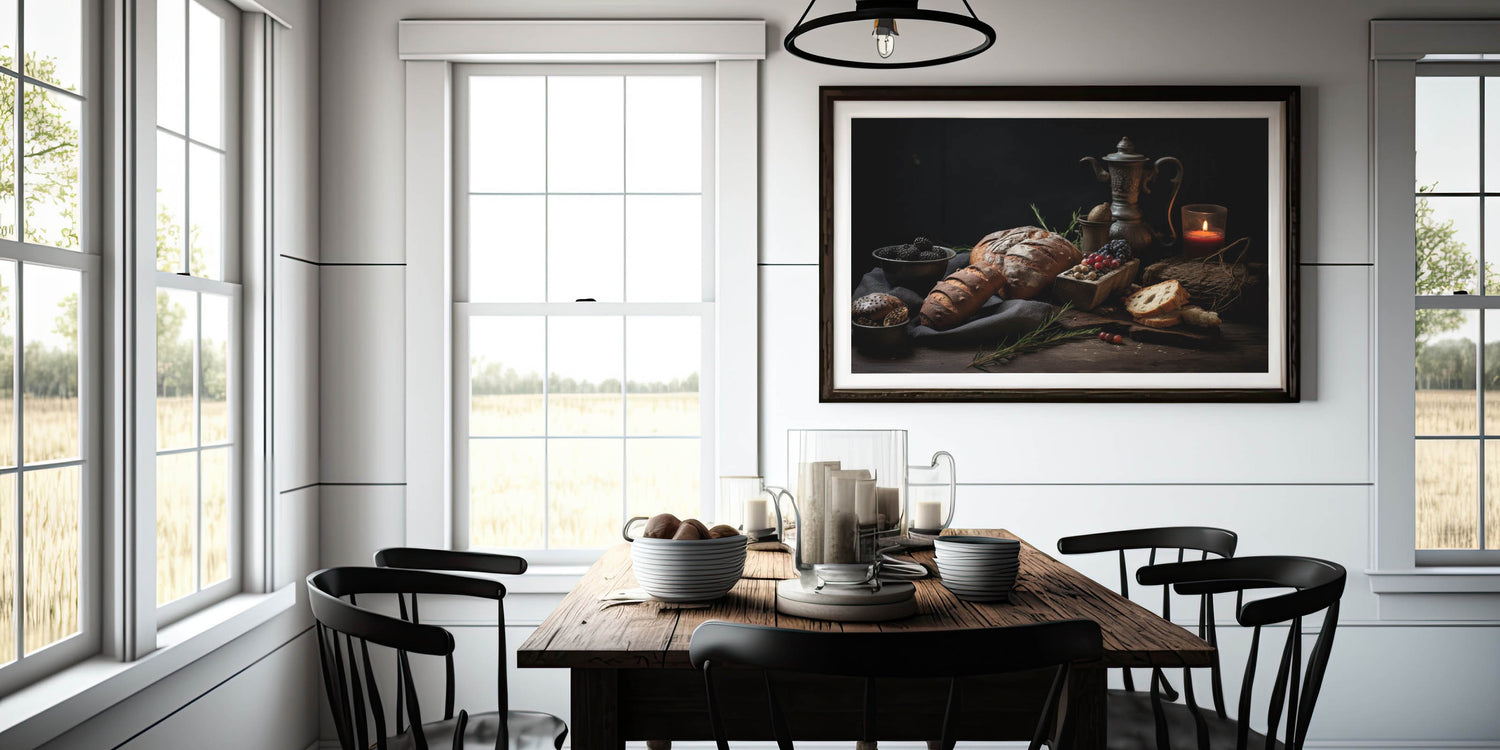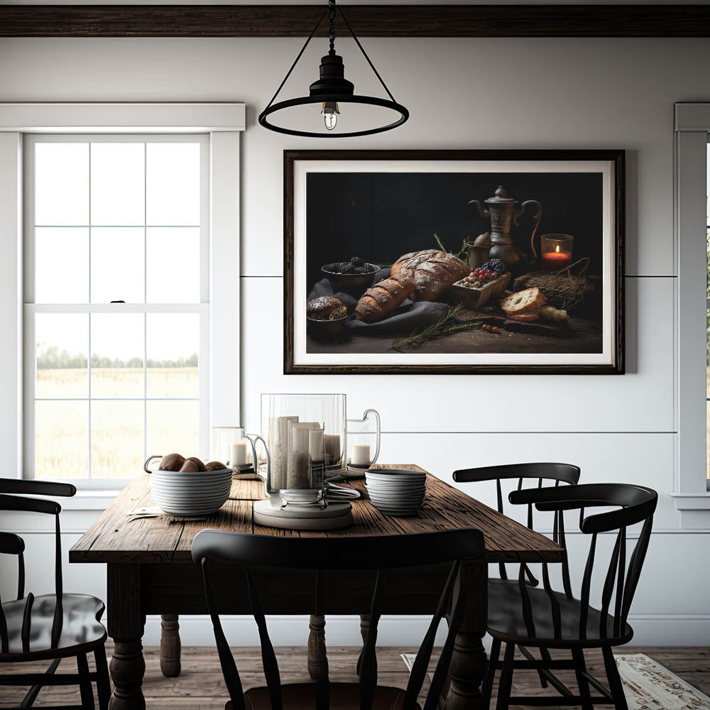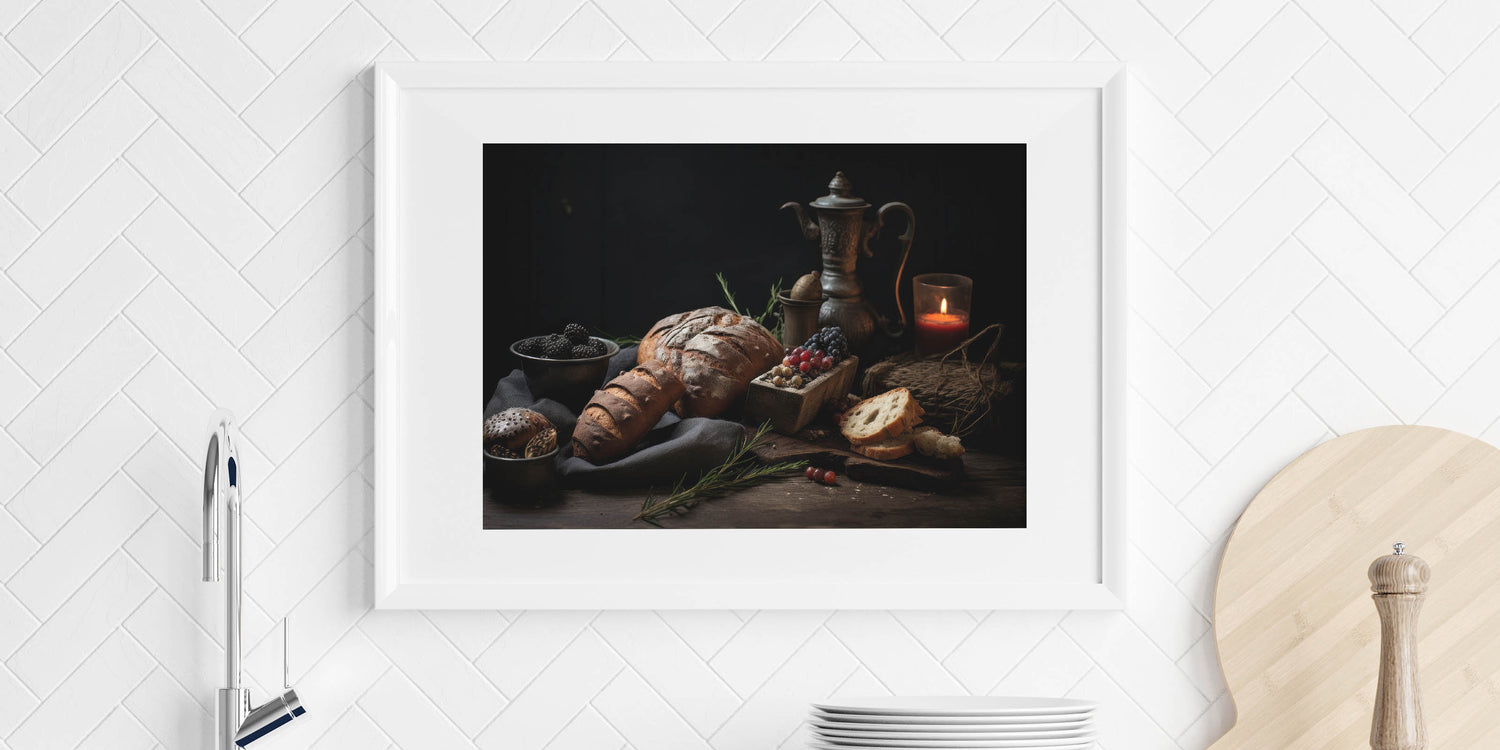 Add a timeless touch to your kitchen with this fruit canvas art, featuring a beautifully arranged still life of rustic bread, blackberries, grapes, and a vintage teapot. The warm, earthy brown and dark blue tones create an inviting and cozy aesthetic, making this piece a perfect addition to kitchen fruit decor. The soft candlelight and antique elements enhance the old-world charm, making it ideal for farmhouse kitchens, bakeries, and rustic-themed interiors.