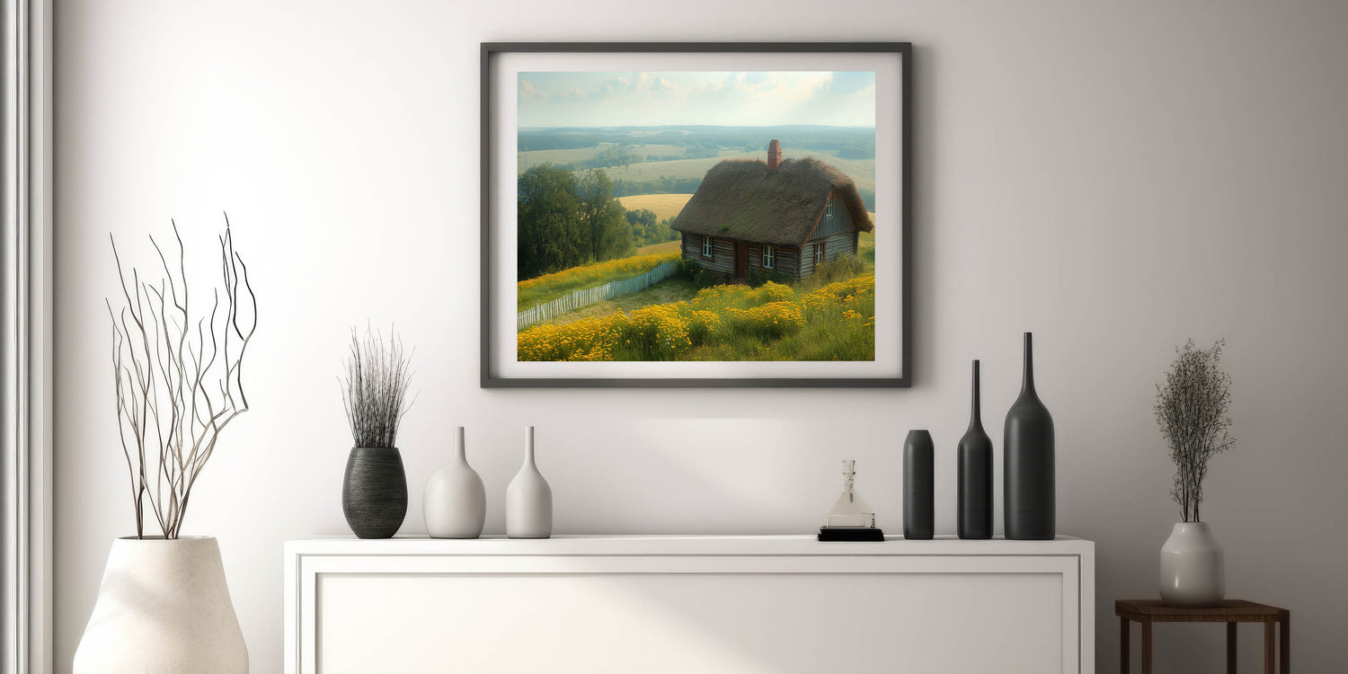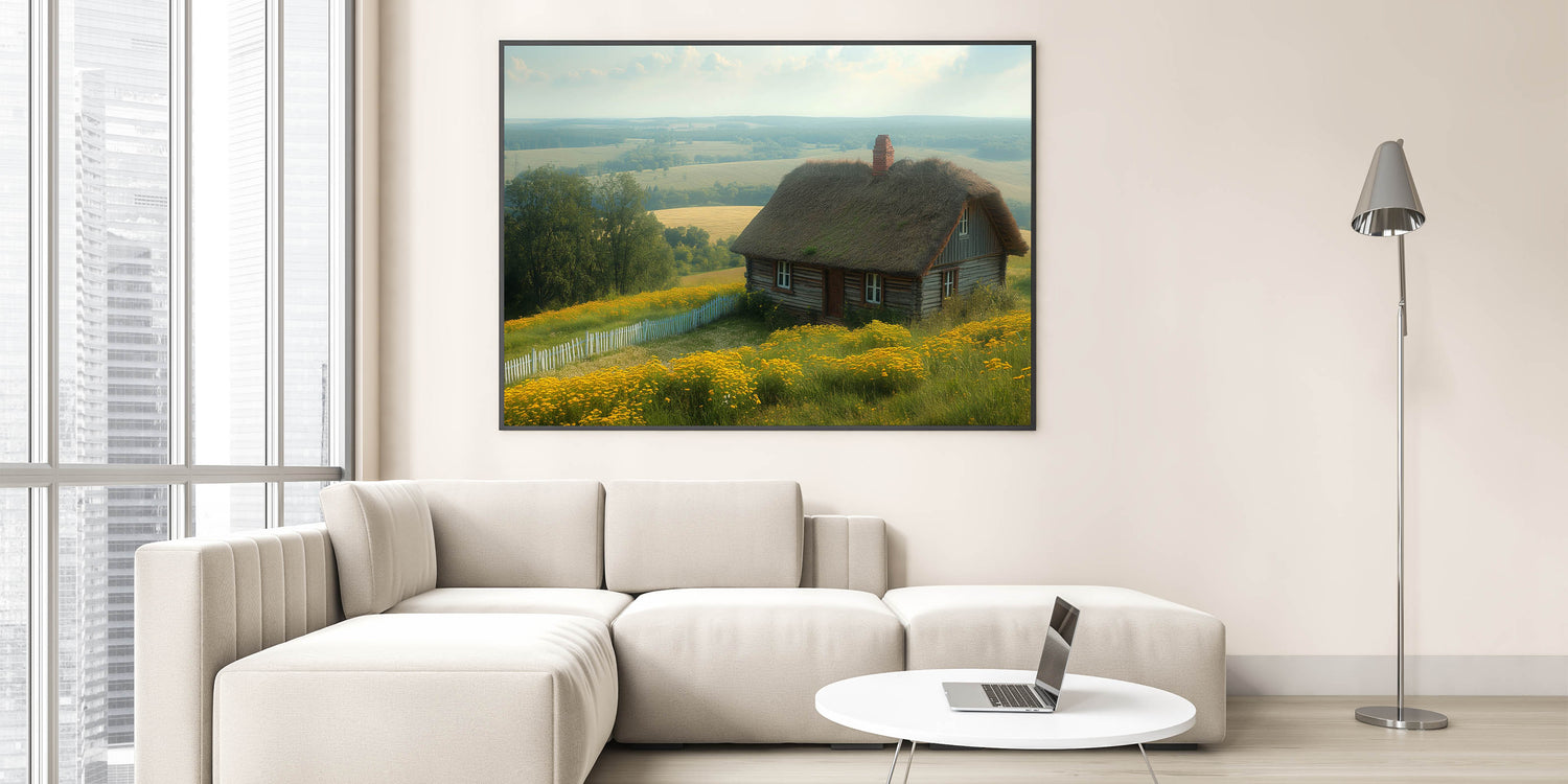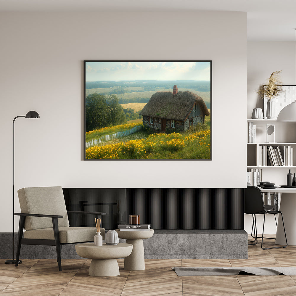 Capture the essence of rustic charm with this exquisite Country House Wall Art. This piece features a cozy wooden cottage set amidst rolling hills and vibrant yellow flowers, evoking a sense of tranquility and connection to nature. The soft hues of the landscape and the warm tones of the cottage create a peaceful ambiance, making it a perfect addition to any room looking for a touch of countryside elegance.