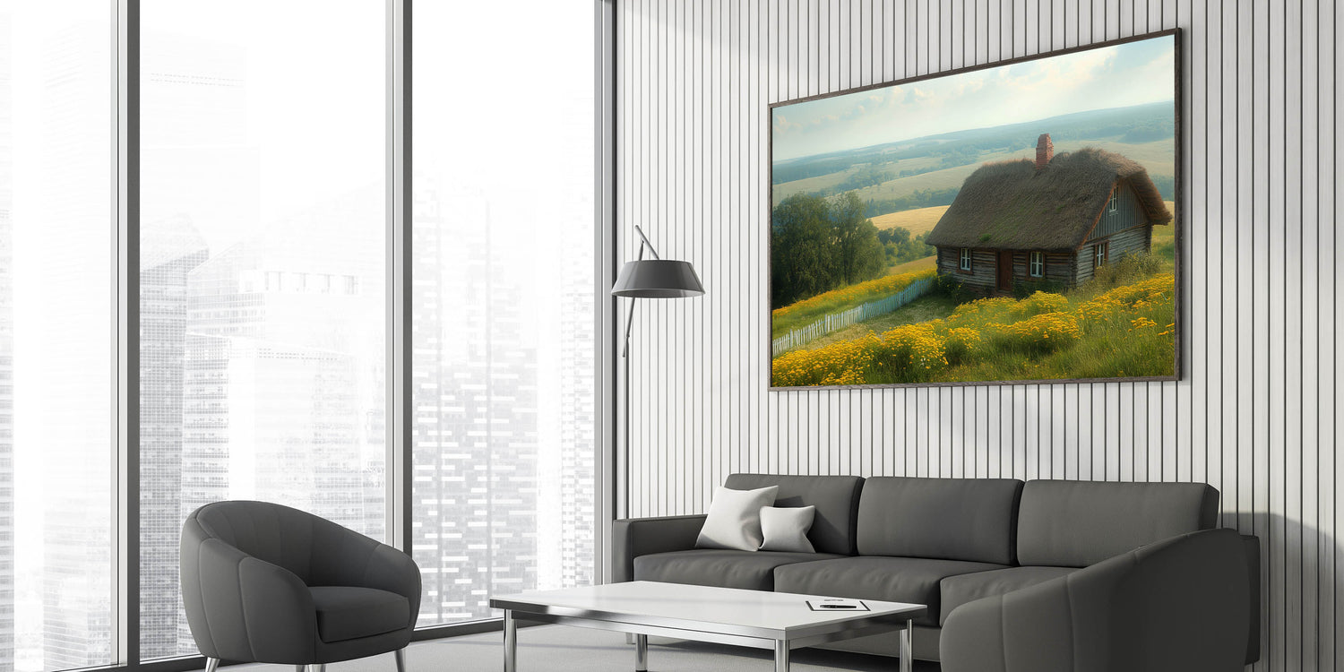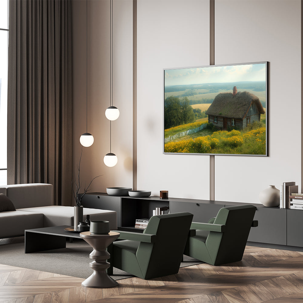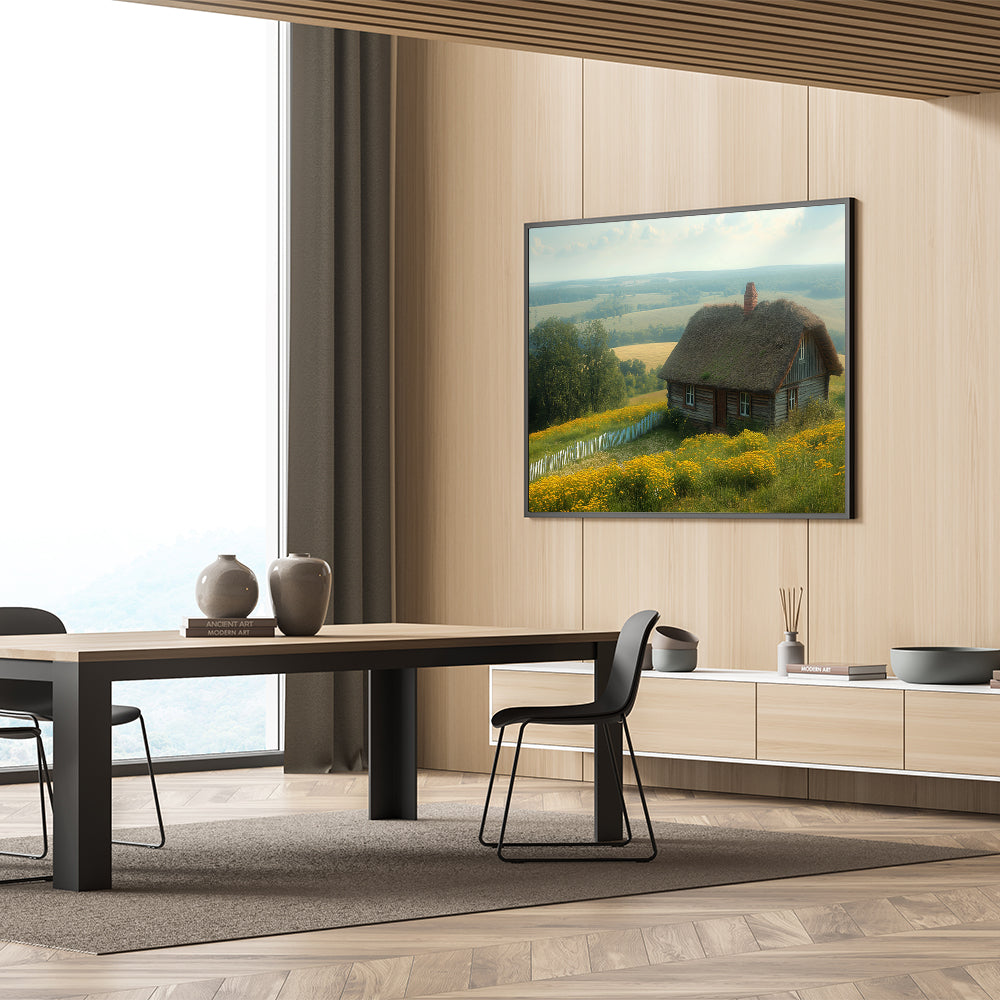 Capture the essence of rustic charm with this exquisite Country House Wall Art. This piece features a cozy wooden cottage set amidst rolling hills and vibrant yellow flowers, evoking a sense of tranquility and connection to nature. The soft hues of the landscape and the warm tones of the cottage create a peaceful ambiance, making it a perfect addition to any room looking for a touch of countryside elegance.