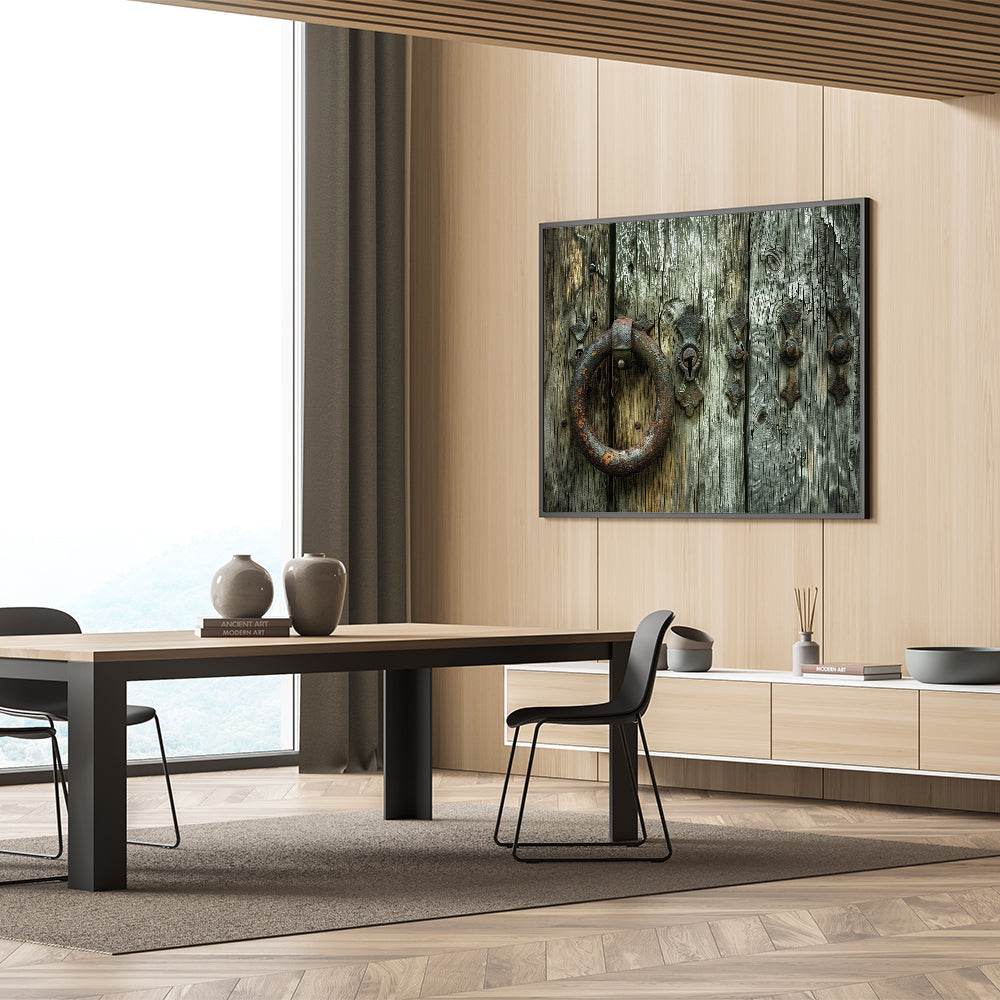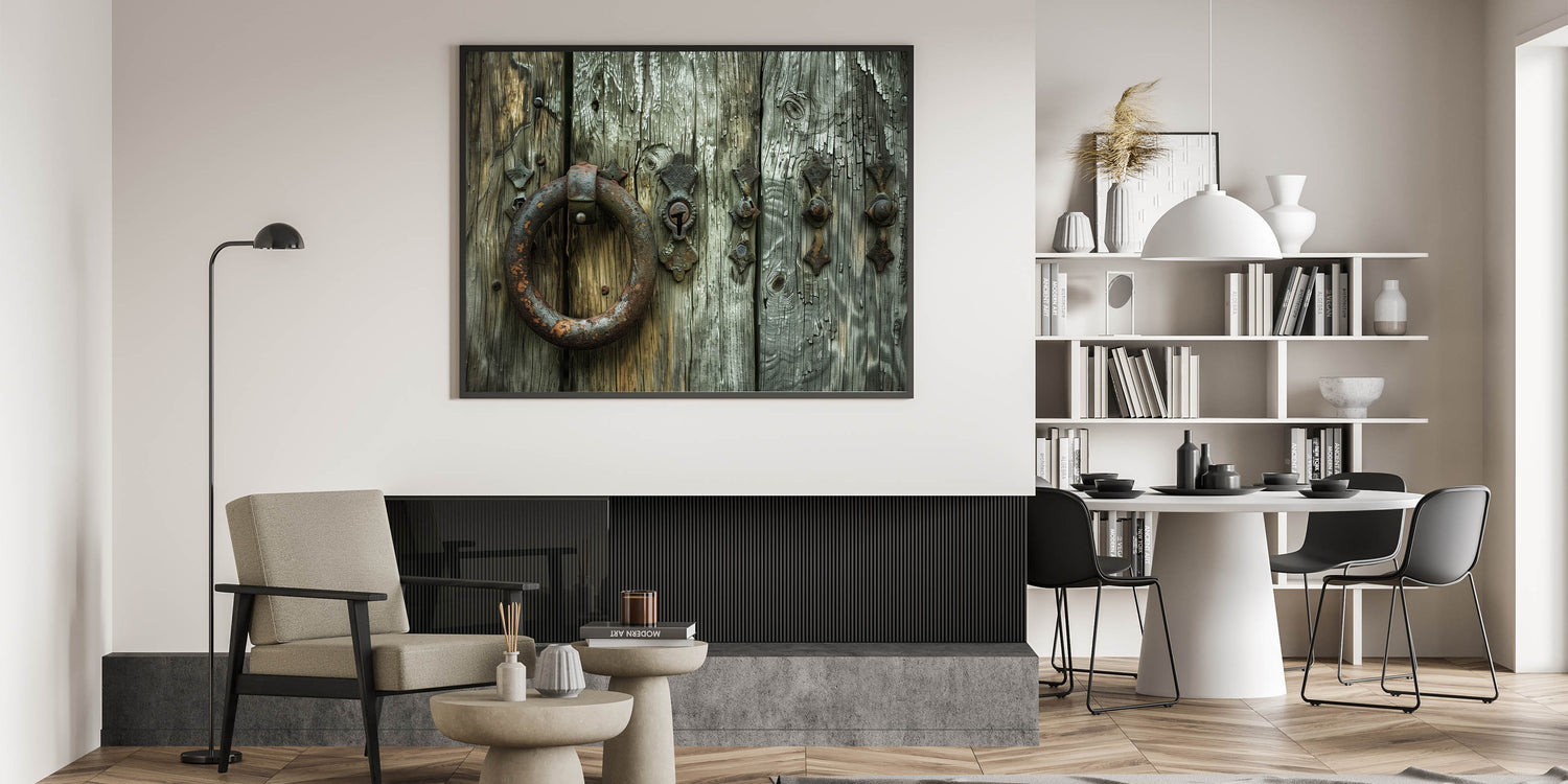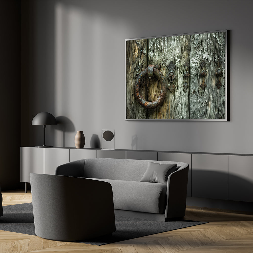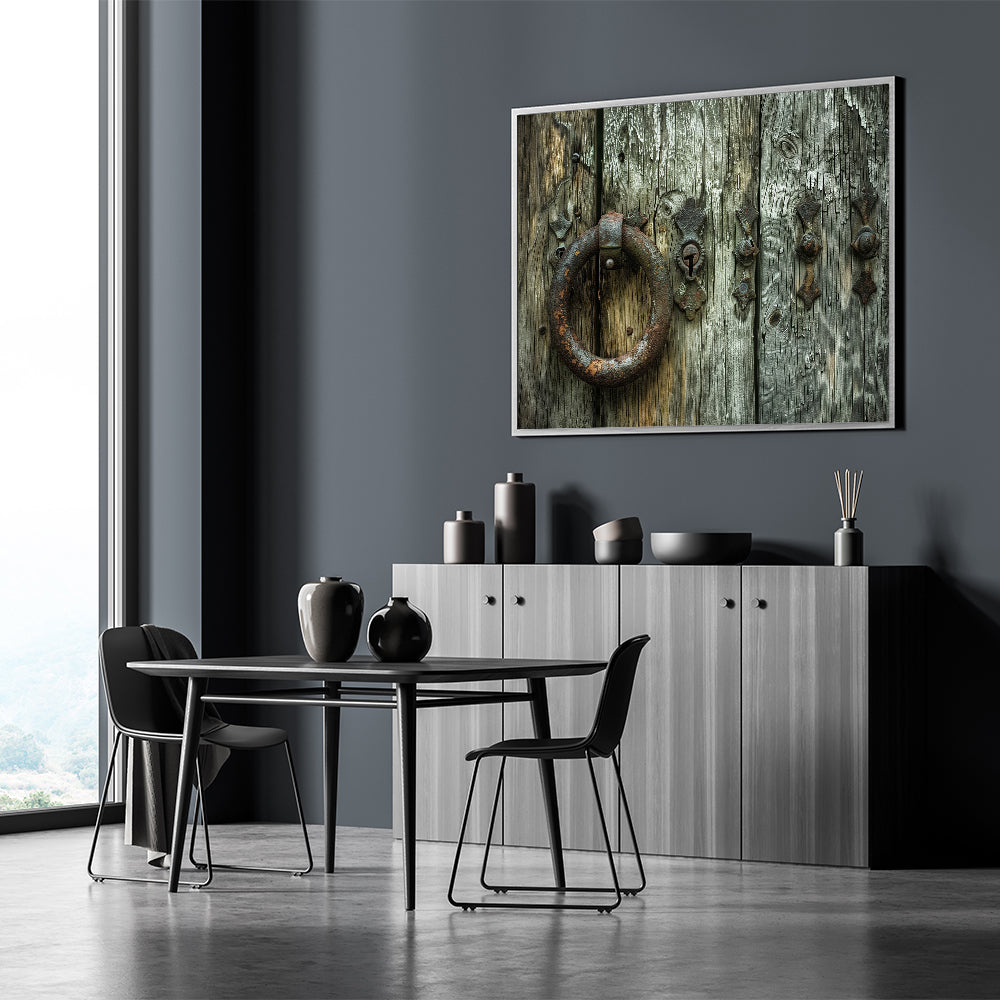 Bring a touch of rustic charm and vintage appeal to your space with this captivating hardware wall art. This piece features a weathered wooden door adorned with a large iron ring, aged to perfection, along with intricate iron details. The textured wood and rusted metal elements create a stunning contrast, making this artwork a perfect addition to any room with a rustic, industrial, or vintage theme.