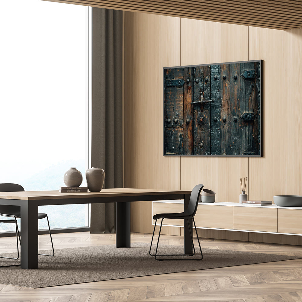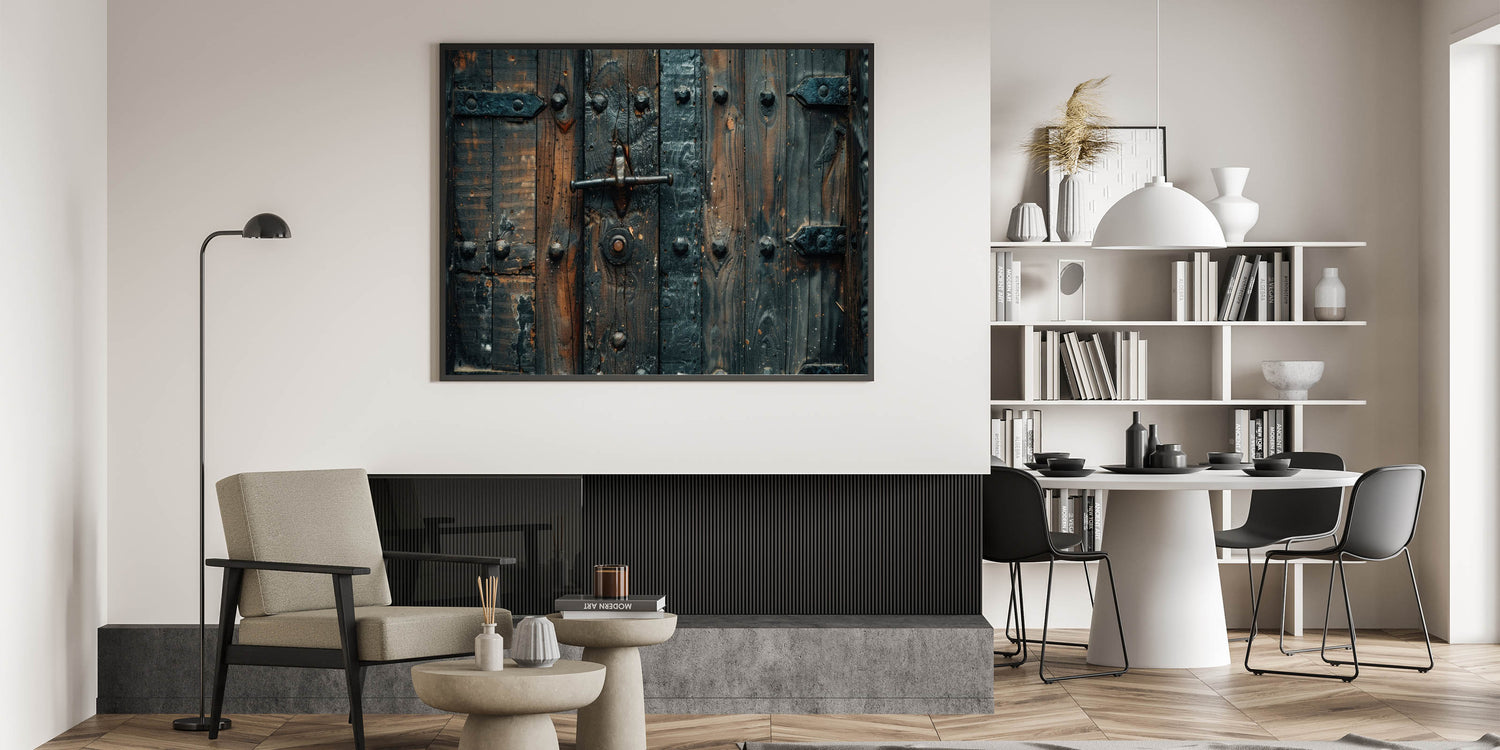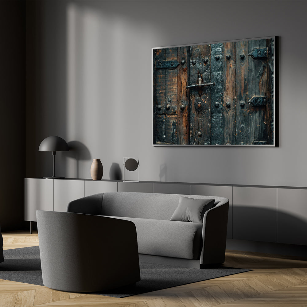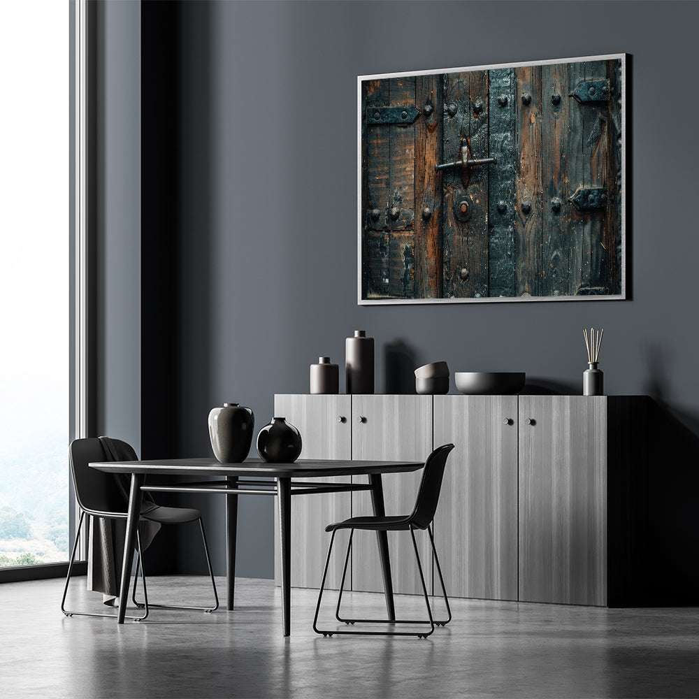 Elevate your home decor with this striking industrial hardware wall art. Featuring a rugged, rustic iron door handle set against a weathered wooden door, this artwork captures the essence of industrial design. The distressed textures of the wood and the aged metal create a powerful visual impact, making this piece perfect for spaces that embrace a vintage, industrial, or rustic theme.
