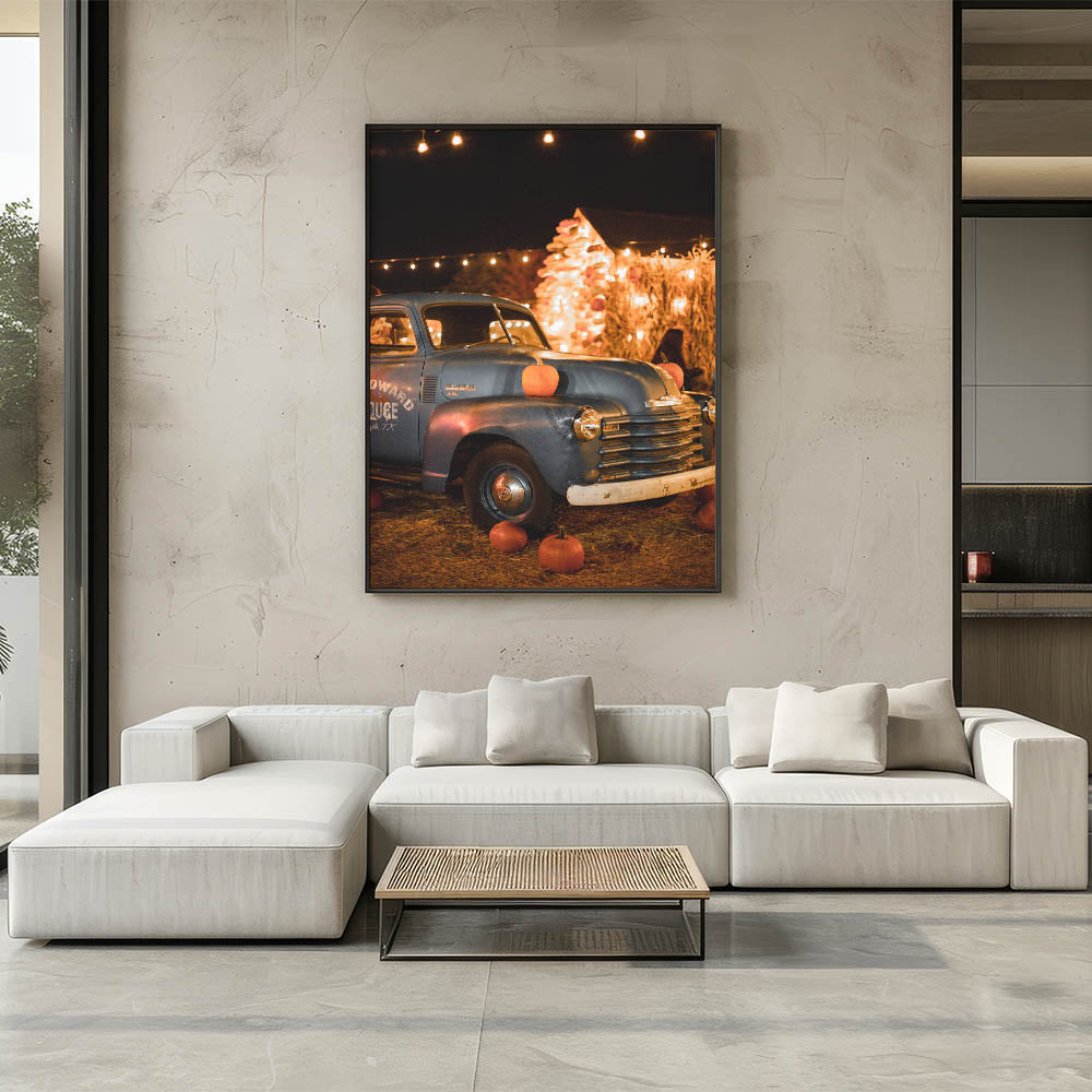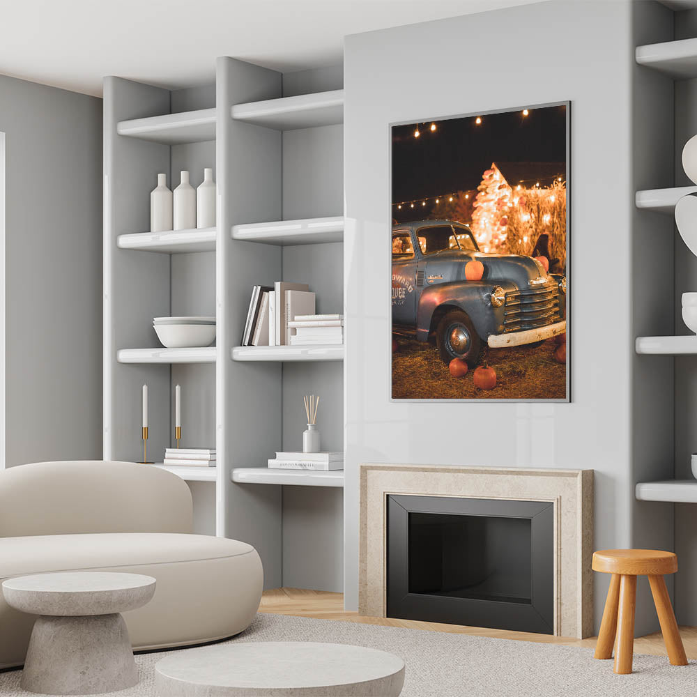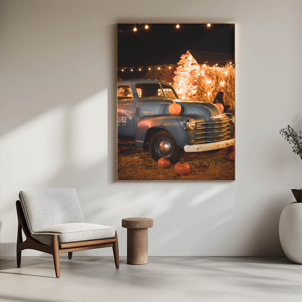 Capture the nostalgia of autumn with this charming fall wall decor, featuring a vintage blue truck adorned with pumpkins under warm festival lights. The blend of rustic textures, golden lights, and harvest-inspired elements creates a cozy and inviting ambiance. This autumn canvas art is perfect for those who love classic fall aesthetics, country charm, and seasonal warmth.