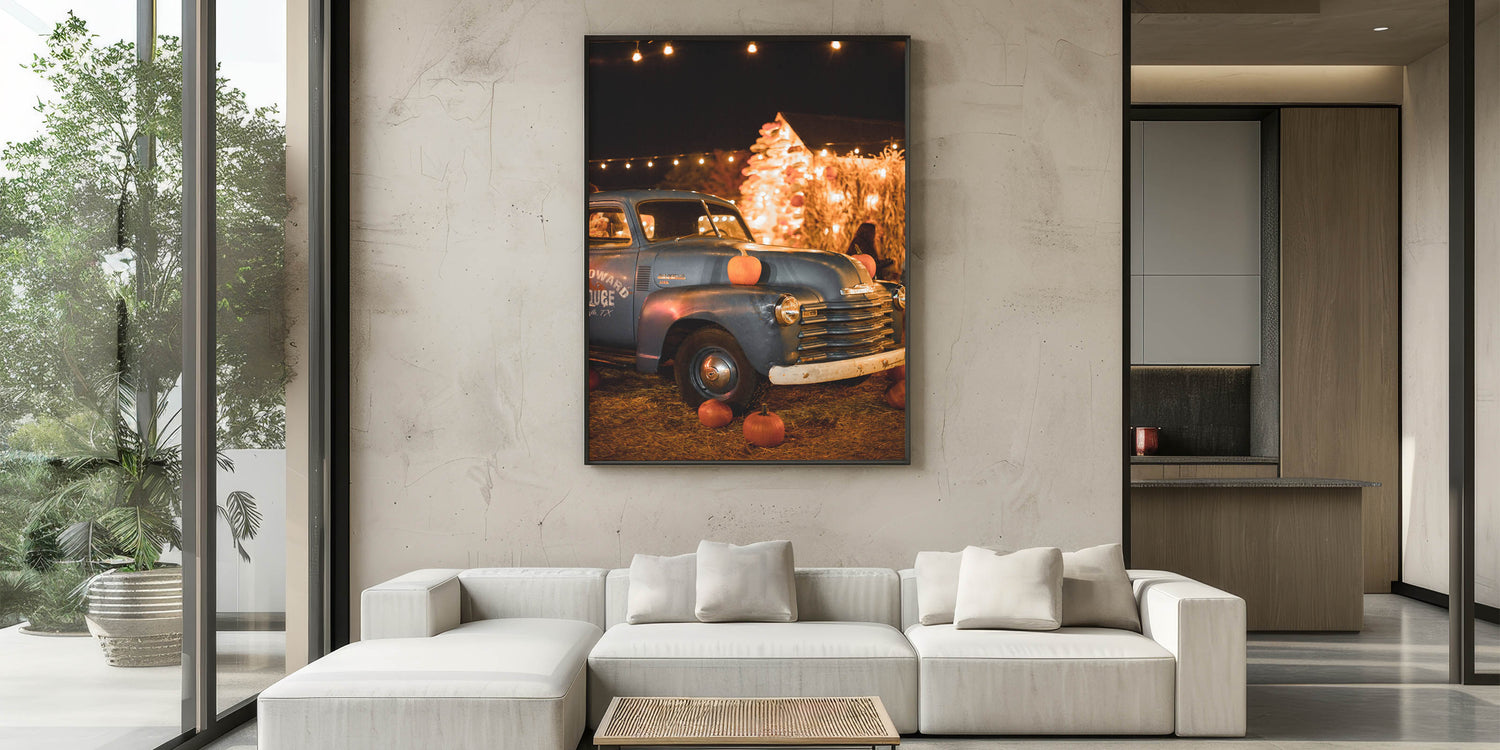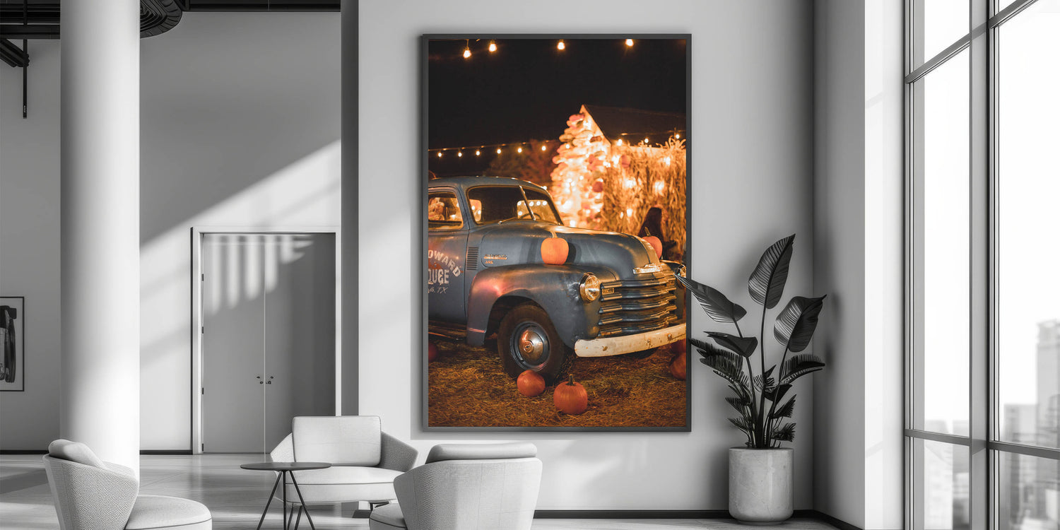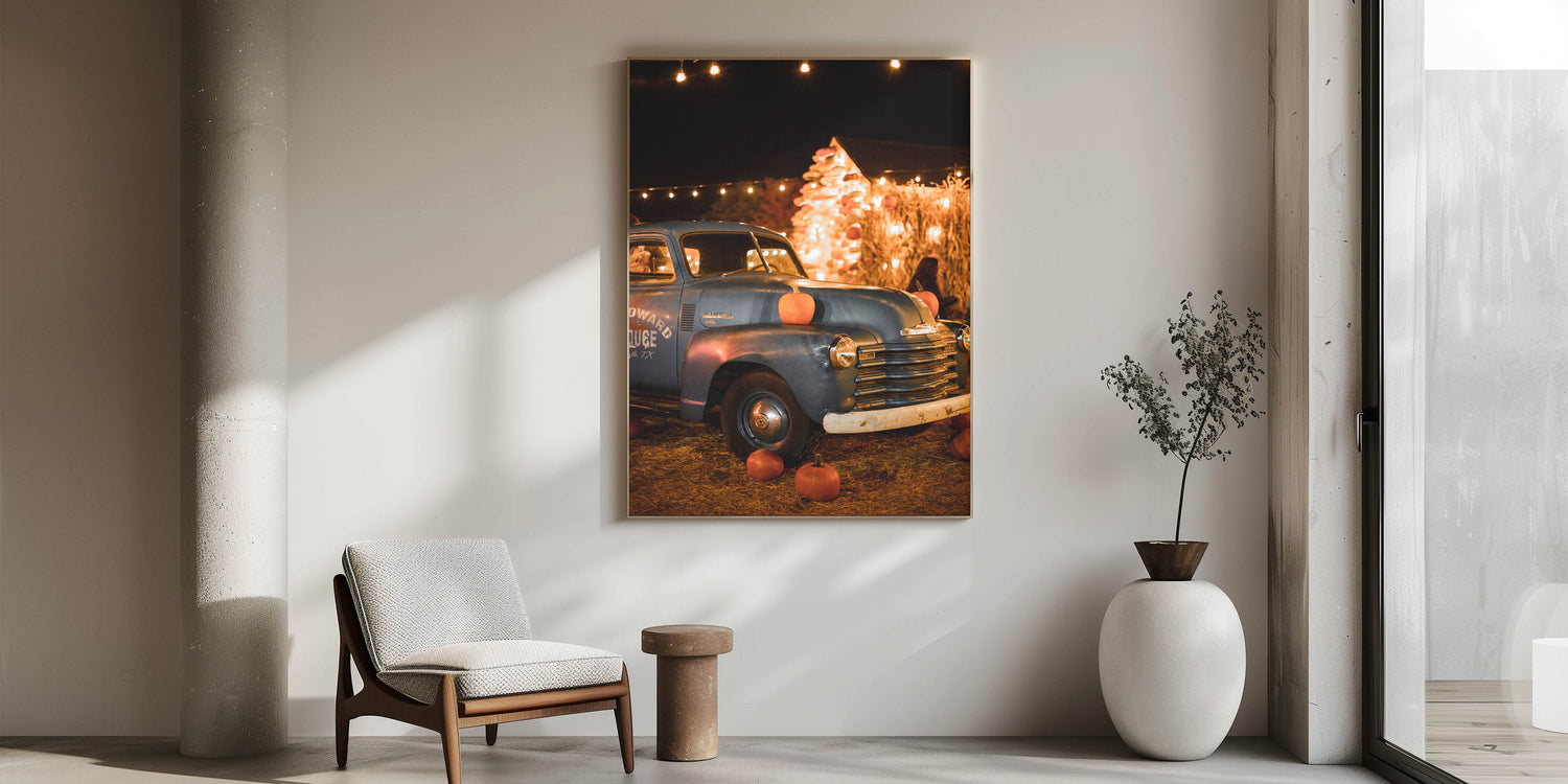 Capture the nostalgia of autumn with this charming fall wall decor, featuring a vintage blue truck adorned with pumpkins under warm festival lights. The blend of rustic textures, golden lights, and harvest-inspired elements creates a cozy and inviting ambiance. This autumn canvas art is perfect for those who love classic fall aesthetics, country charm, and seasonal warmth.