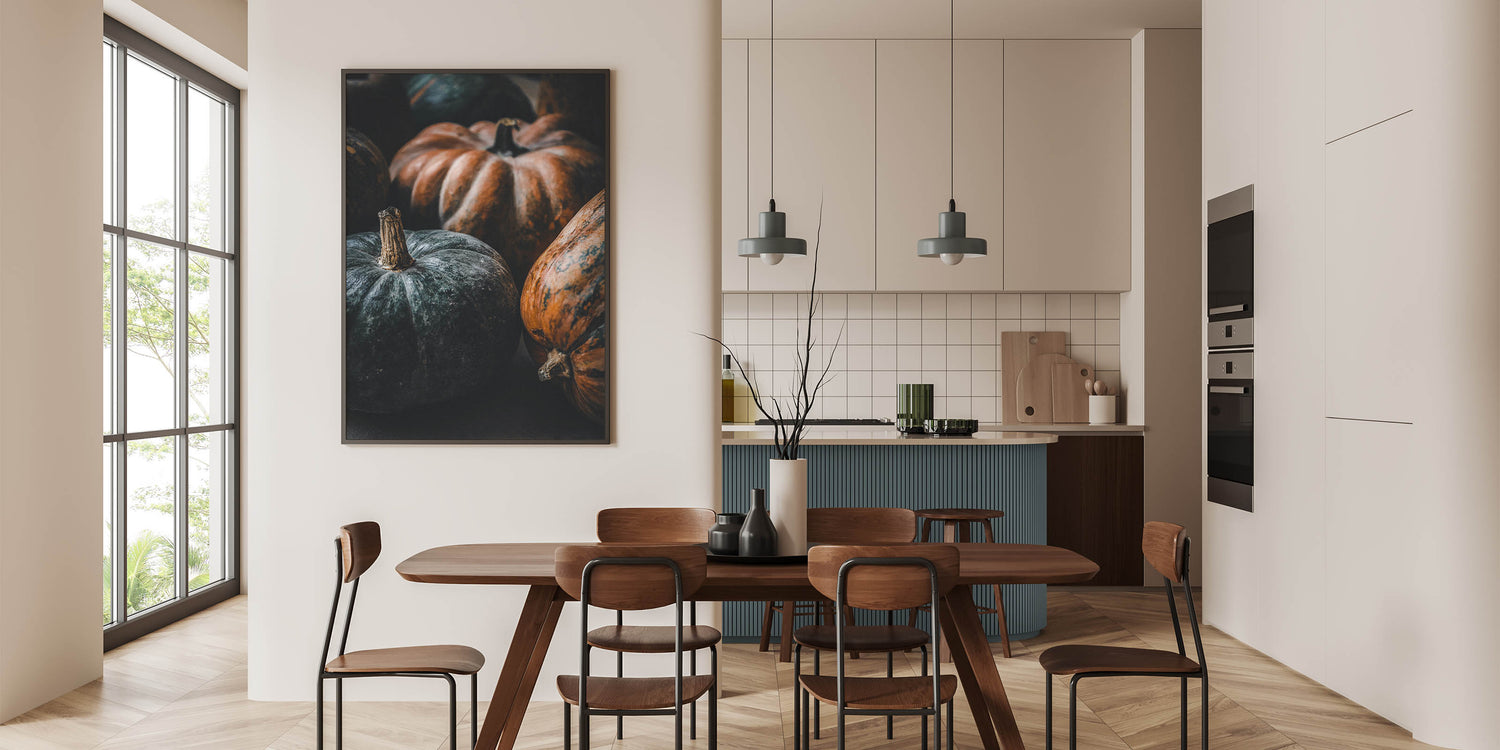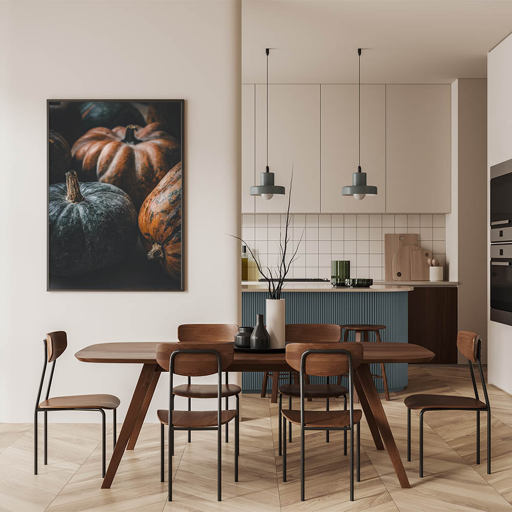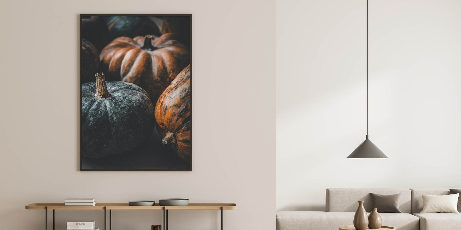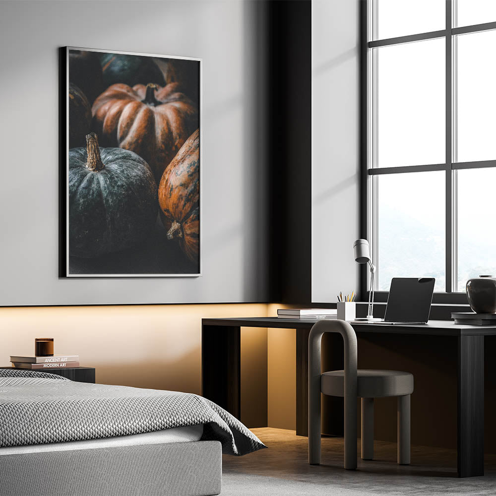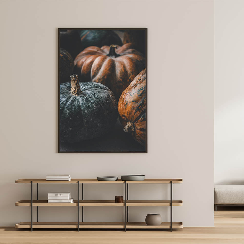 Celebrate the rustic charm of autumn with this Fall Wall Art, featuring a stunning composition of textured pumpkins in deep green and warm orange hues. The moody lighting and organic tones of this Autumn Wall Art create a cozy, harvest-inspired atmosphere, making it a perfect addition to seasonal décor.
