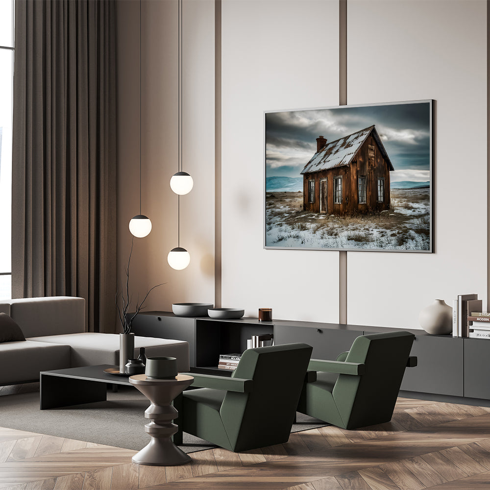 This artwork evokes a sense of solitude and timelessness, making it a captivating focal point in any room. Whether you place it in your living room, study, or bedroom, this haunting image of an abandoned winter cabin will draw attention and spark conversation. Perfect for fans of rustic decor, vintage architecture, and winter scenes, this piece is sure to add character and depth to any space.