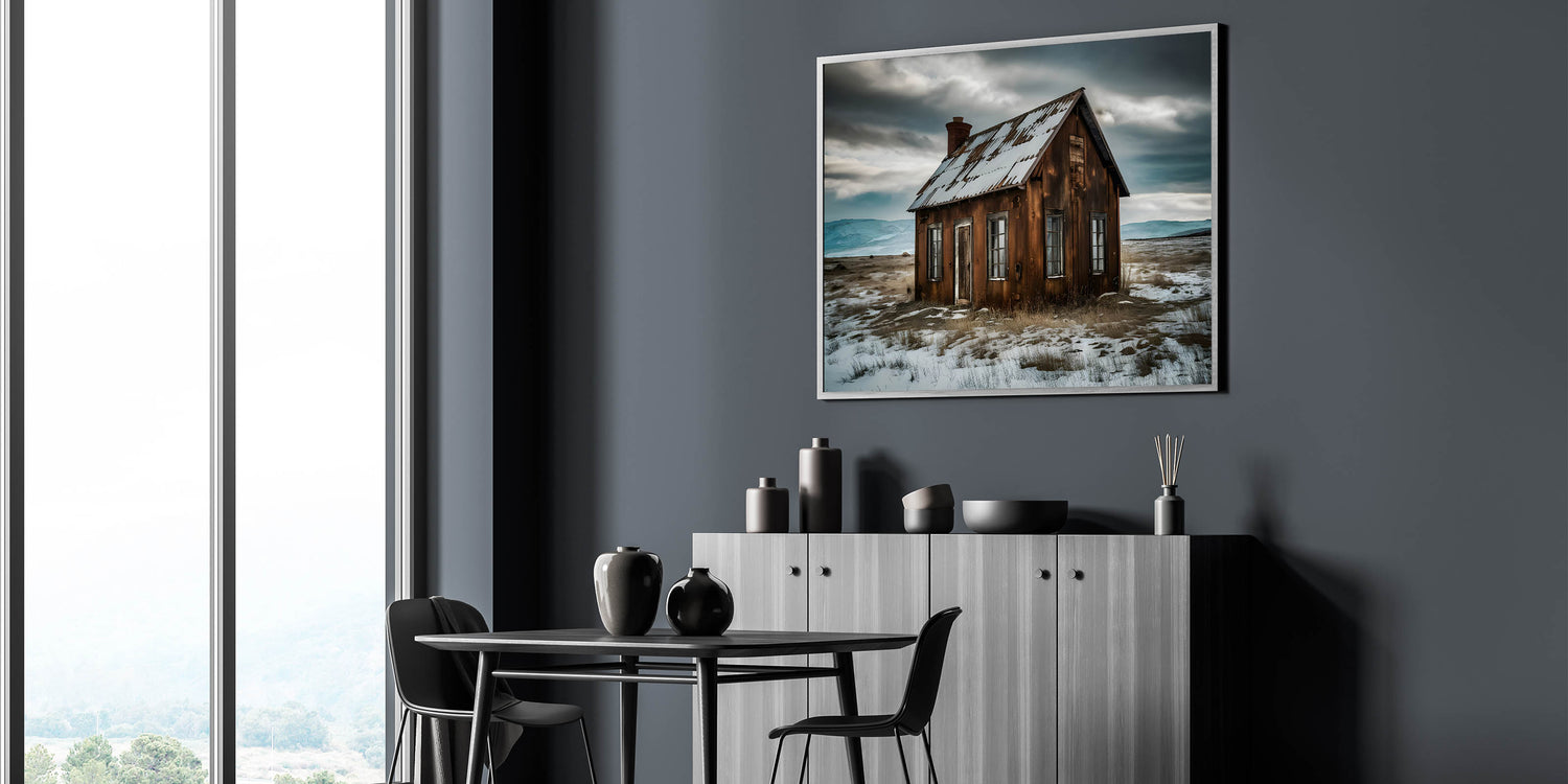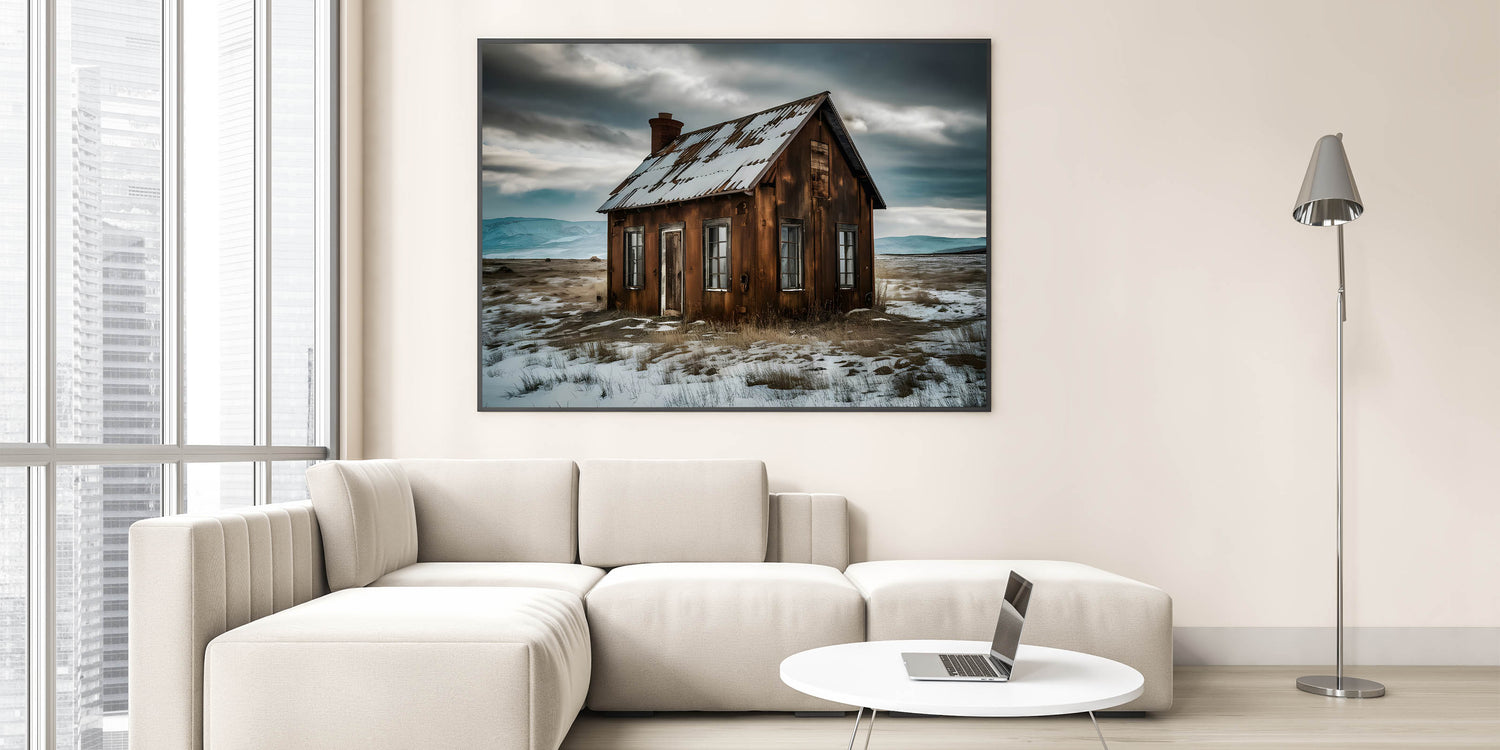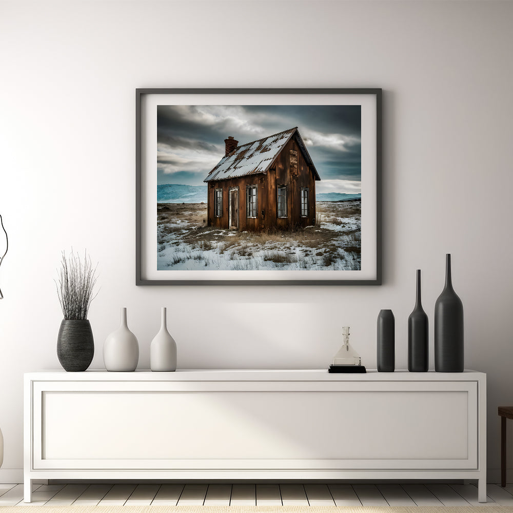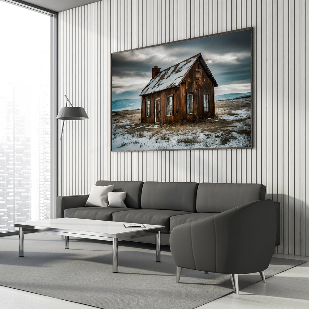Enhance your decor with this striking piece of rustic winter cabin art, featuring an abandoned house set against a desolate snowy wilderness. The weathered wood and rusted metal of the cabin contrast beautifully with the cold, barren landscape, creating a scene that is both haunting and serene. Perfect for those who appreciate the rugged beauty of derelict architecture and the quiet stillness of winter.
