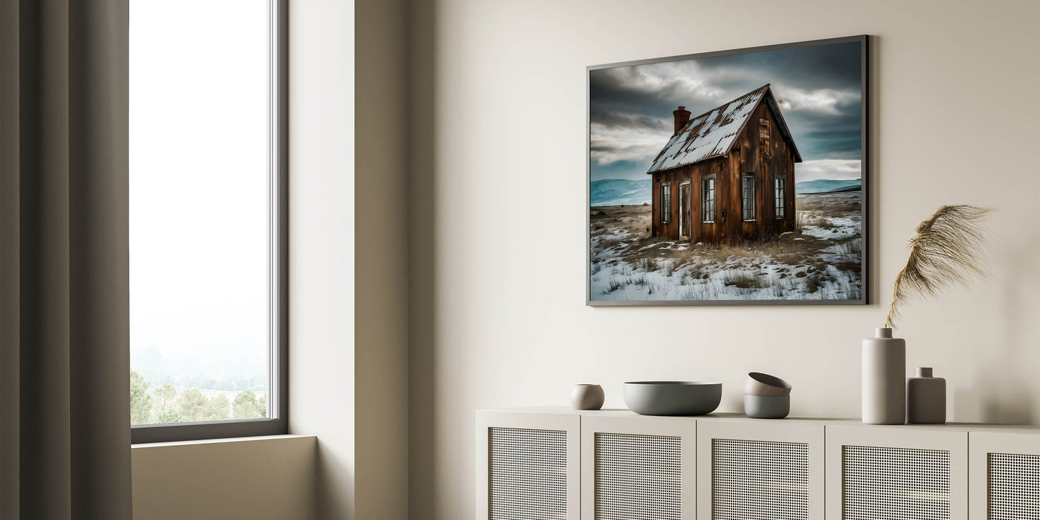 - High-definition printing that captures every detail of the weathered cabin and the snow-covered landscape.
